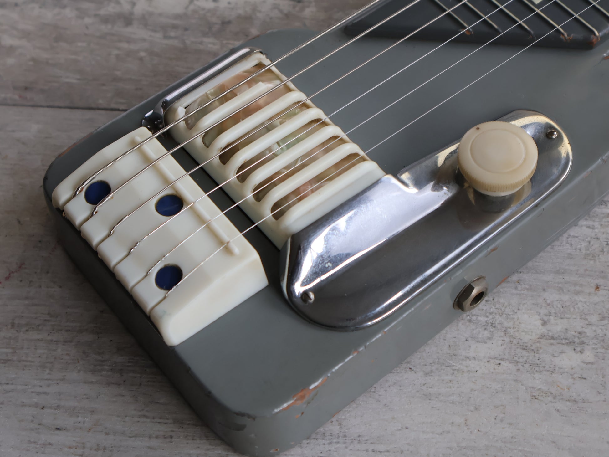 A very vibey 6-string lap steel from Teisco made in the 1960's. Restrung and tuned to open G, fully functional electronics and sounds great!