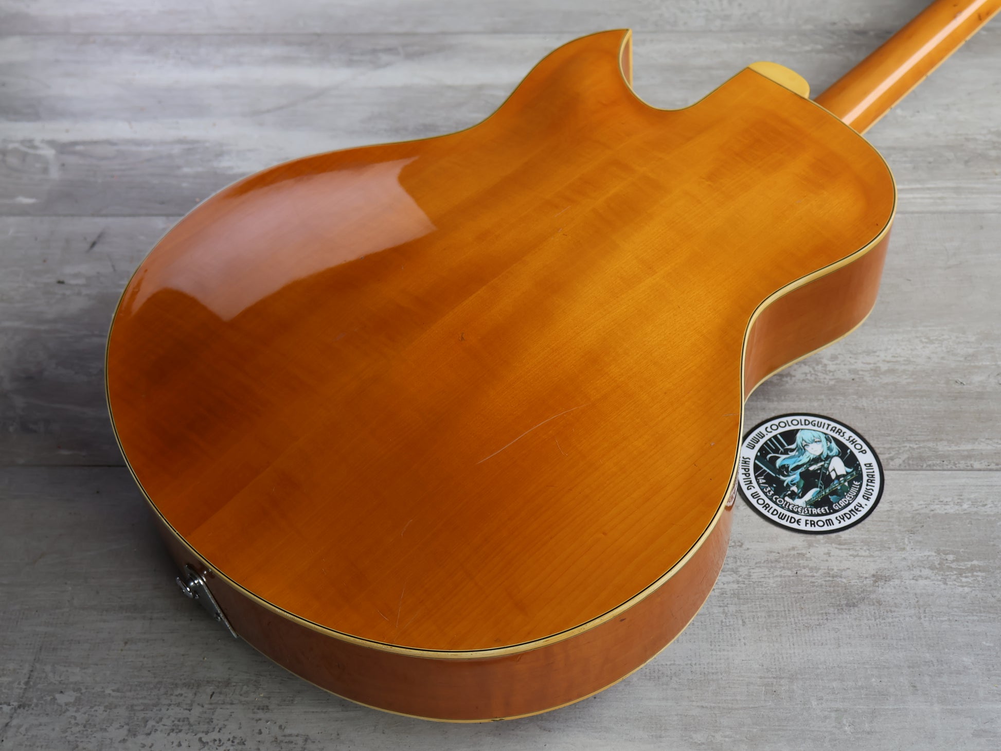 Made in Japan in the late 1960's, the Yamaha AE11 was a full hollowbody jazzbox with a loud, vibrant tone. Double bound maple body (85mm depth) with a spruce top, maple neck and a 22 fret rosewood fingerboard (628mm scale length with a zero-fret, 13.75" radius), it weighs 3kg's. Appears to be all original except for an upgraded bridge with Yamaha branded tuners, humbuckers and tailpiece.