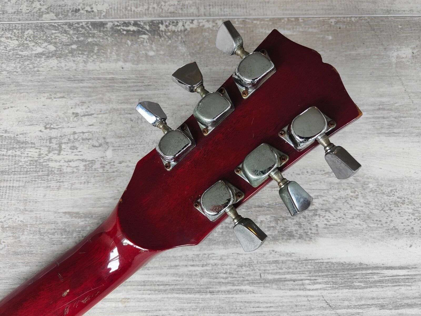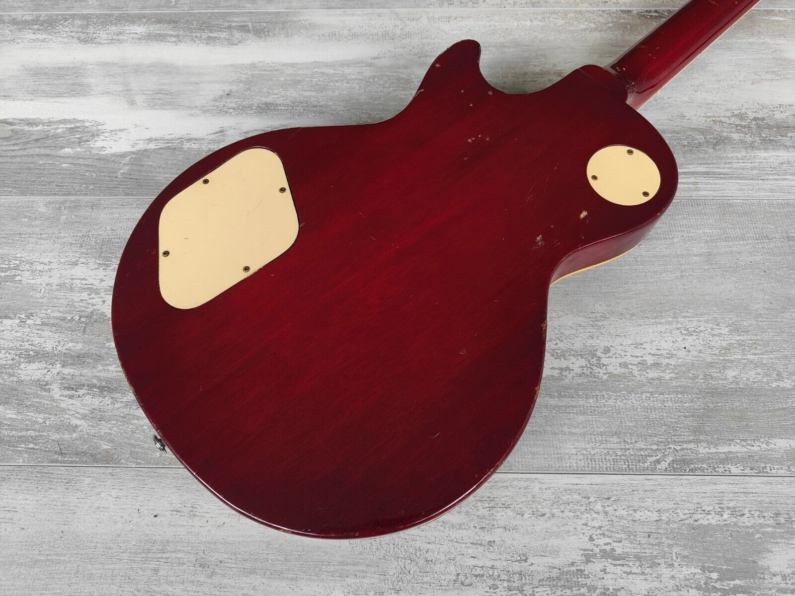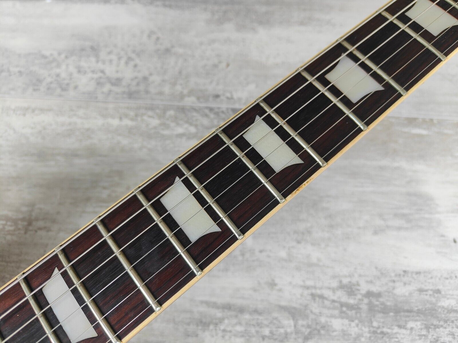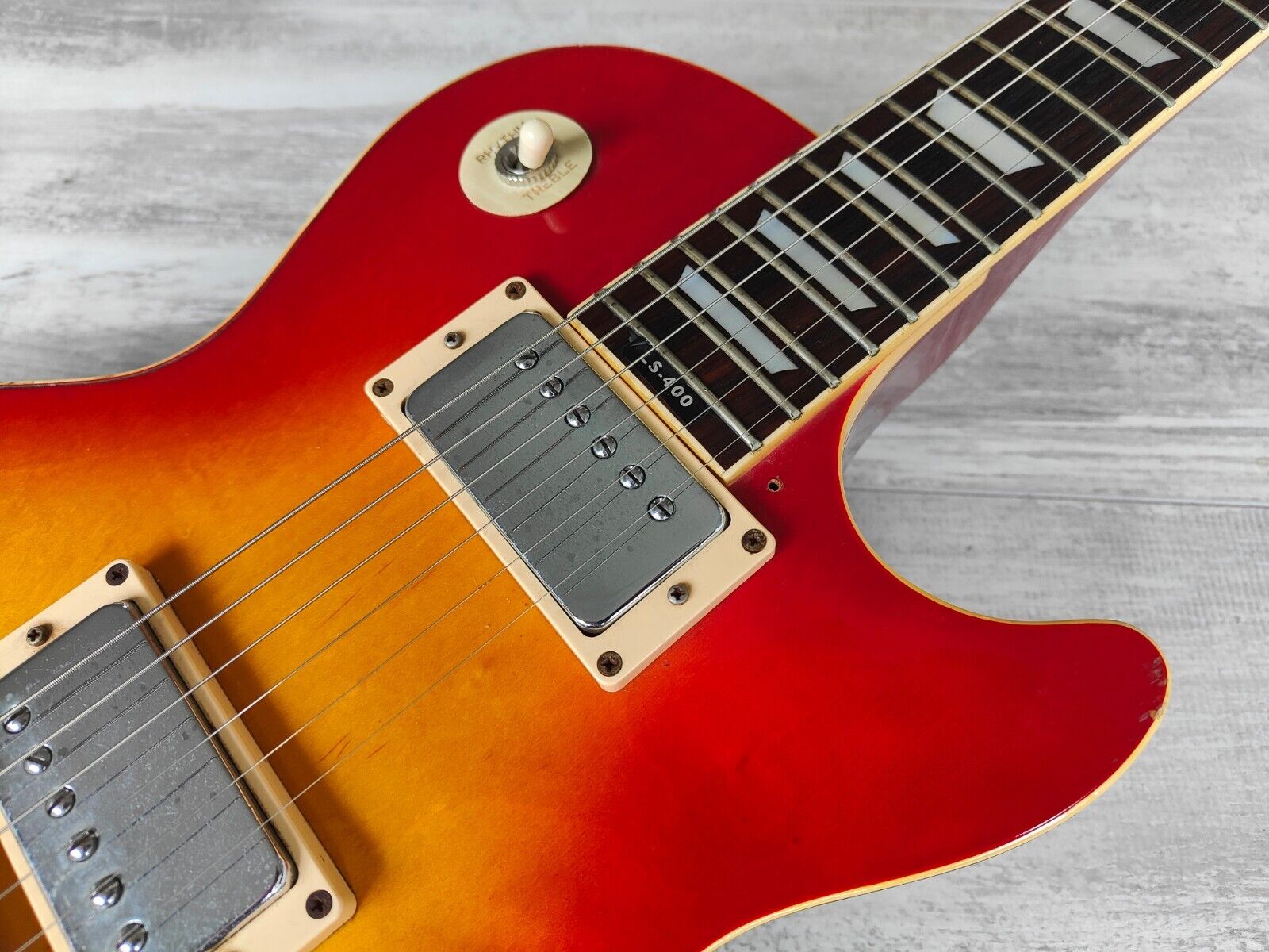 A late 70's model LS-400 from Aria Pro II built by the famous Matsumoku factory. Maple top, mahogany body, slim mahogany neck and a 22 fret rosewood fingerboard, it weighs a comfortable 4kg's. Looks to be all original with the exception of a new switch and output jack along with possibly the strap buttons.