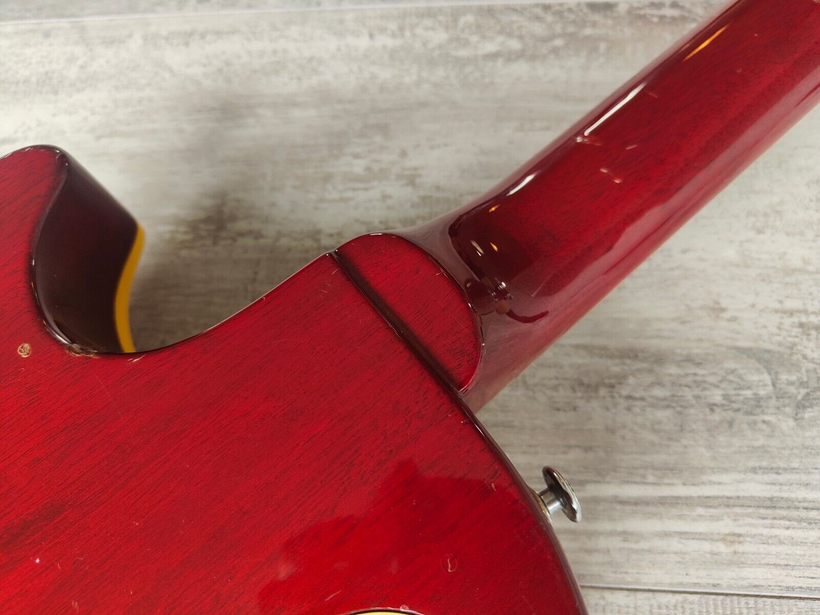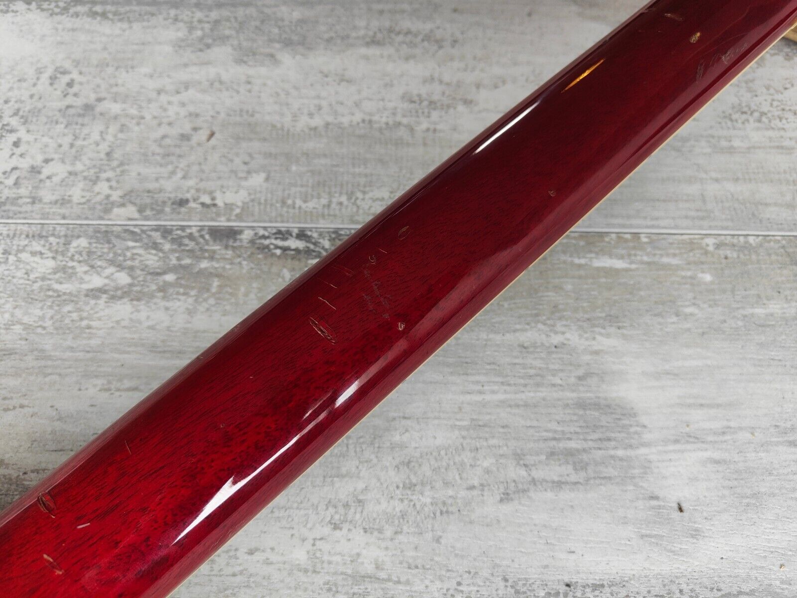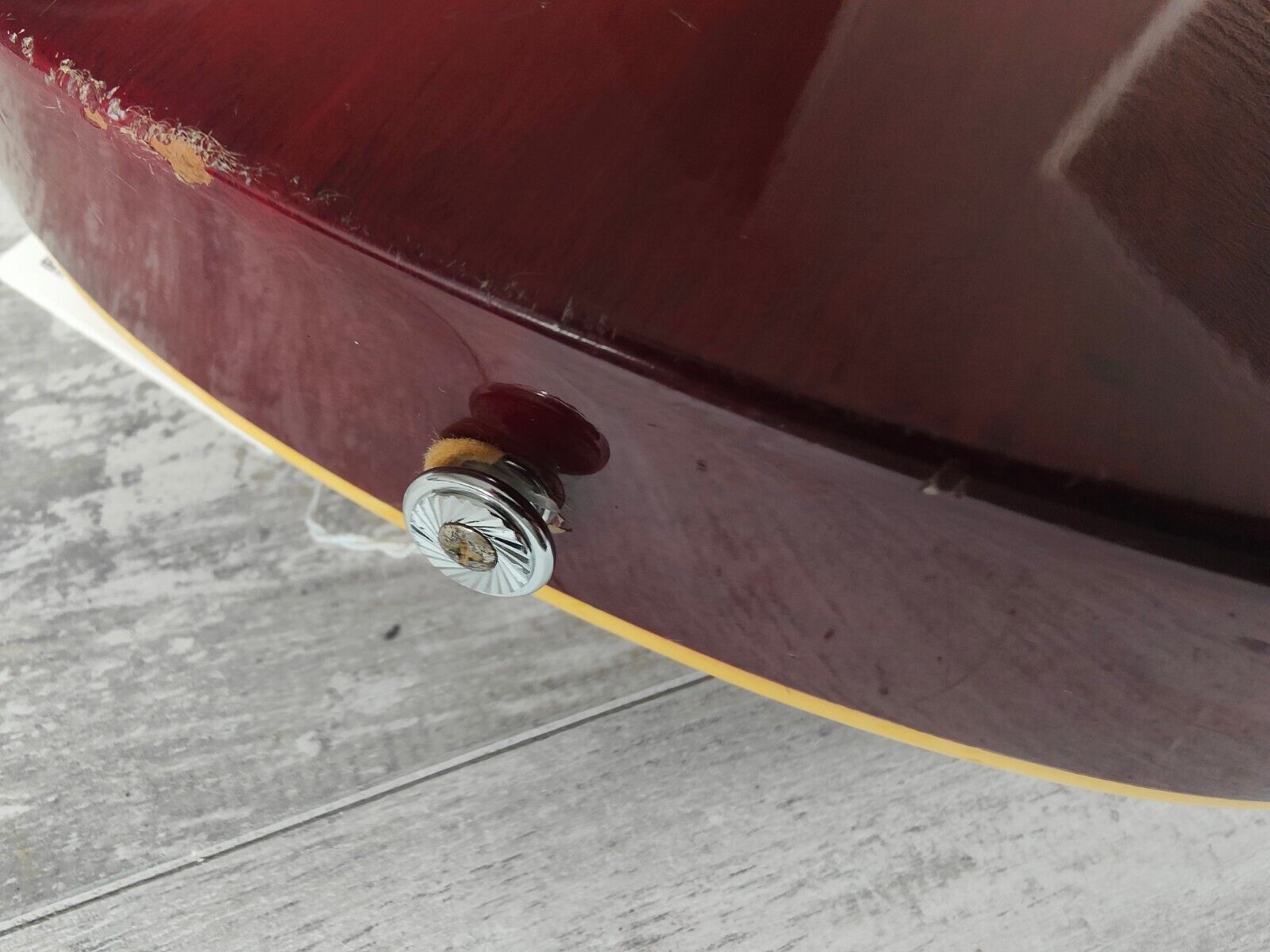 The frets are shiny with plenty of life and the fretboard was oiled prior to listing. Truss is working well and the neck is straight, hardware is nice and shiny and the tuners keep tune well. The top has some slight shrinking at the binding that has been drop filled with some glue to fill the gap a little, structurally it's rock solid.