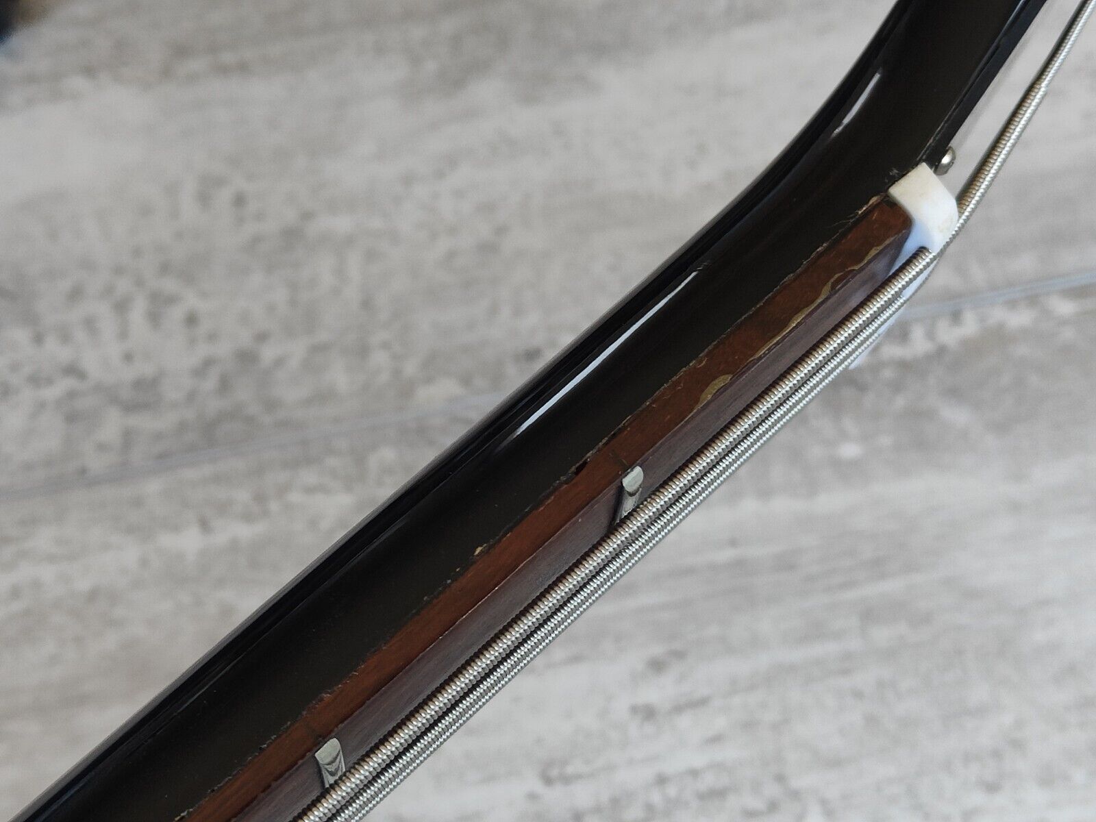 Good vintage condition as pictured standard signs of cosmetic wear and tear, given a full professional setup/service prior to listing. Frets are shiny and the truss adjusts as it should, the neck is straight and plays nicely. Has had a recent partial fretboard re-glue as pictured along with some new pots and a partial fret level.
