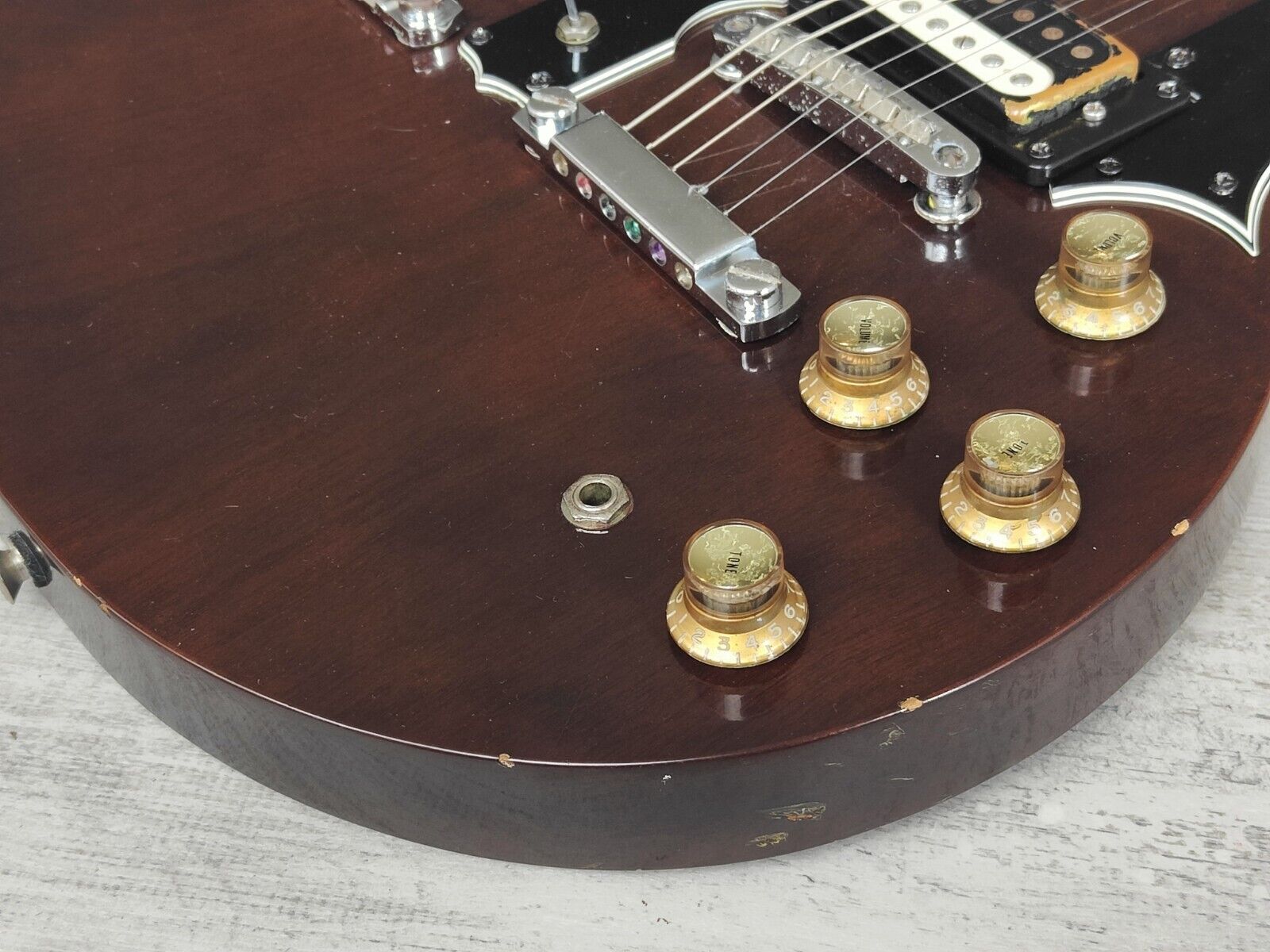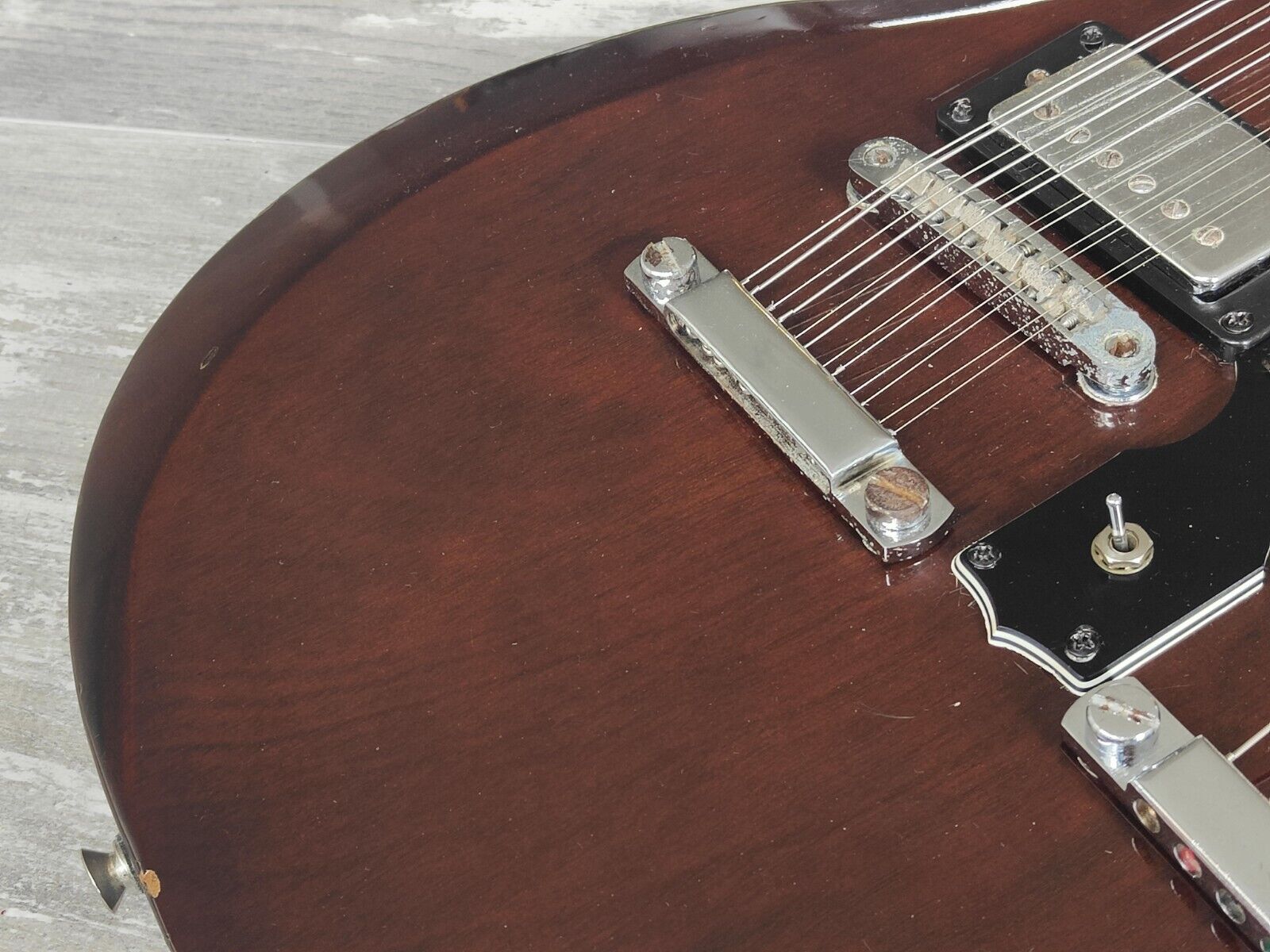 Good vintage condition for it's age, it's definitely been played and has some light natural relic on the body and neck along with some patina on the hardware. Frets are high and shiny with plenty of life and the truss's adjust as they should, both necks are straight. Seems all original with the exception of some Gibson Deluxe tuners on the 6 string side.