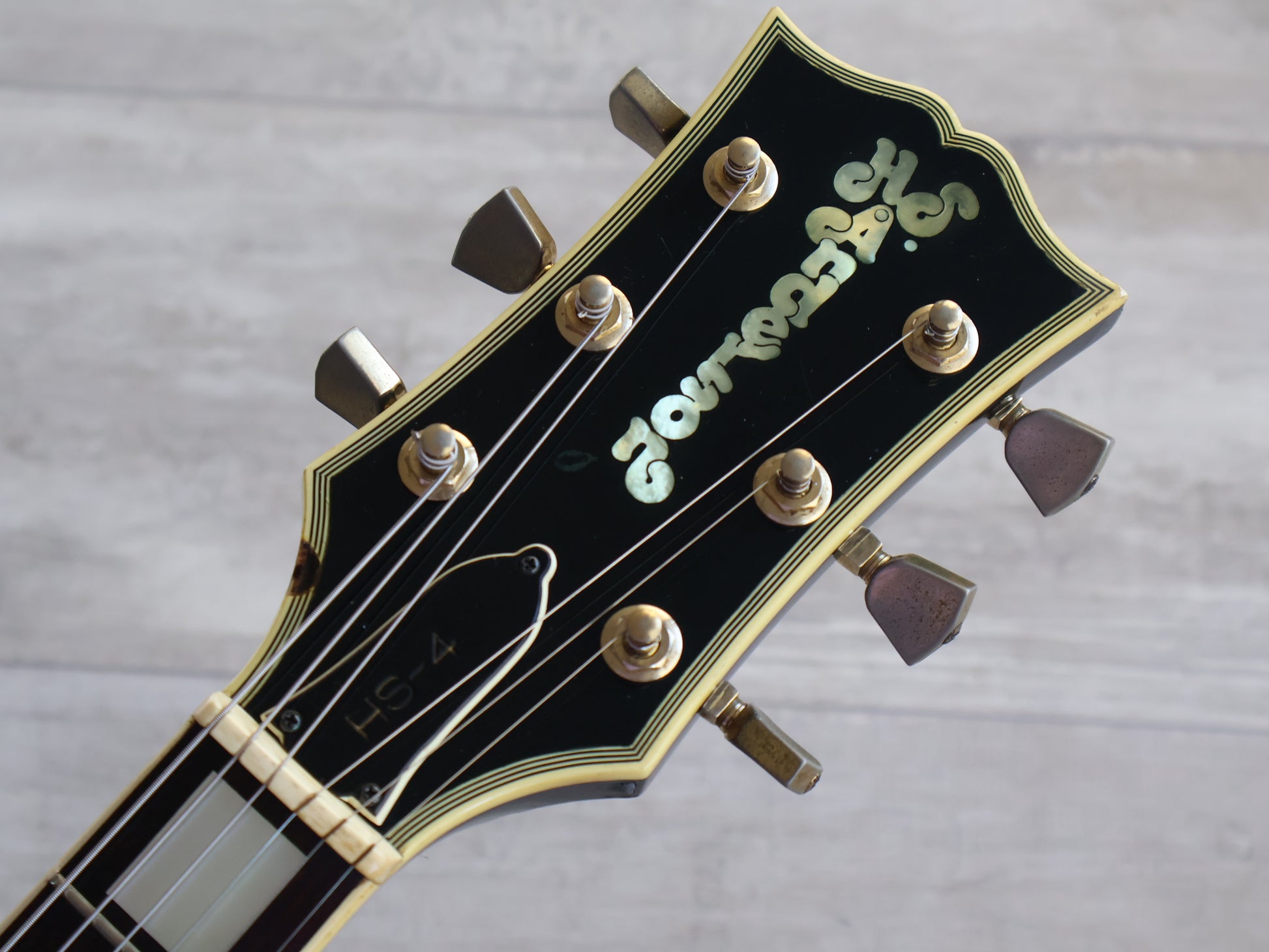 Highly collectable and desirable models from the early 1970's, the HS Anderson HS-4 was one of the most professional Les Paul Custom models to come out of Japan in 1973. Solid mahogany body, a slim 60's profile mahogany neck with a nice pronounced volute, dark rosewood fingerboard (43mm nut width, 628mm scale length), it weighs 4.1kg's. This one appears to be all original except for the missing pickguard.