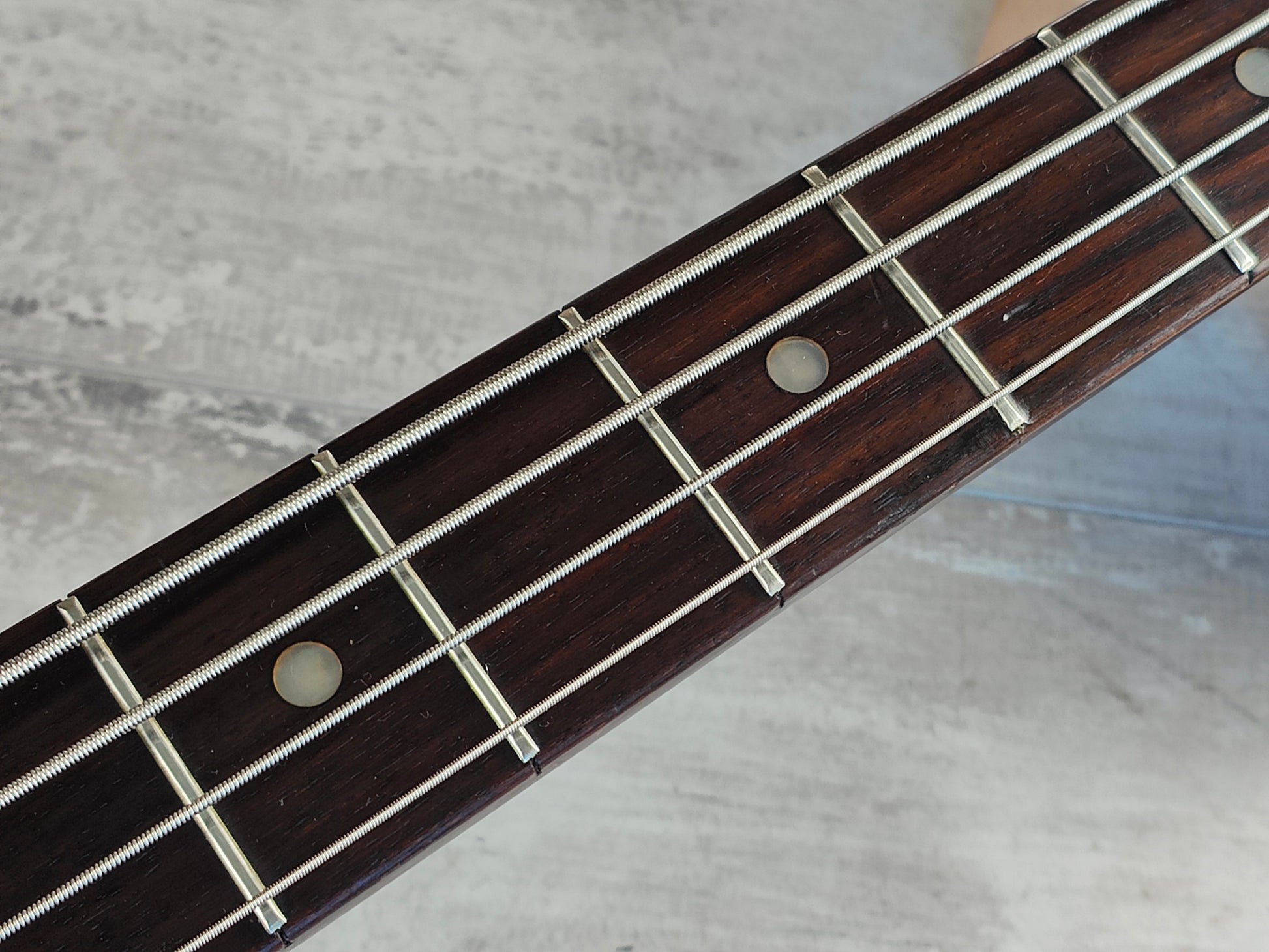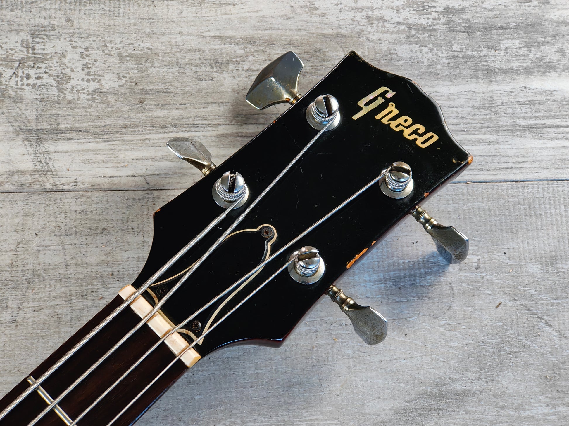 Made in Japan in 1974, the EB420 was the Greco model that aimed at replicating Gibson's SG bass design. Mahogany body with a maple neck and 20 fret rosewood fingerboard (34" scale length, 43mm nut width), it weighs 3.9kg's. Loaded with a pair of Maxon made Gibson style pickups replicating a mini-humbucker and a Mudbucker controlled by a three-way toggle and volume/tone knobs.
