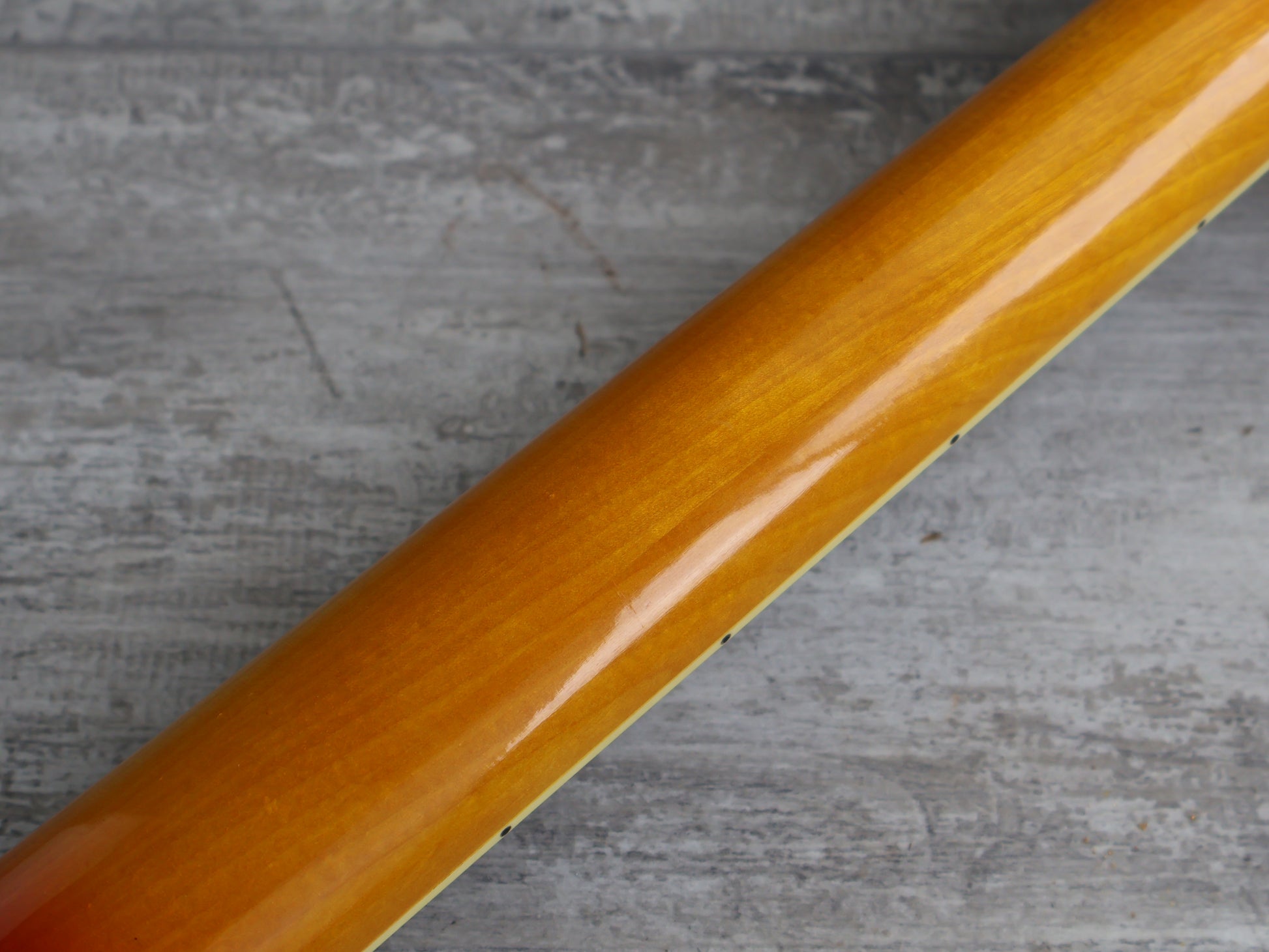 The first set-neck Les Paul model from Greco, the EG-650 was their flagship guitar in the early years. Pancake mahogany body with a belly cutaway on the back, two-piece top with a flame laminate, slim mahogany neck with a 22 fret rosewood fingerboard, weighs 3.9kg's.