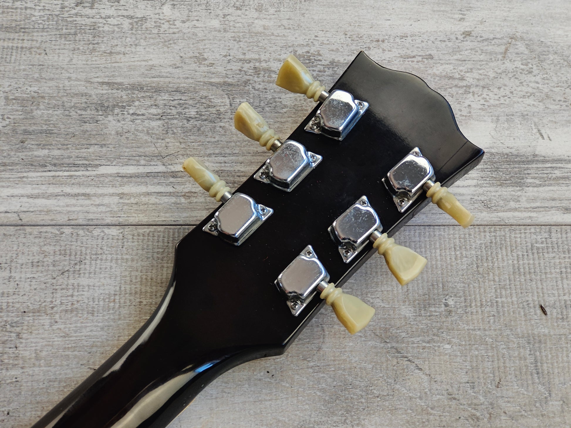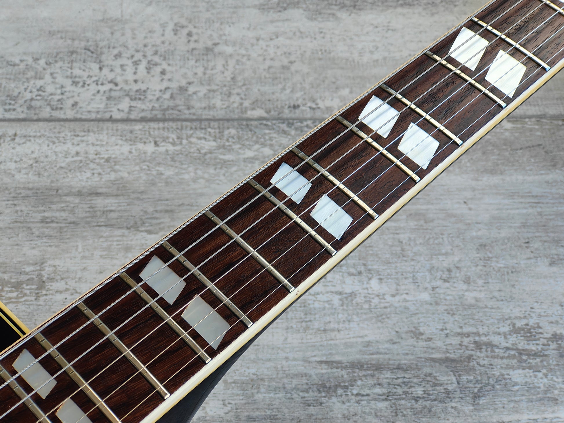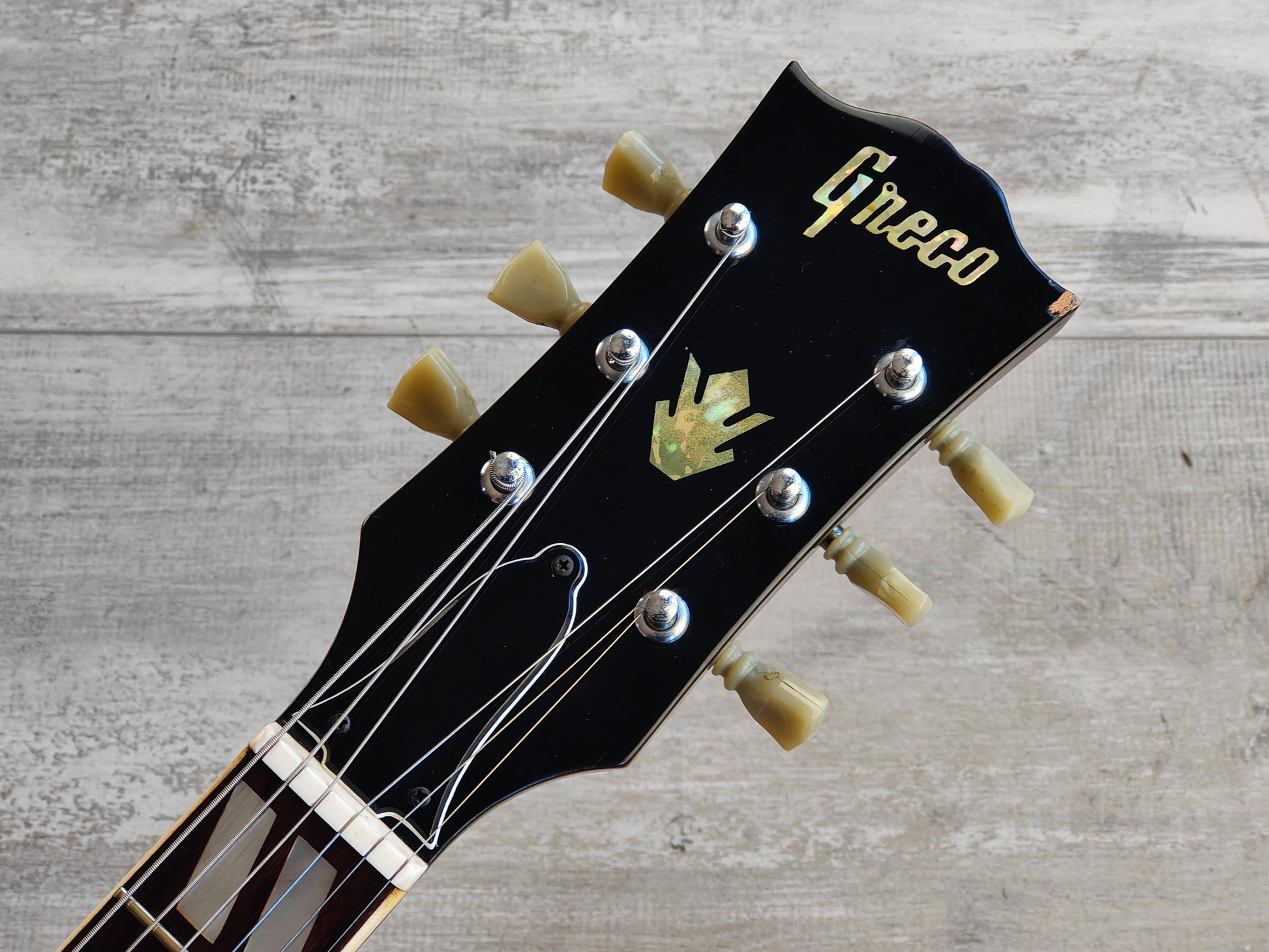 Made in Japan in 1974, the Greco S-50 was their Gibson ES-175 replica. Fully hollowbody construction with a 85mm deep body set to a slim 60's profile neck and a 20 fret rosewood fingerboard (41mm nut width, 628mm scale length), it weighs 3kg's.