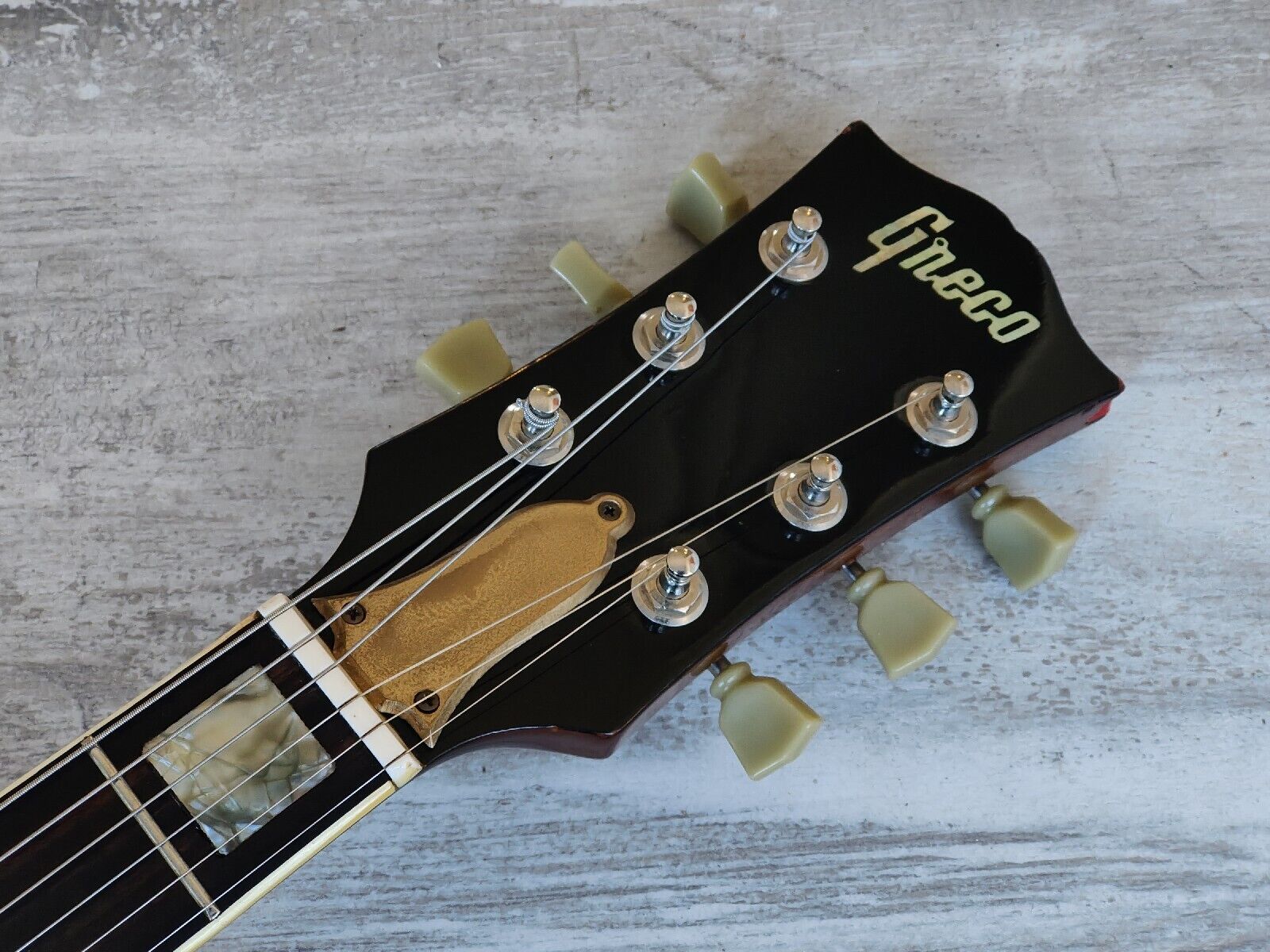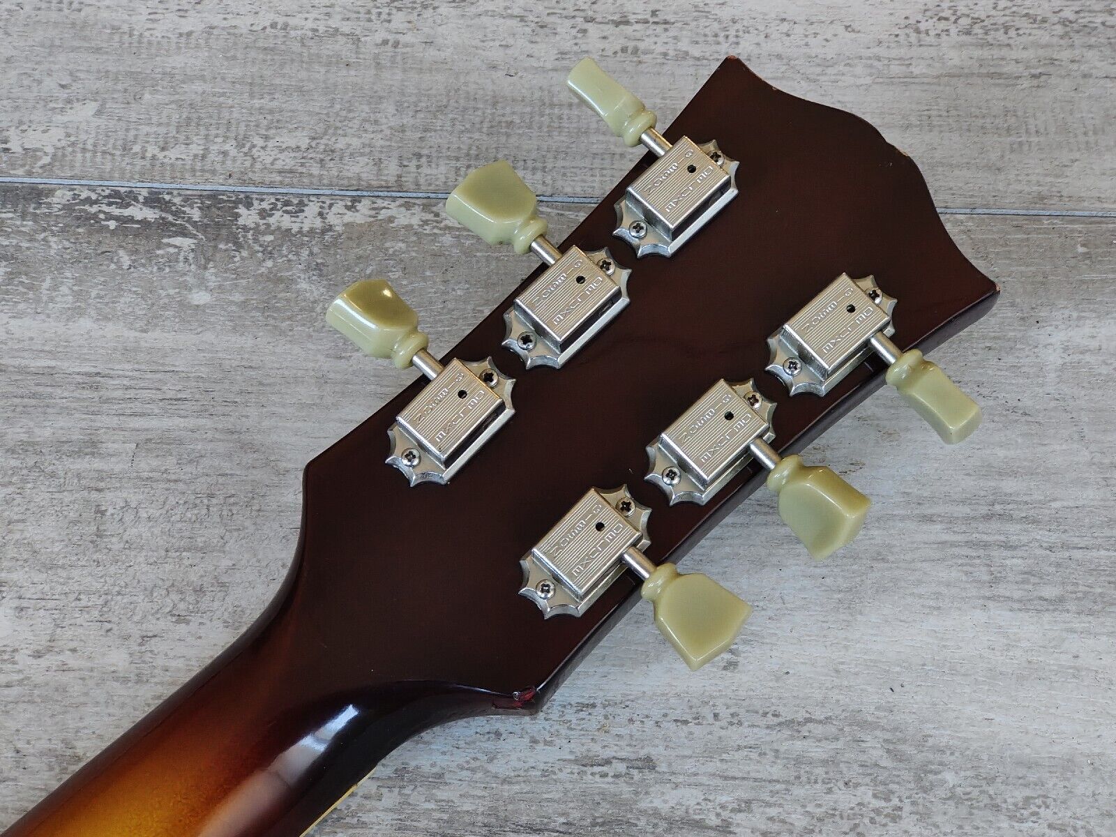 This one has the original Maxon humbuckers with an aftermarket coil split mini toggle for the bridge pickup along with a replaced Bigsby tailpiece that's been partially painted matte gold (along with the pickup rings and pickguard) and some upgraded Gibson Deluxe tuners.