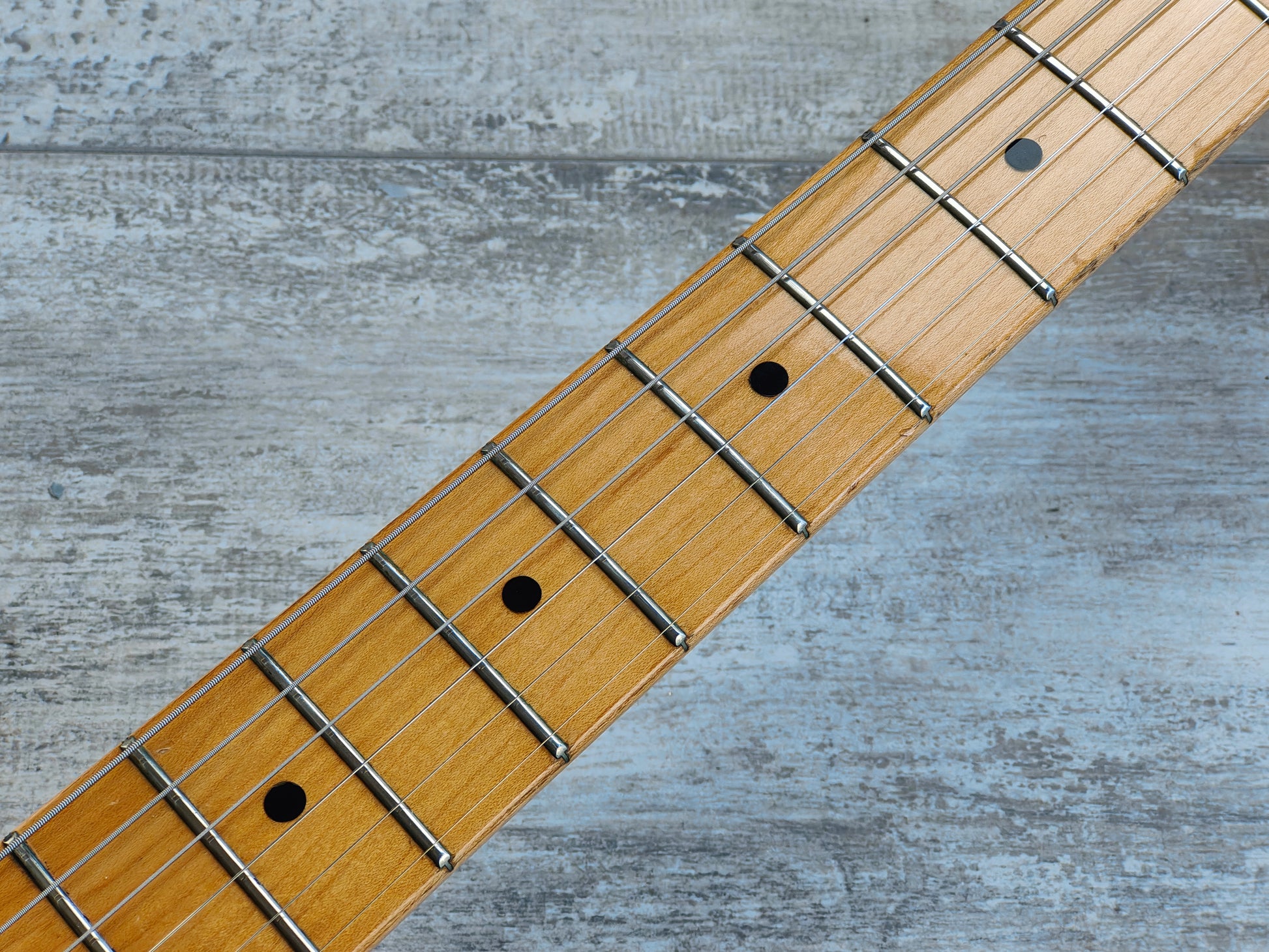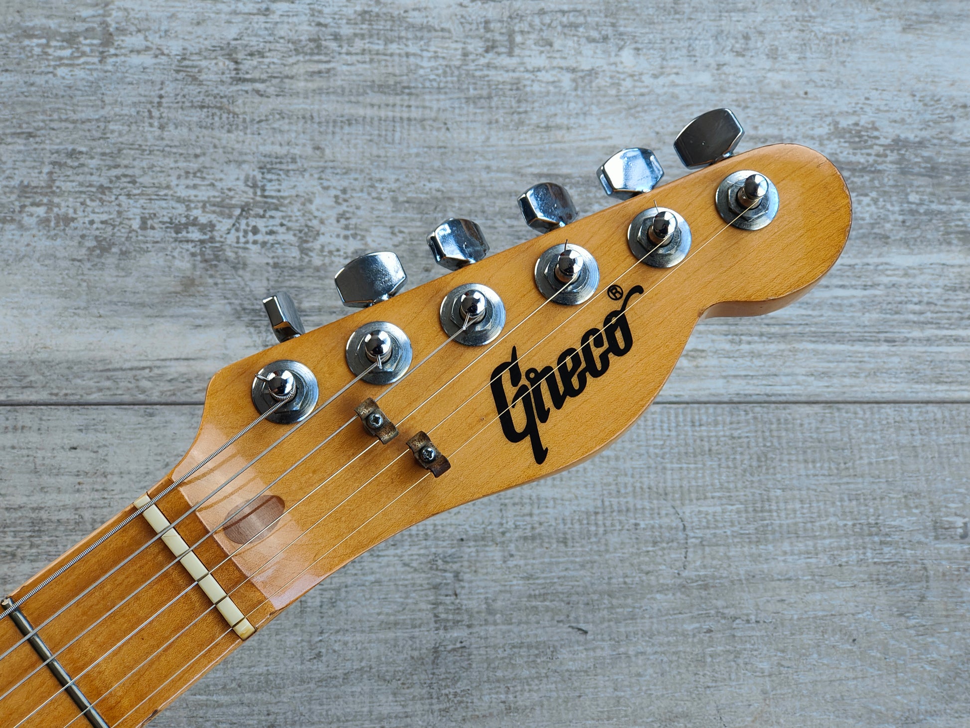 Made in Japan in 1974, the TE-500 was Greco's Thinline Telecaster Deluxe model. The original catalog lists these as featuring a semi-hollow white-ash body with a maple neck and a 21 fret maple fingerboard (42mm nut width, 628mm scale length), it weighs 3.6kg's.