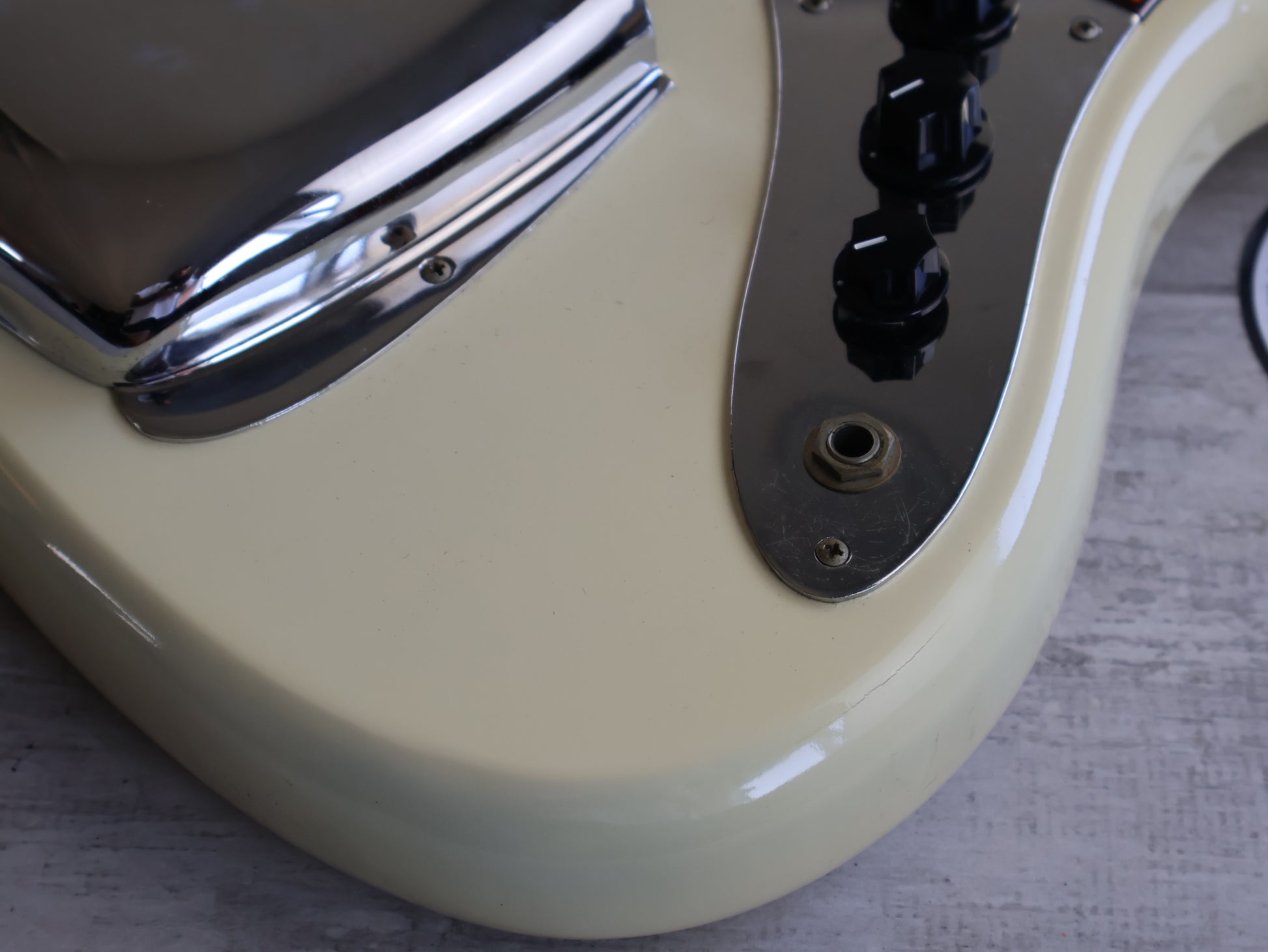 Japanese made by Fernandes in 1975, this FJB-50 came to us from a professional player who has it loaded with flatwounds and a foam mute mounted on the bridge cover (easily removable) to give it a beautifully vintage and rounded bass tone. Gloss vintage white finish on the body with a maple neck/fingerboard wearing black block inlays and binding (7.25" radius, 38mm nut width), it weighs 4.6kg's. Appears all original including both pickup and bridge covers and the rosewood thumb rest.