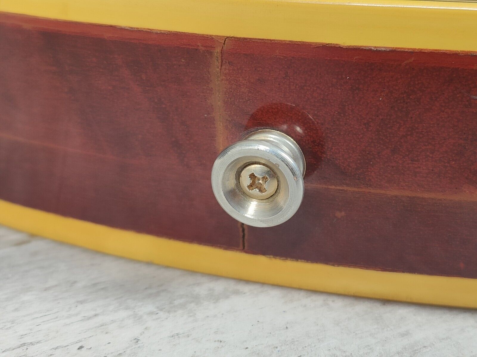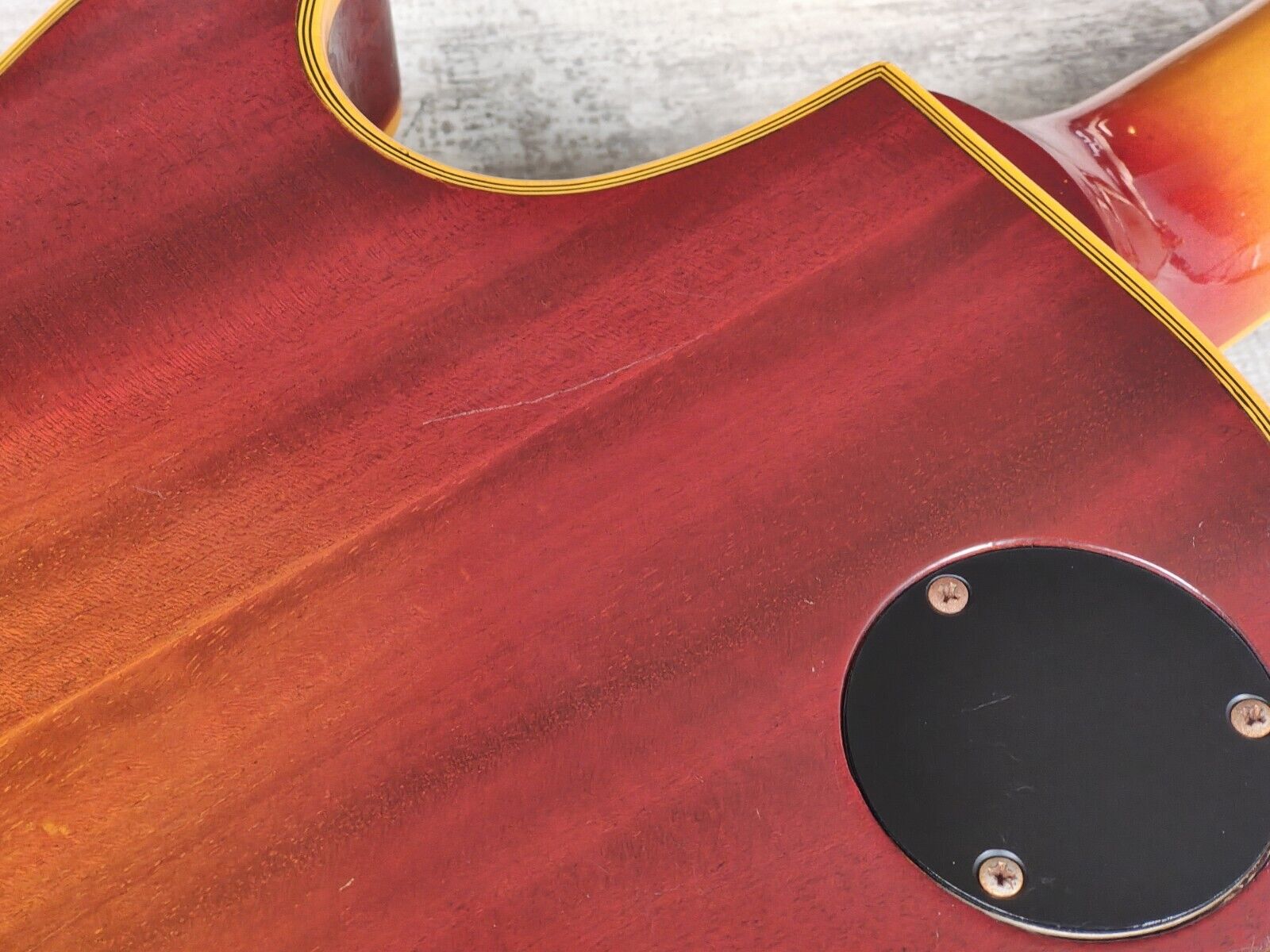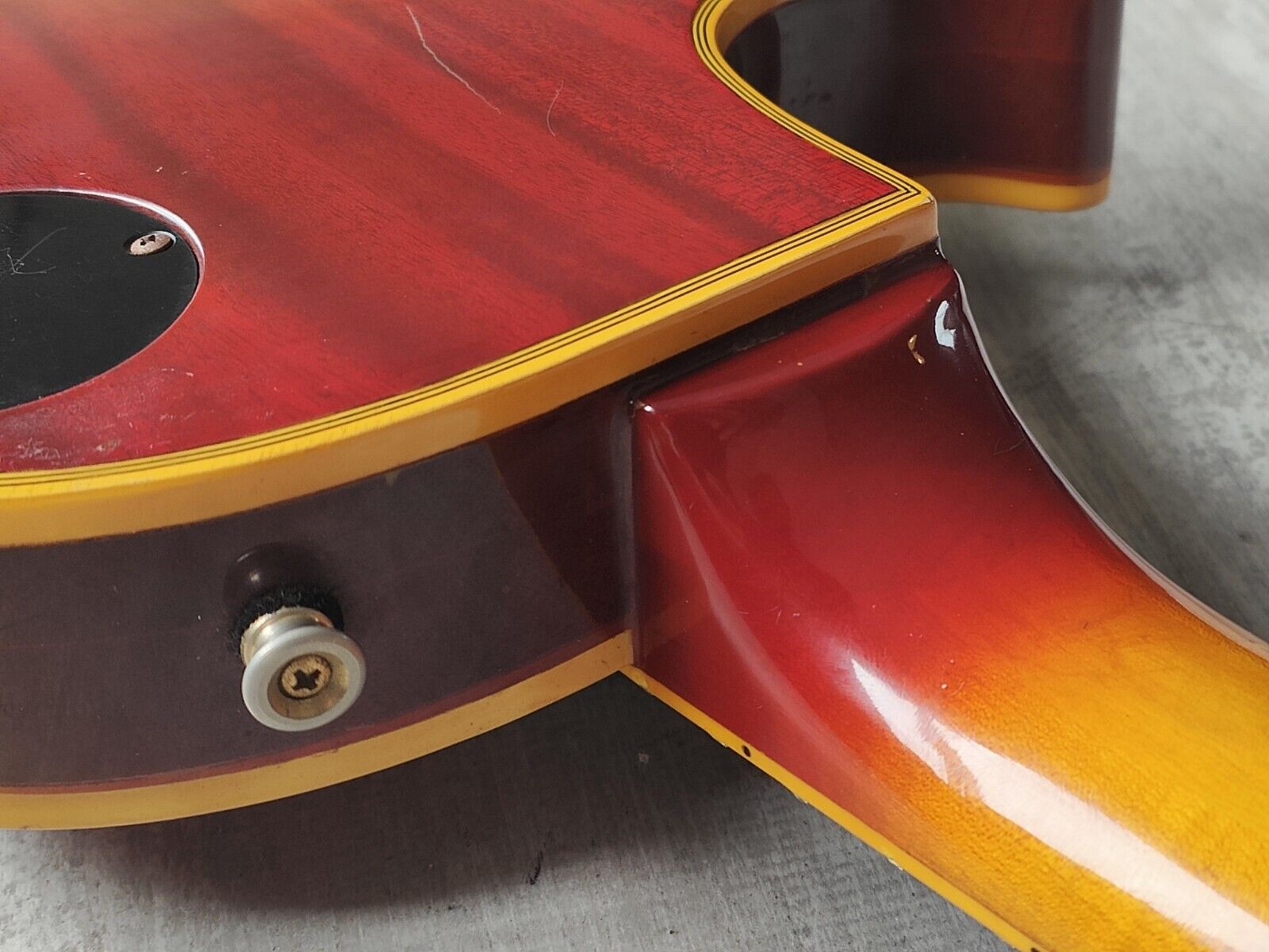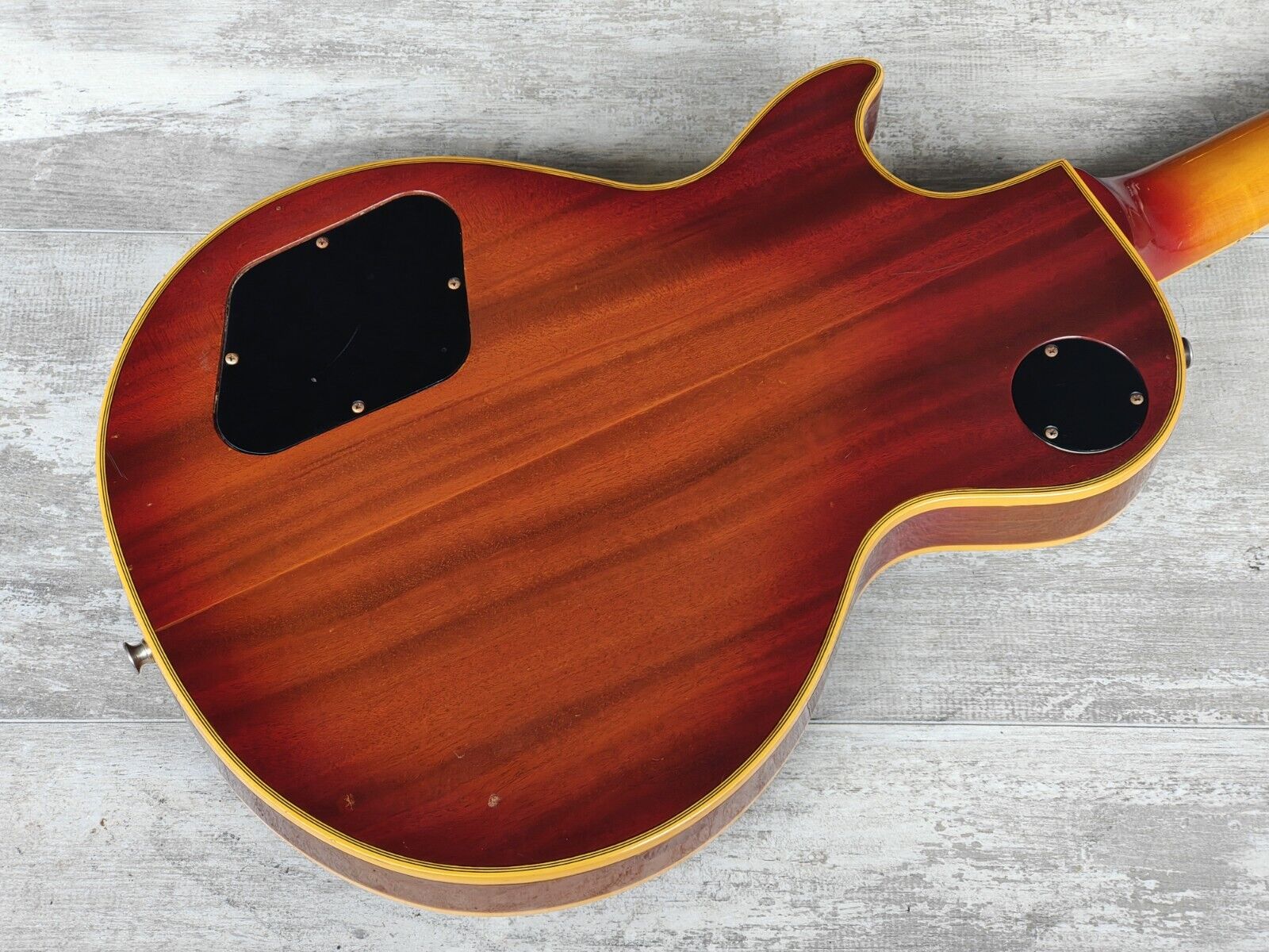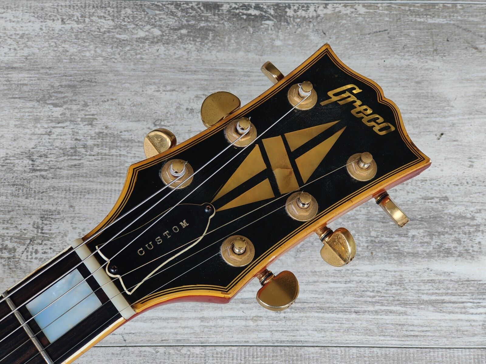 Made by the Fujigen factory in 1975, the EG-1000R was Greco's highest end regular production model at the time (with the EG1200 and EG1500 made as custom orders). Pancake mahogany body with a solid two-piece maple top, gorgeous rosewood fingerboard (although the catalog lists it as ebony) on a slim 60's profile maple neck (12" radius, 44mm nut width, 628mm scale length), it weighs a beefy 4.8kg's. Loaded with the original Maxon U-3000 humbuckers, full sized pots and big ol' tone caps along with the original Grover tuners, it seems close to factory specs with the exception of an aftermarket Gotoh tailpiece and a brand new bone nut.