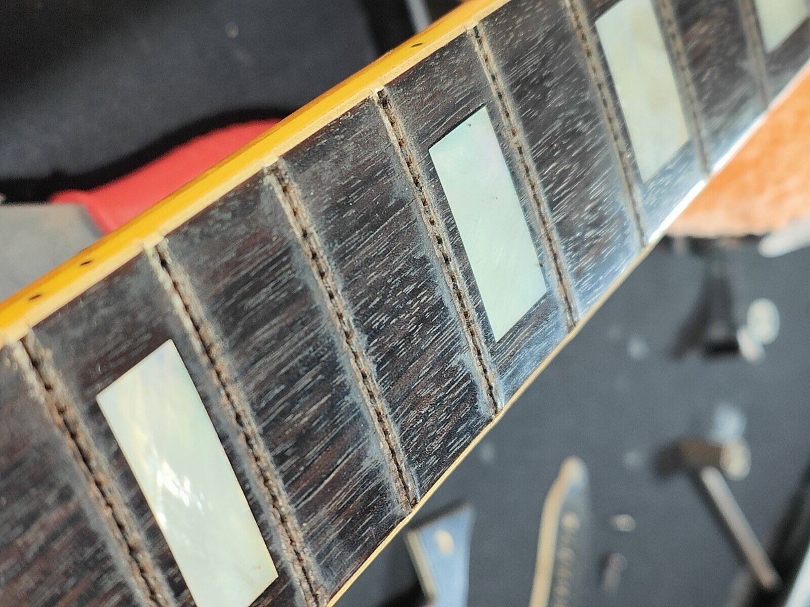 Good overall vintage condition with some dings and blemishes. It's been loved over the years (which was obvious by how low the frets were when the guitar arrived with us) but well cared for and is one hell of a guitar. There's a small sticker tan on the top of the body and a slight separation in the factory joint near the strap button that both Mick and our tech Vaughan have labelled as a non-structural break.