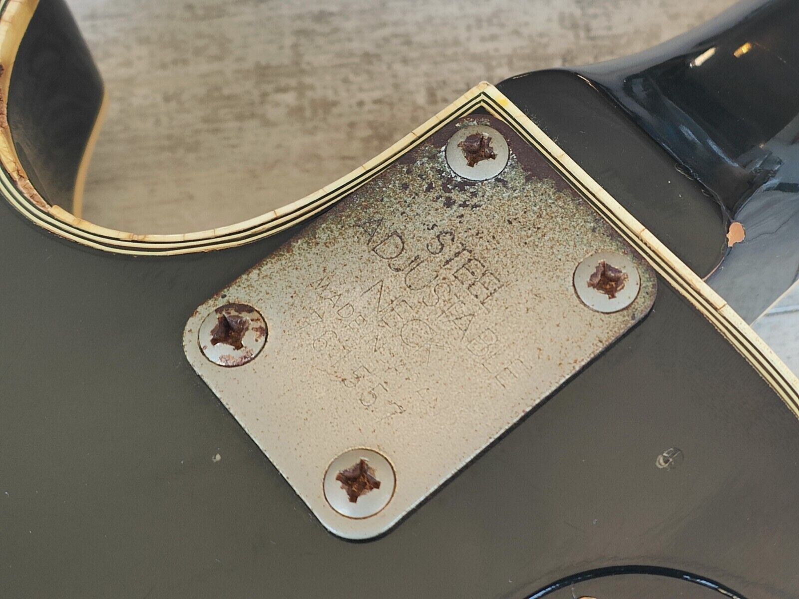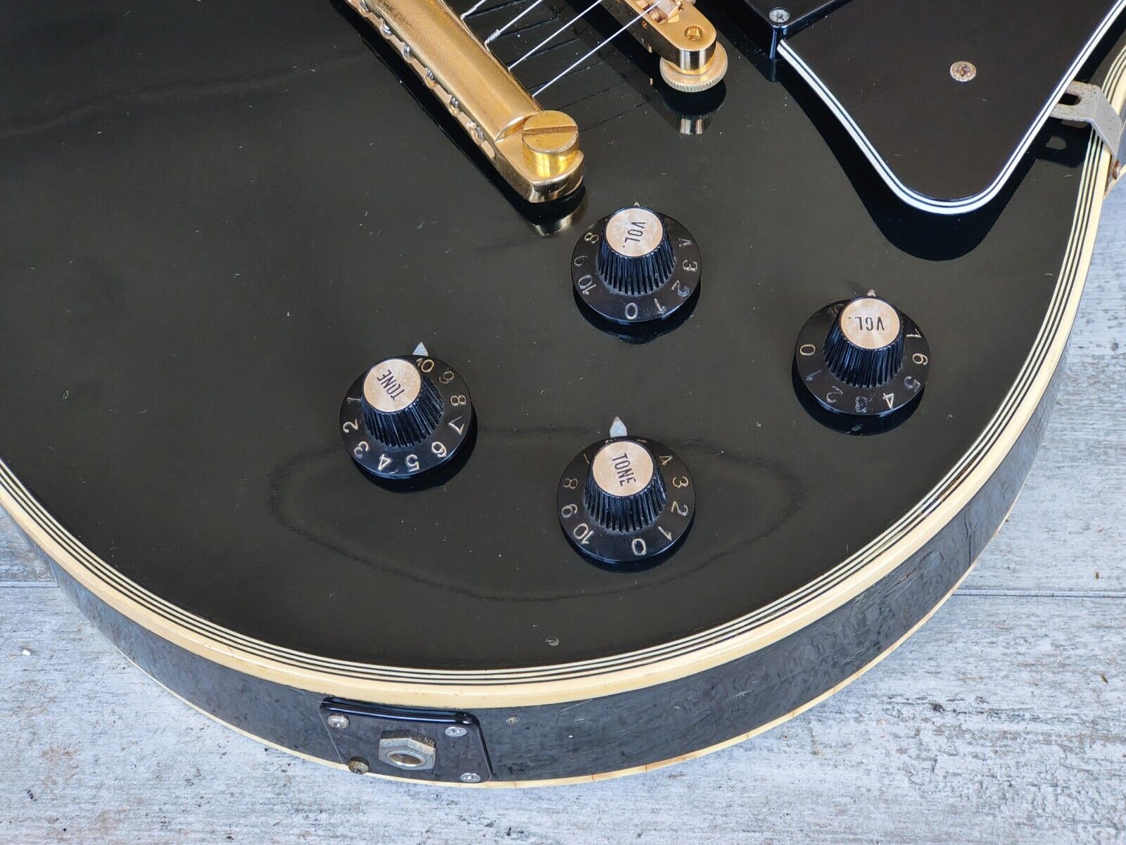 Made by the Matsumoku factory in 1976, the LC-500 was Aria Pro II's base model Les Paul Custom. Solid mahogany body with an arched maple top bolted to a slim 60's style maple neck with an Indian rosewood fingerboard, it weighs just over 4kg's. Loaded with the original Matsumoku "T-Top" humbuckers (covers removed) and original tuners with what looks to be an aftermarket bridge and tailpiece along with one replaced tone pot.