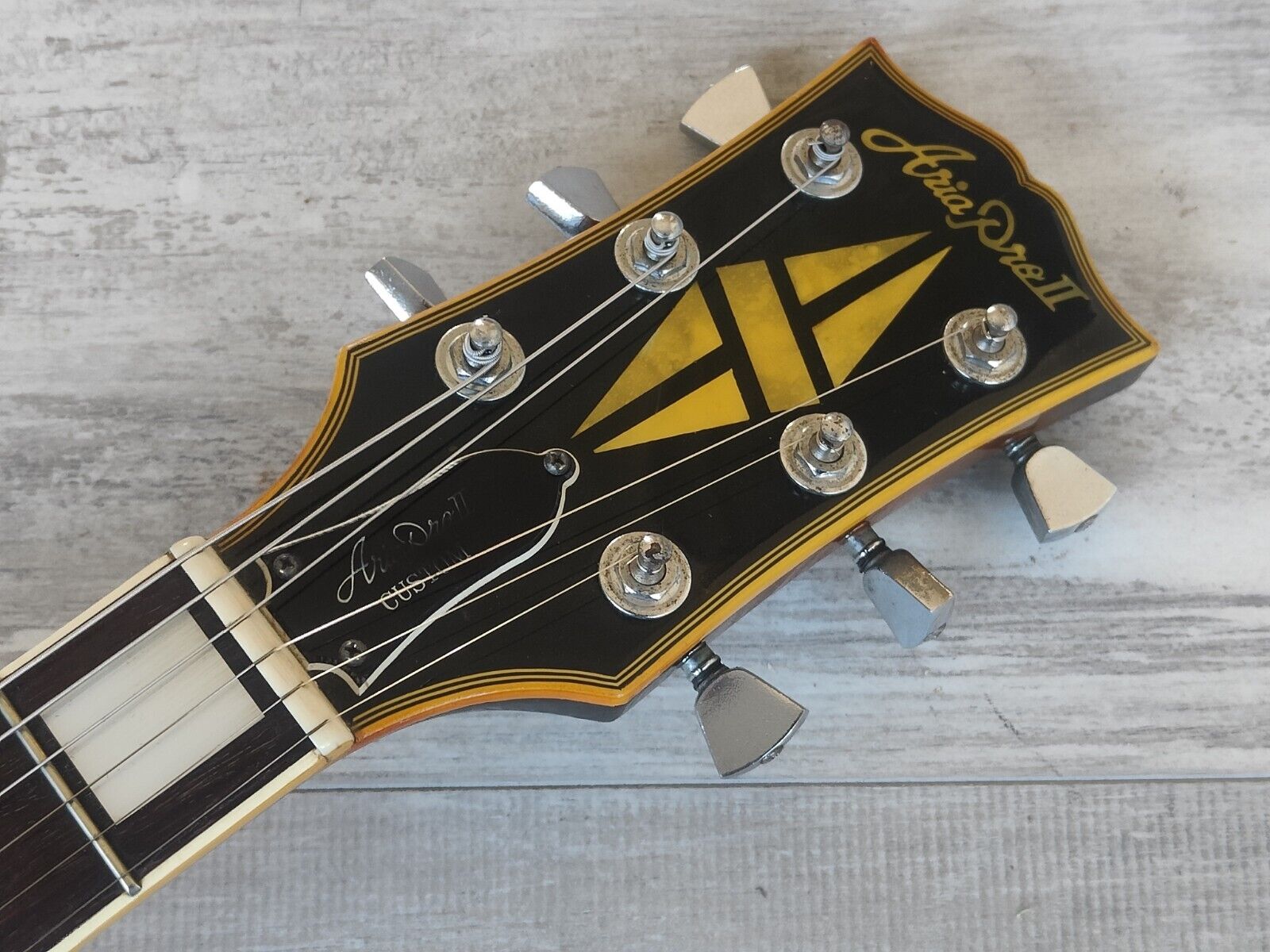 Matsumoku made in the mid 1970's, this Aria Pro II LC Series Les Paul Custom is made with a pancake mahogany body with a maple top, slim 60's mahogany neck and a rosewood fingerboard, weighs 3.8kg's. Previous owner converted the bridge and refinished the top in transparent red along with replacing many of the parts such as the knobs, pickguard and possibly the pickups.