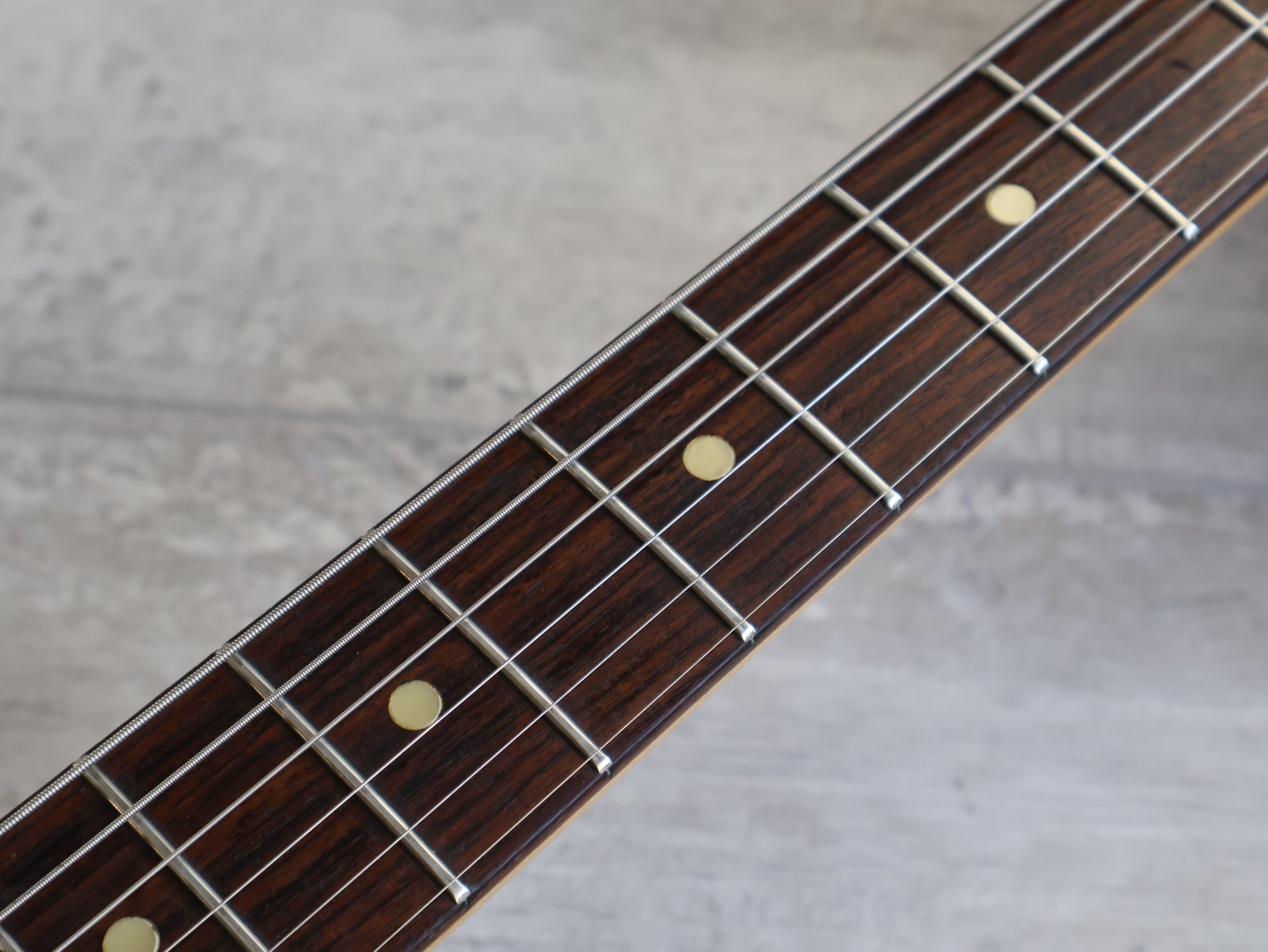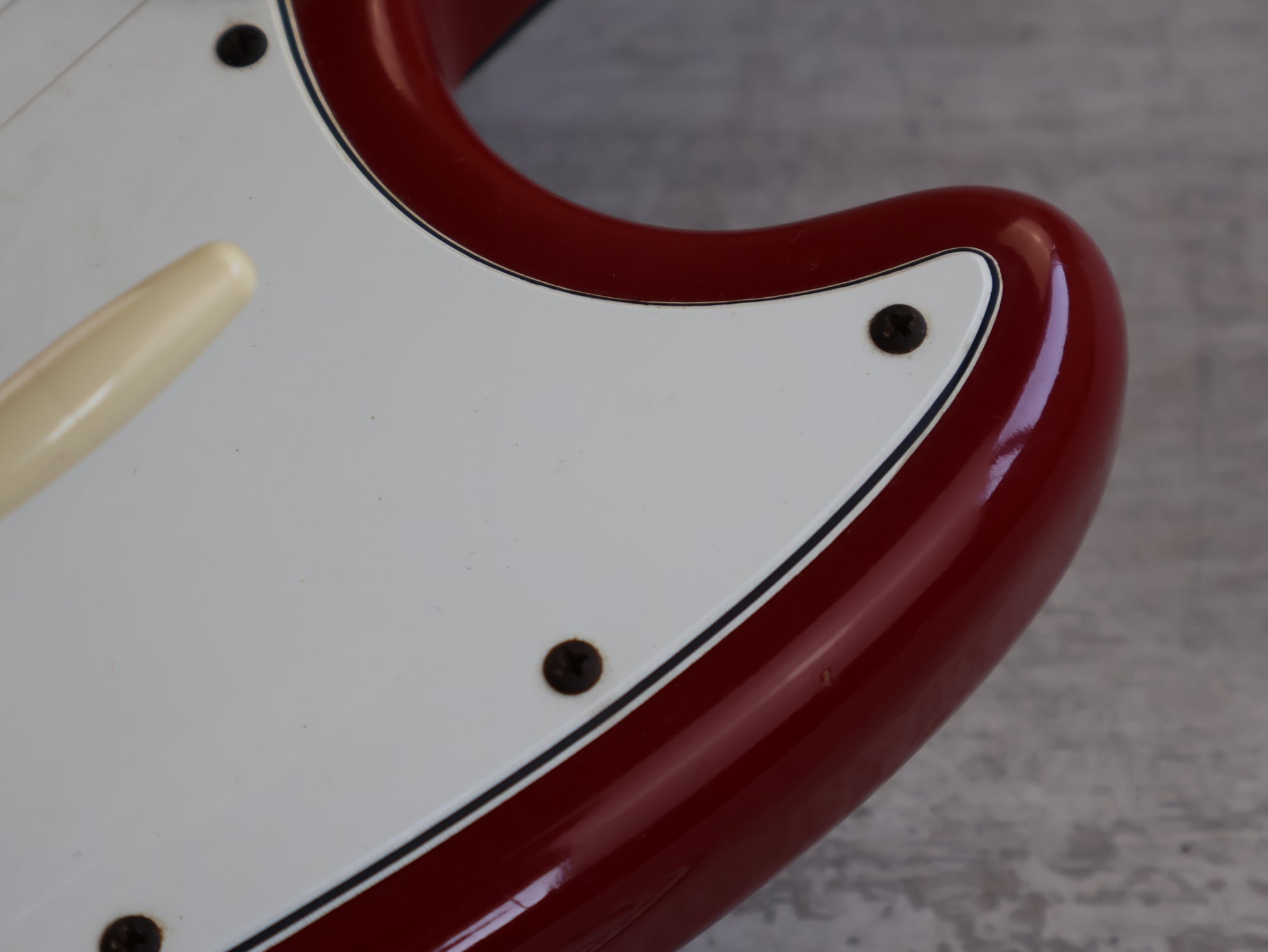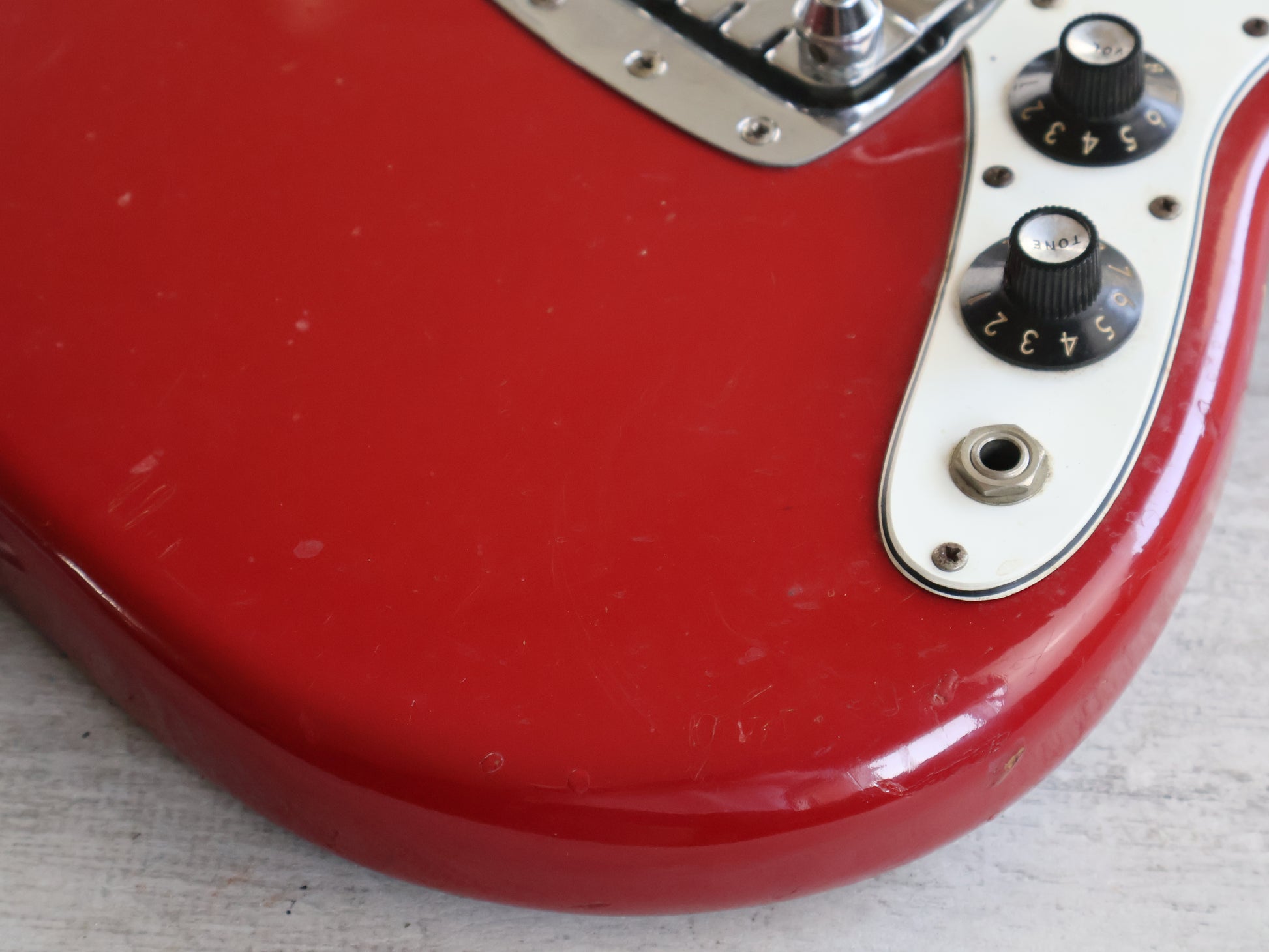 Alder Mustang-sized body wearing an aged nitro Fiesta Red finish bolted to a slim C maple neck with a veneer rosewood fingerboard (610mm scale, 42mm nut width, 7.25" radius), it weighs 3.6kg's. Loaded with the original pickups, pots and wiring along with the original pickguard in "un-cracked" condition (very rare as a majority of these cracked at the output jack from use).
