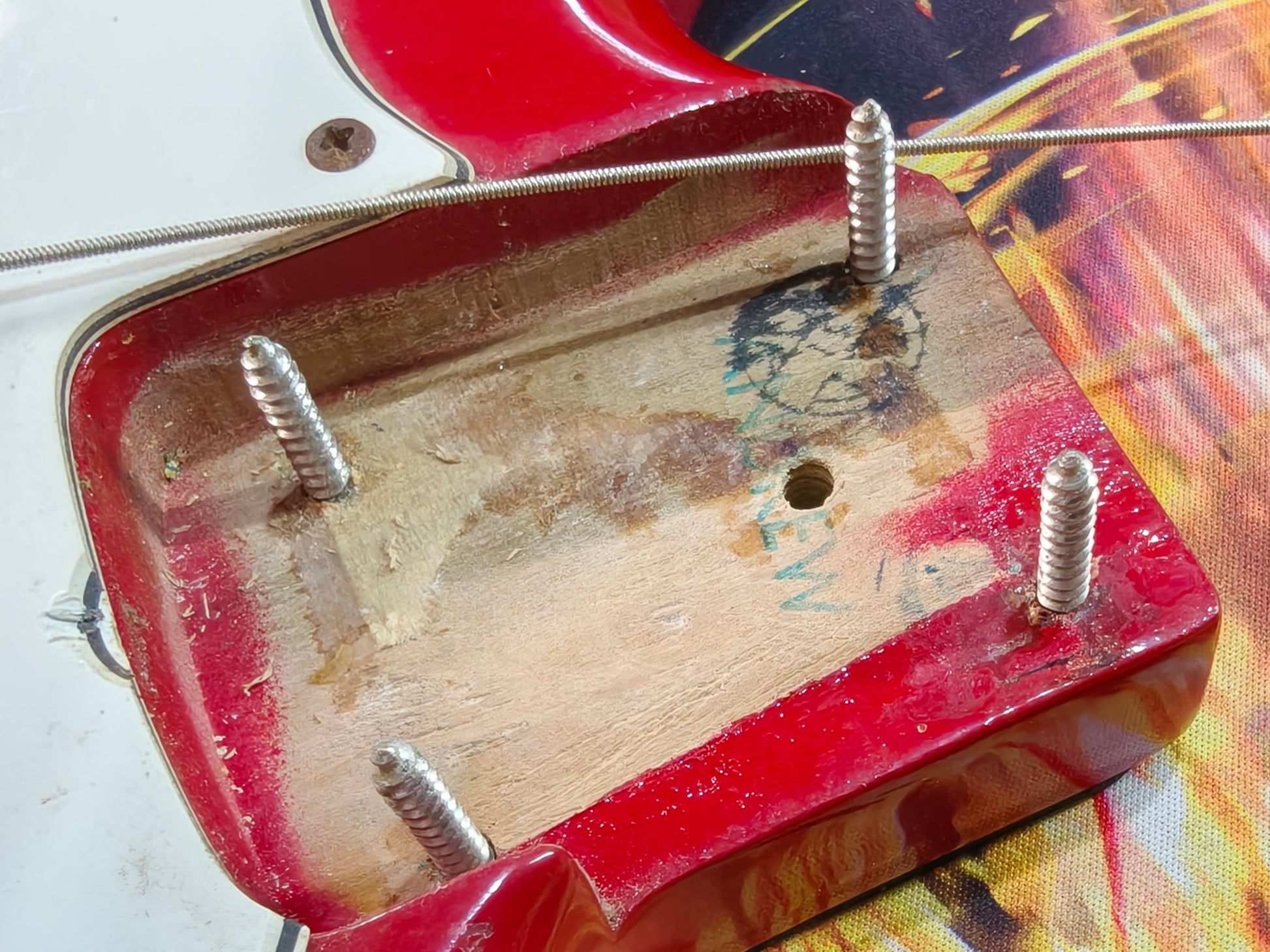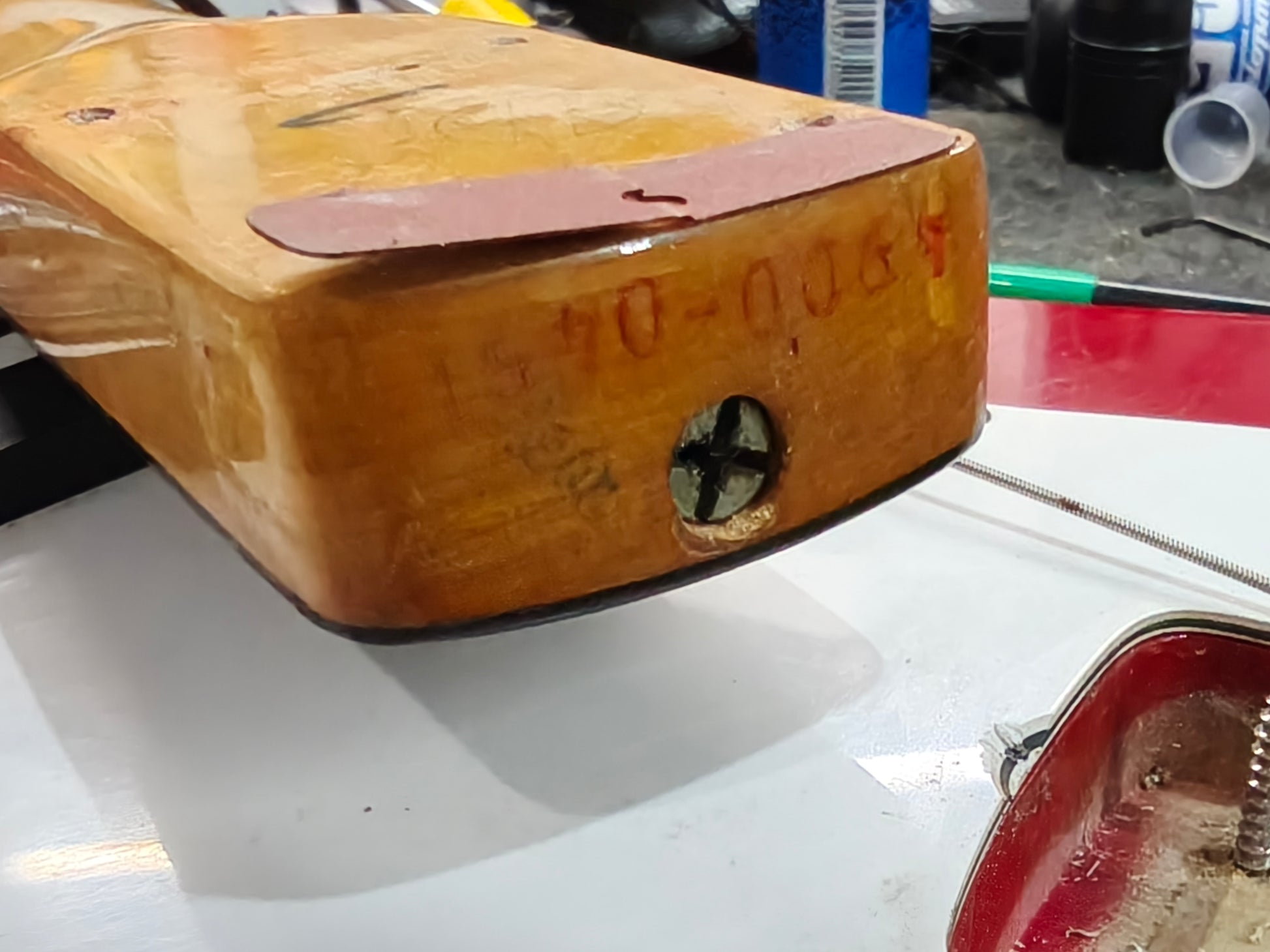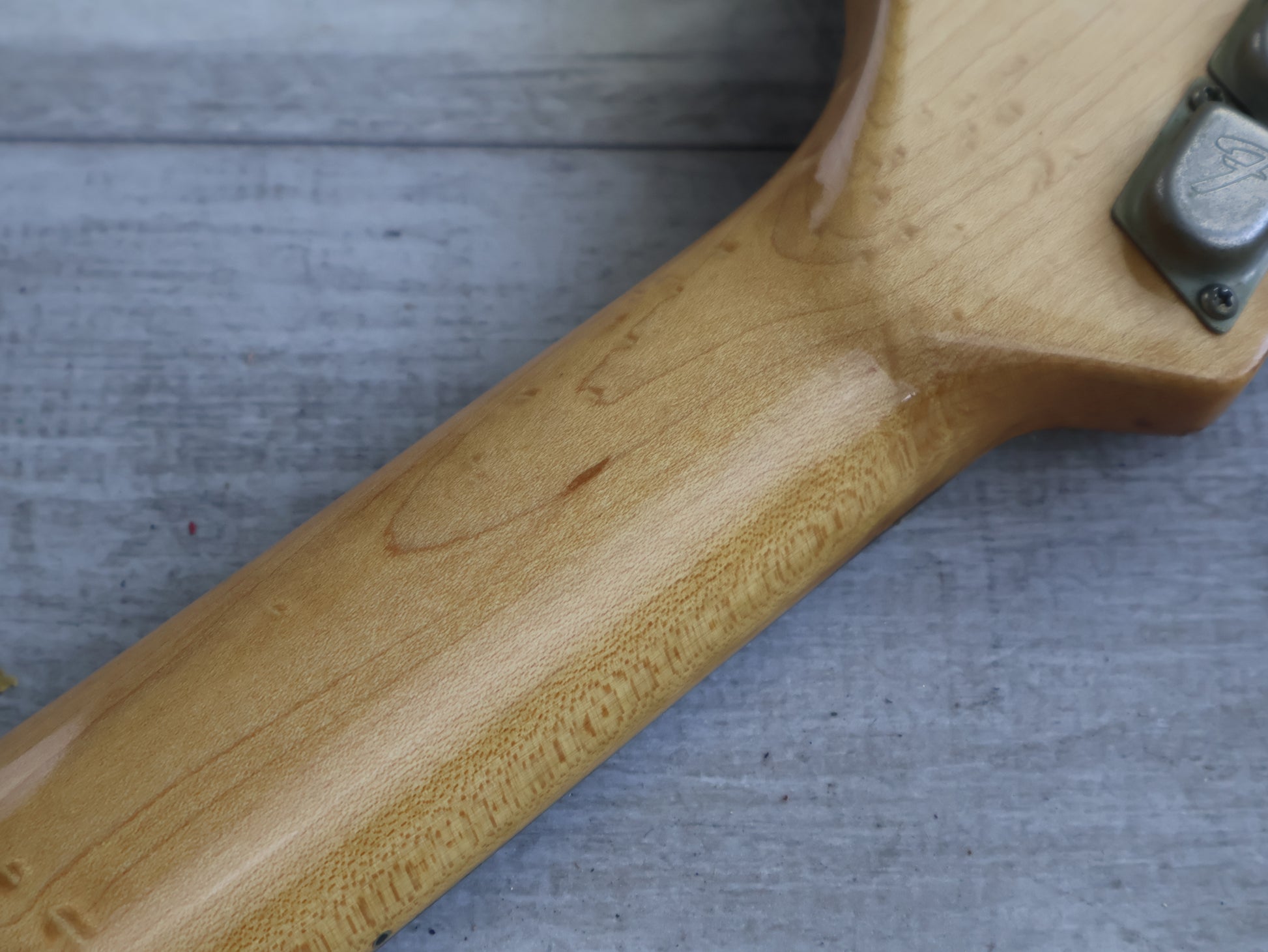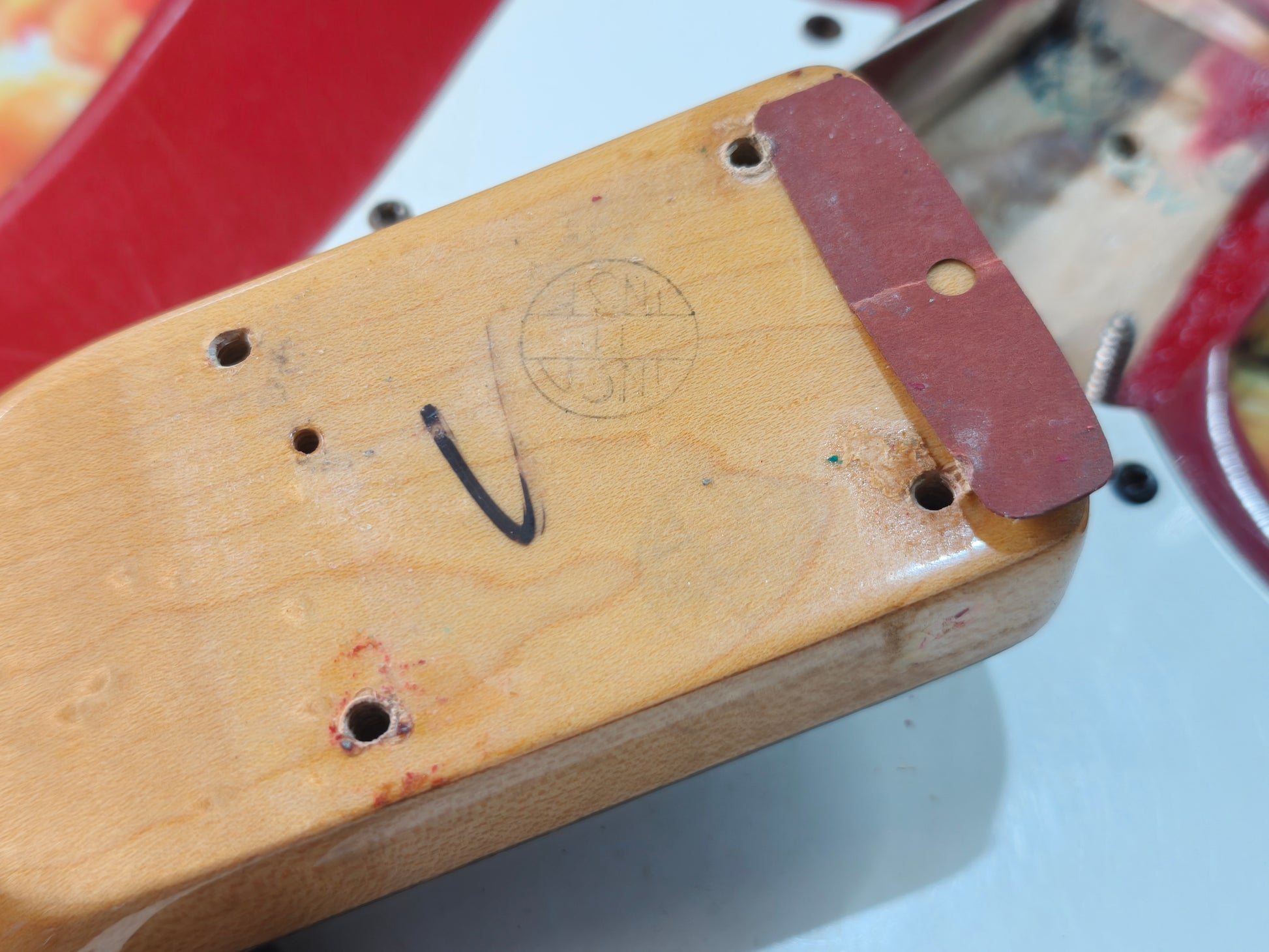 Alder Mustang-sized body wearing an aged nitro Fiesta Red finish bolted to a slim C maple neck with a veneer rosewood fingerboard (610mm scale, 42mm nut width, 7.25" radius), it weighs 3.6kg's. Loaded with the original pickups, pots and wiring along with the original pickguard in "un-cracked" condition (very rare as a majority of these cracked at the output jack from use).