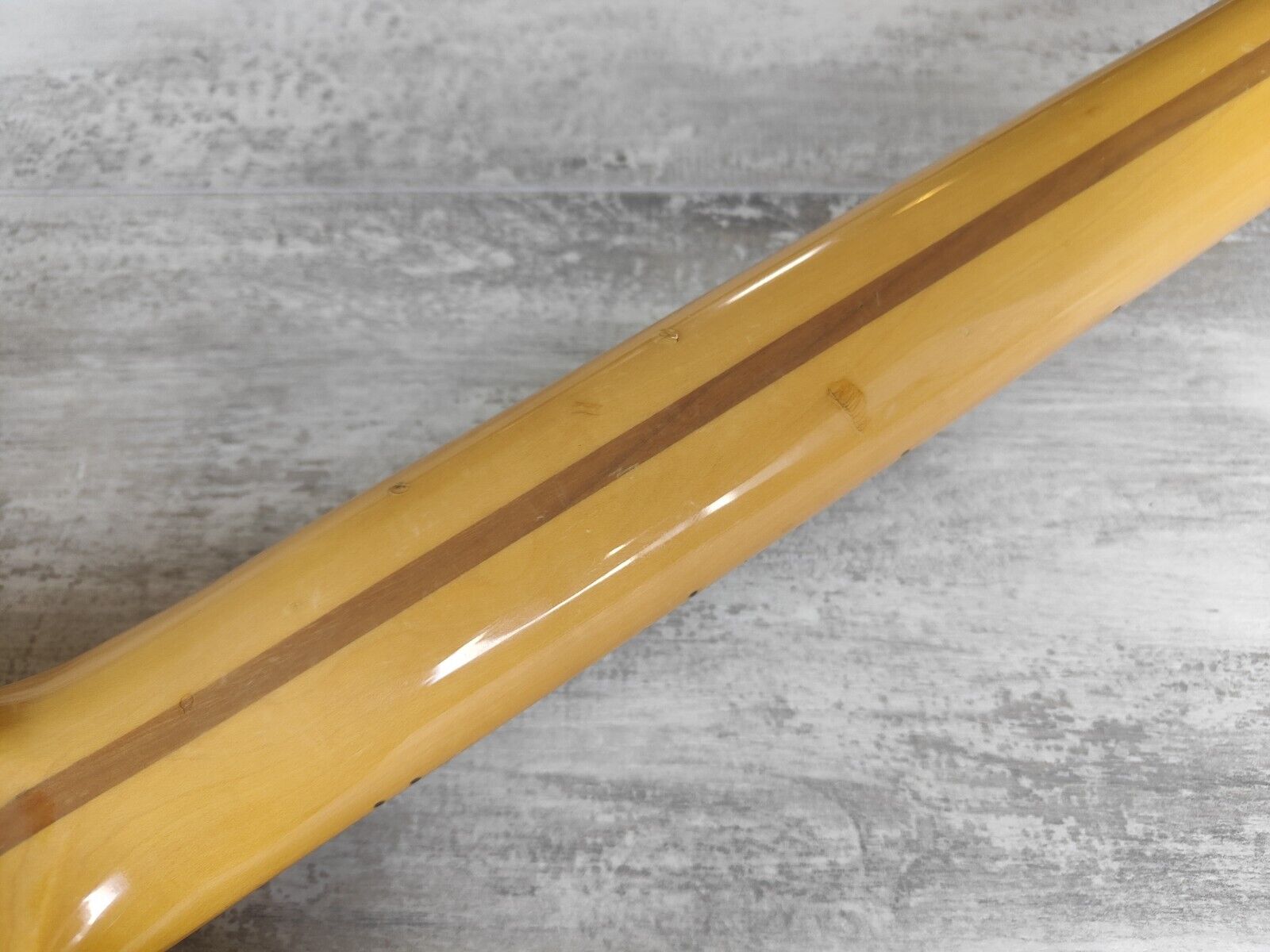 Made in Japan by Fernandes in 1976, the FST-75N was their take on the CBS style '70's Fender Stratocaster. Natural finish on a pancake ash body with a one-piece maple neck (fretless wonder style fingerboard), it weighs 3.8kg's. Full CBS aesthetic with a three-bolt neck design with a tilt adjuster for the neck angle along with a bullet truss and dual string trees. This one seems to have an aftermarket volume pot, pickguard and bridge pickup (rail-style humbucker, unbranded). The original bridge system and Fernandes stamped tuners both function as they should.