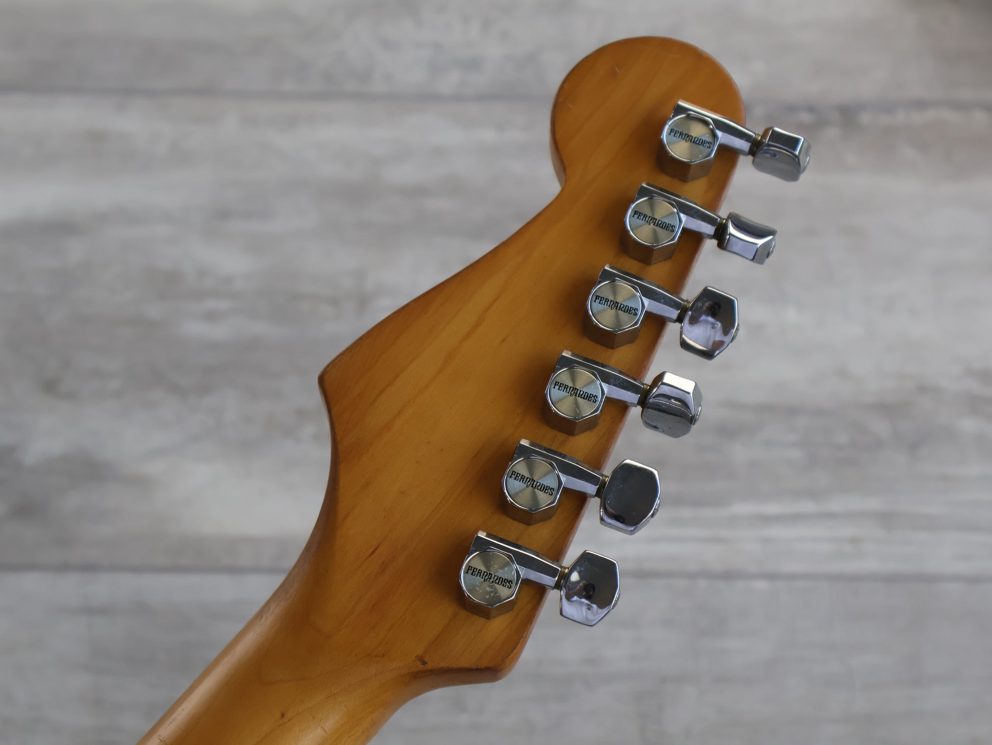 Loaded with the original alnico pickups and Japanese pots/wiring mounted to a single ply white pickguard. Fernandes branded tuners and the original Japanese tremolo system are all working well.