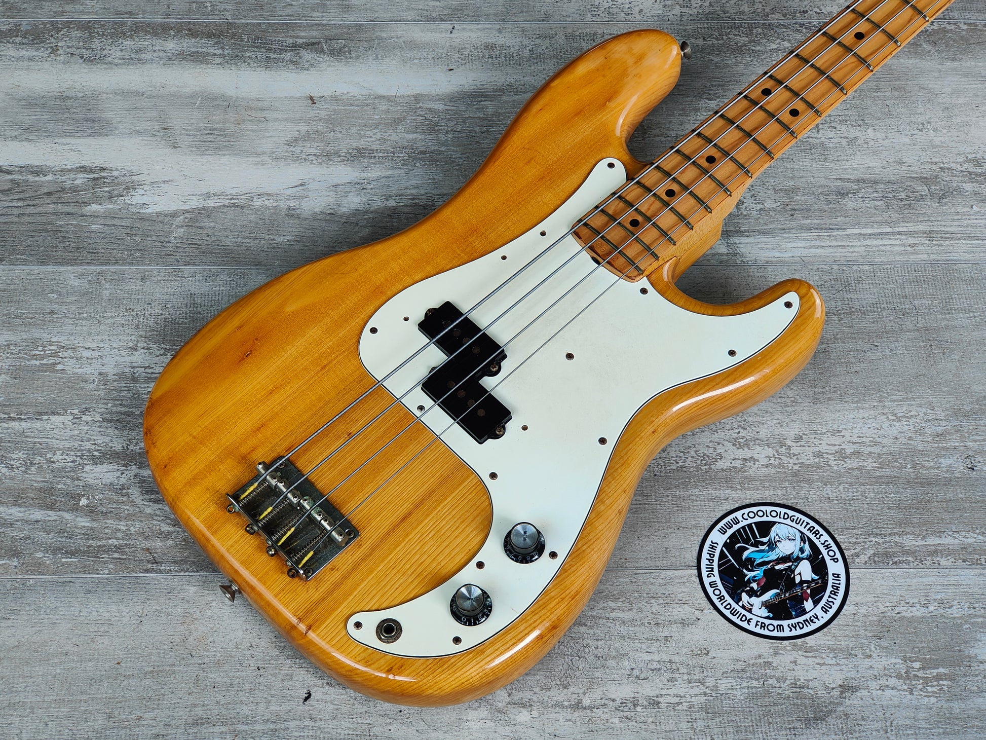 Made in Japan in 1976, the FPB-65N was the natural finish "Power Bass" model from Fernandes. Solid ash body with a one-piece maple neck (39mm nut width), it weighs 4kg's. This one has some replacement knobs installed along with one screw replaced on the G tuner otherwise it seems to be all original.