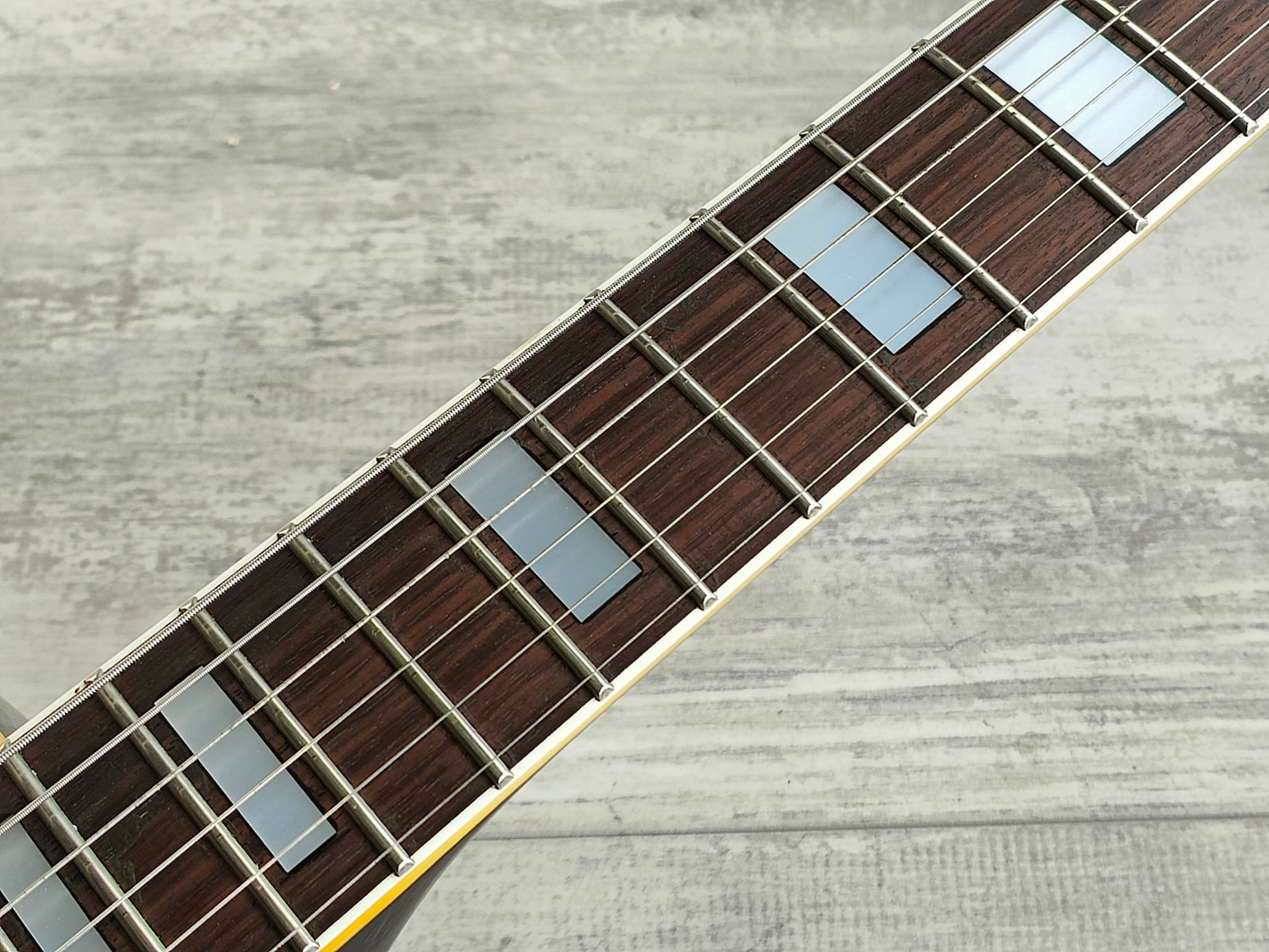Made by the Fujigen factory in 1977, the EG-500C Les Paul Custom has a chambered mahogany construction with a slim 60's profile maple neck and a 22 fret rosewood fingerboard, weighing 3.7kg's. Full chrome hardware loadout including Greco stamped tuners and Japanese bridge/tailpiece combination, the original Maxon humbucker in the neck position is paired with a Dimarzio Super Distortion in the bridge and both sound great together or individually.
