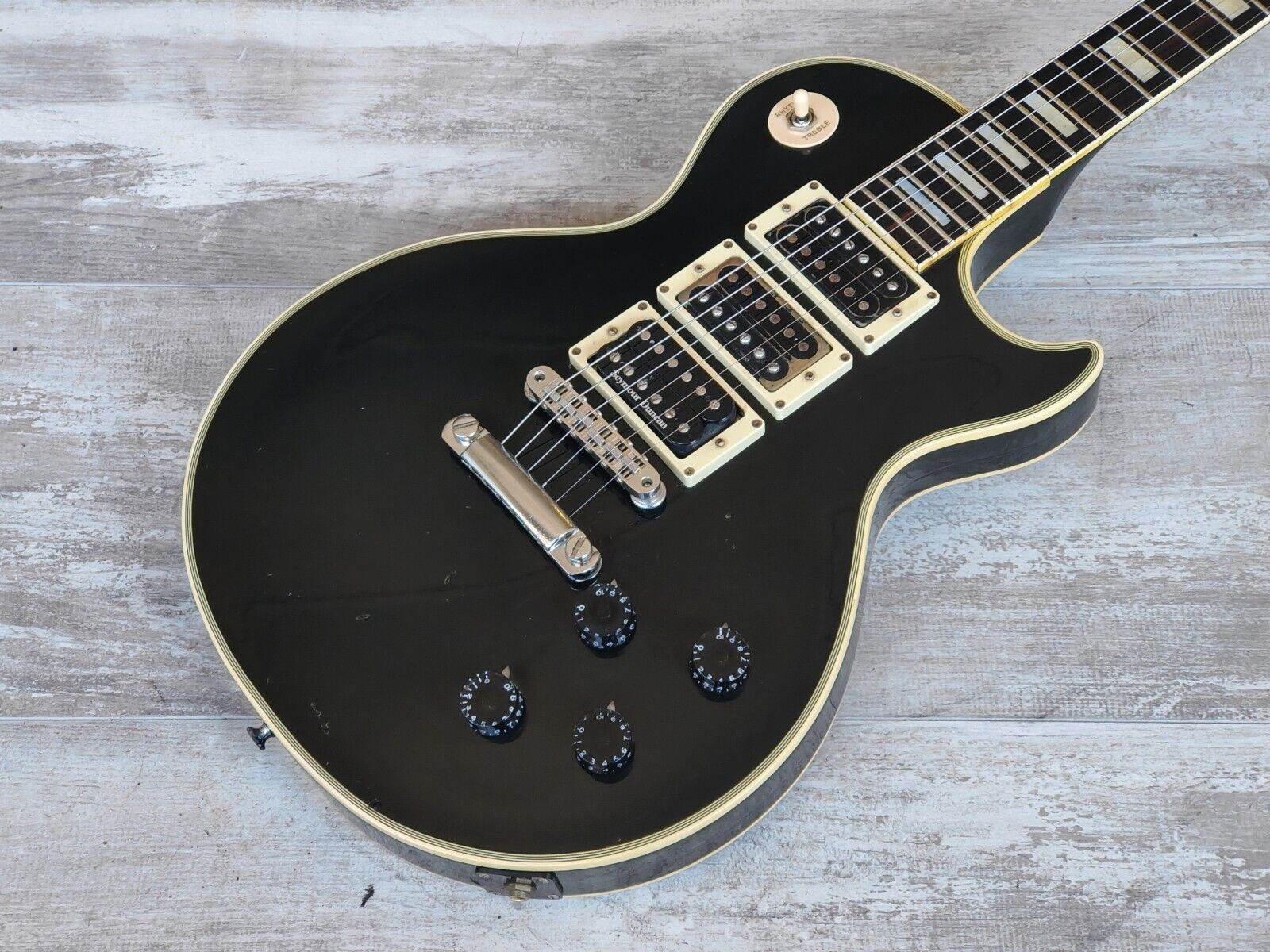 Made by the Fujigen factory in 1977, the EG-600PB was an unofficial Peter Frampton model made by Greco. Full Gibson Les Paul Custom aesthetic, it's built with a mahogany body, maple top, slim 60's neck profile and a bound rosewood fingerboard, weighs a reasonable 4.2kg's. Loaded with two Maxon branded humbuckers and an aftermarket Seymour Duncan SH-4 in the bridge position, Greco branded tuners and Japanese hardware, it's had a brand new three-way pickup selector installed and is wired for three volume knobs and a master tone control.