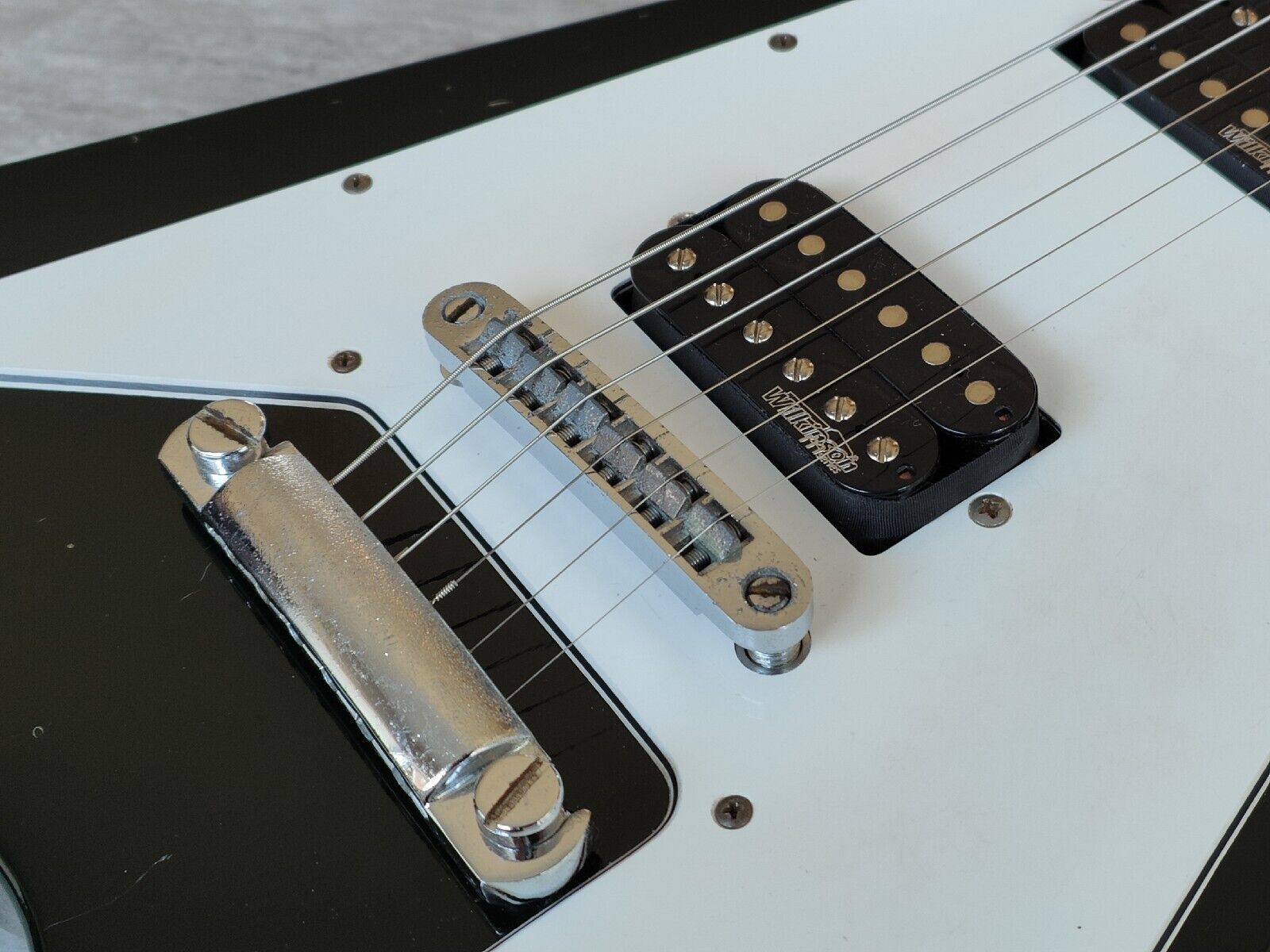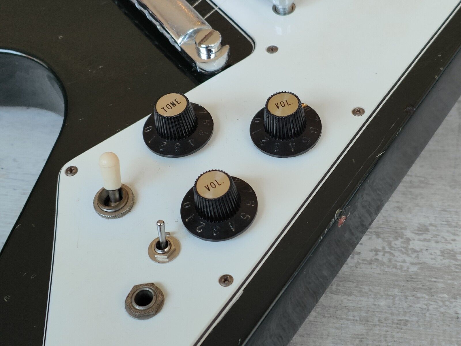 Made by the Fujigen factory in early 1977, this is the Greco FV-600 '67 reissue Flying V. Mahogany body with a slim 60's profile mahogany neck and a 22 fret rosewood fingerboard with dot inlays, it weighs a 3.7kg's. Original pickups have been replaced at some point with Wilkinson Classic Overwound humbuckers with the original switch and wiring/pots (and an additional coil split toggle). Still has the original bridge and tailpiece and the original star tuners.