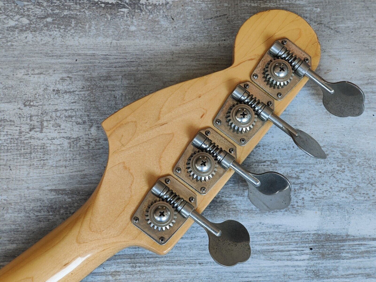 Made in Japan in 1977, the PB420W was the Greco model that aimed at replicating Fender's 60's Jazz Bass. Solid body with a maple neck and rosewood fingerboard (dot inlays and a 41mm nut width), it weighs 3.8kg's. Has an aftermarket bridge installed along with some new pots and a new output jack.