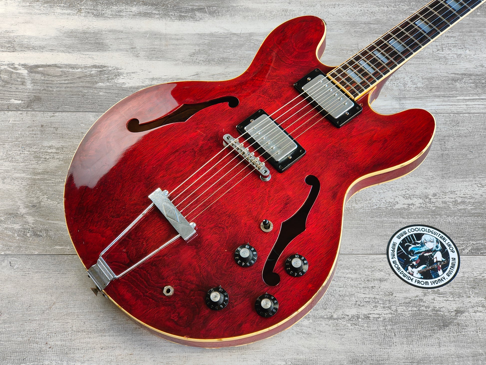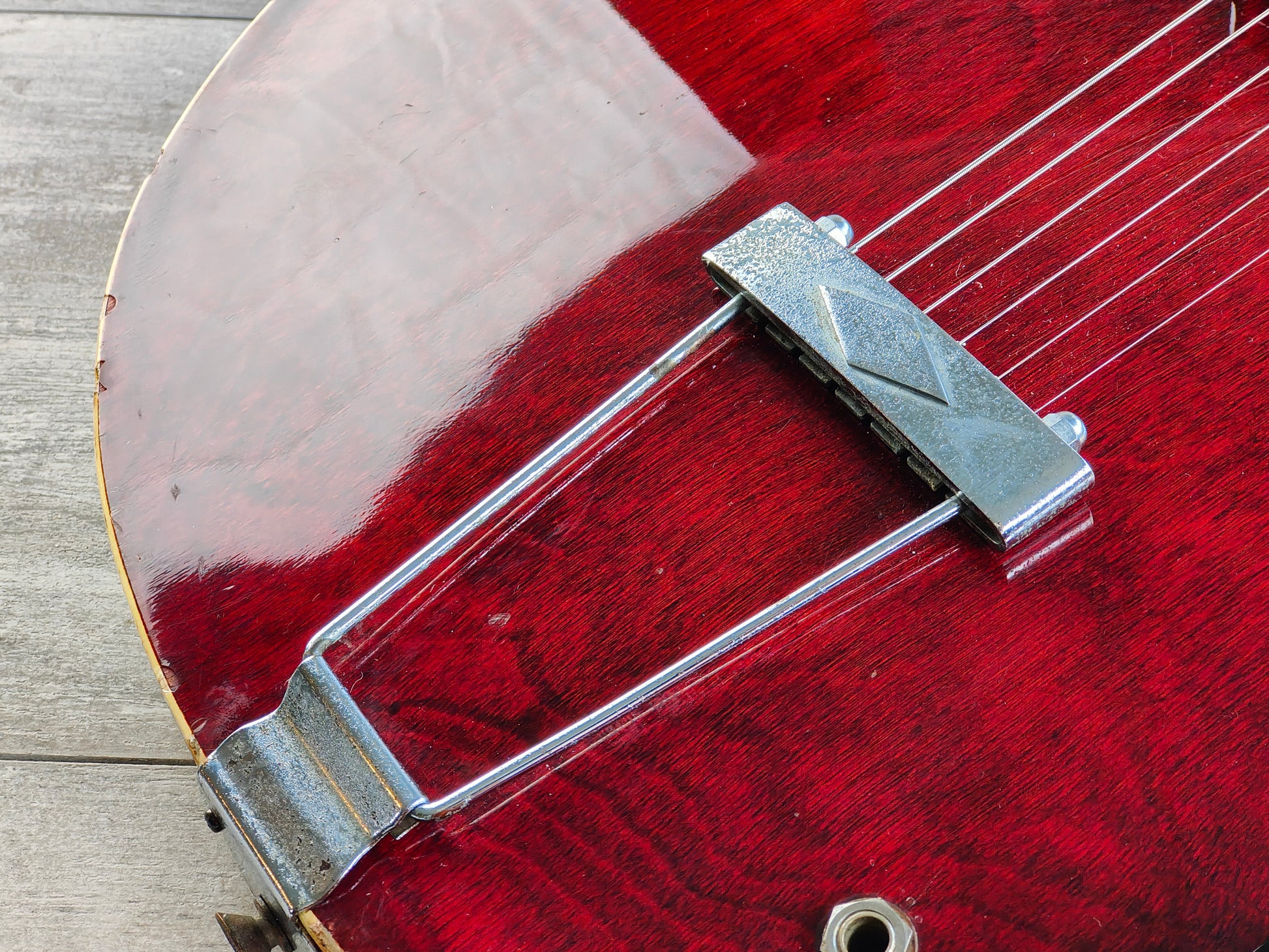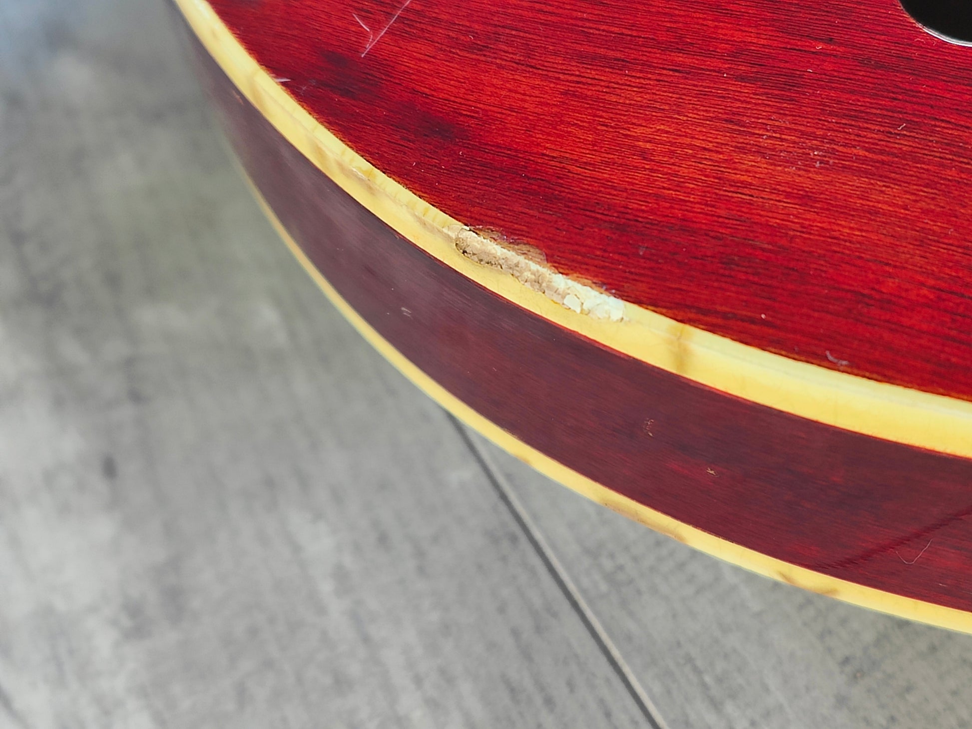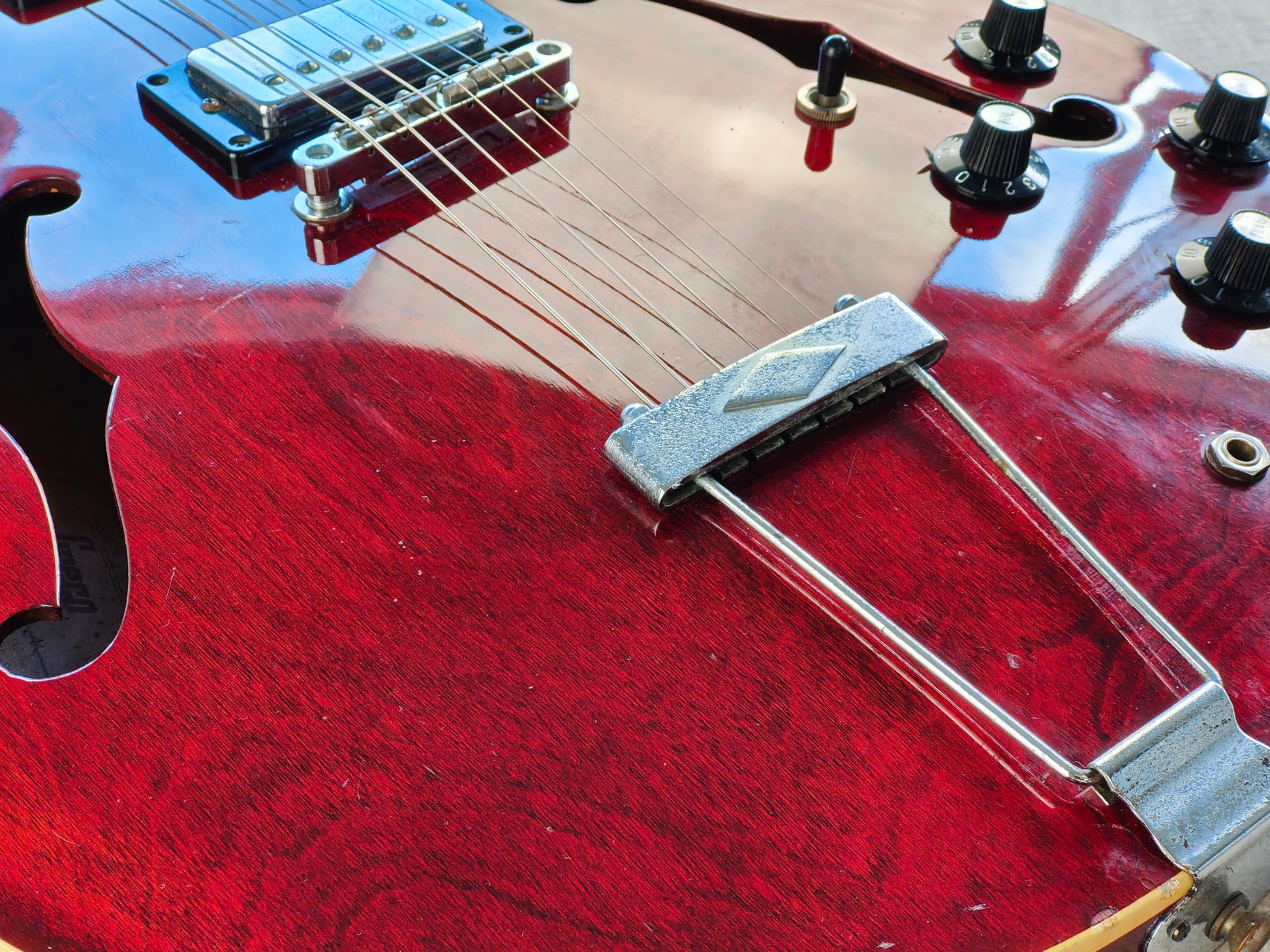Good vintage condition as pictured, received a full professional setup and service prior to listing. The frets are shiny and smooth, they've been played over the years but still have life left. The truss works as it should and the neck is straight. There's some binding crumble that's been glued slightly to stabilise the areas (very common with this era of hollowbody) but no structural damage or structural repairs.