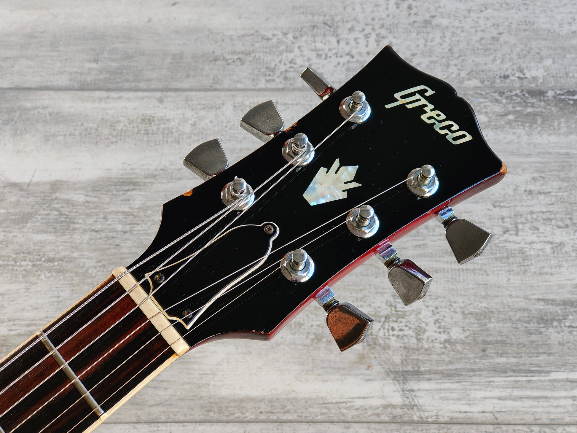 Full Gibson style aesthetic with an open book headstock and crown inlay plus block inlays on the fretboard. Loaded with the original Maxon U-1000 PAF style humbuckers, a trap-eze style tailpiece and tune-o-matic bridge along with Greco stamped tuners, it appears to be all original with the exception of a few brand new pots.