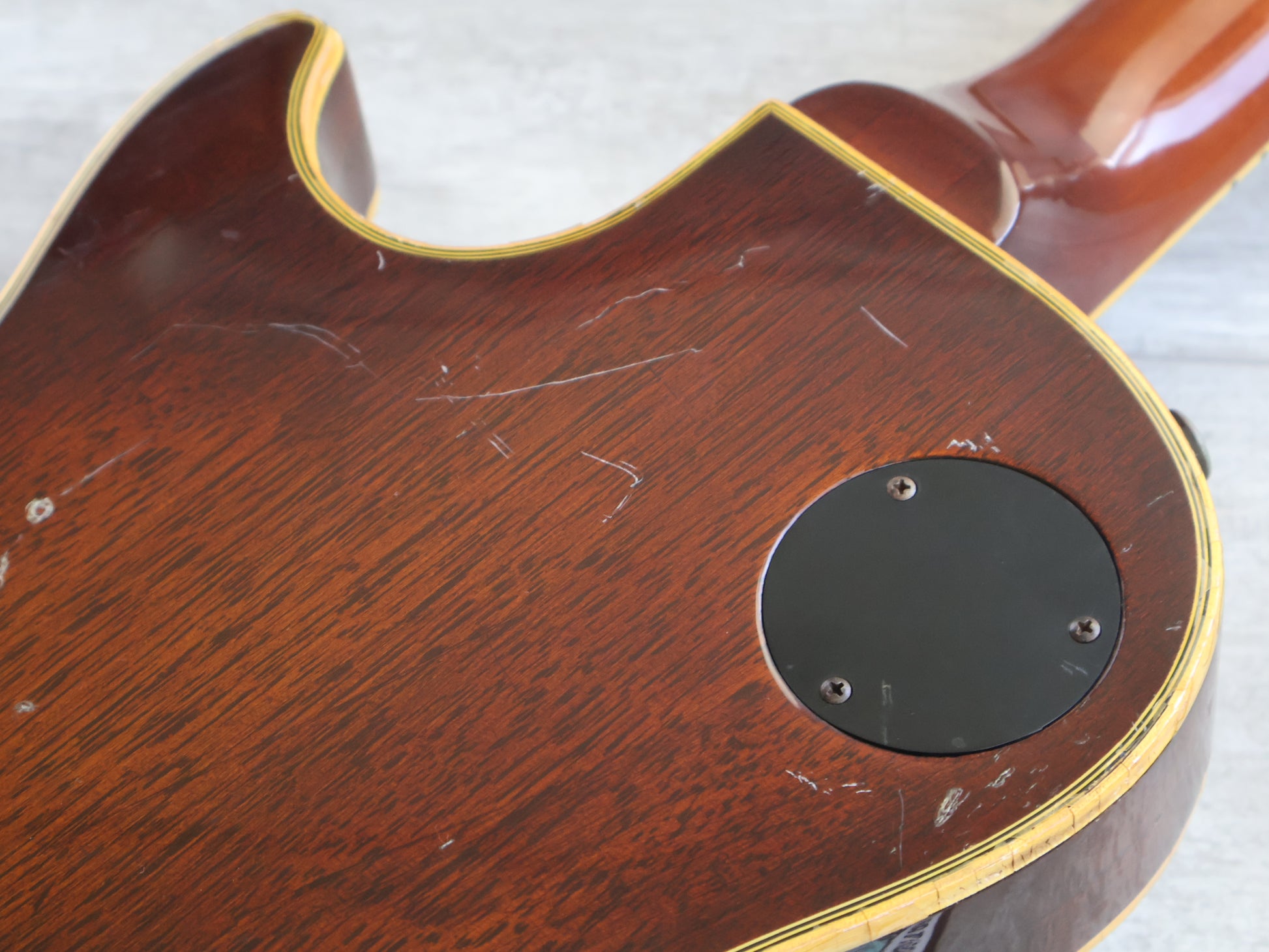 Now THIS is a good looking vintage Les Paul Custom! Made by Matsumoku in June 1978, this LC-600 wears the very classy Violin Brown finish and features a carved mahogany top, pancake mahogany body, slim 60's maple neck with a small volute, 22 fret rosewood fingerboard, weighs 4.3kg's. Unmarked Dimarzio style pickups (with Patent Pending printed on the wires), original pots and hardware all working well and sounding great.