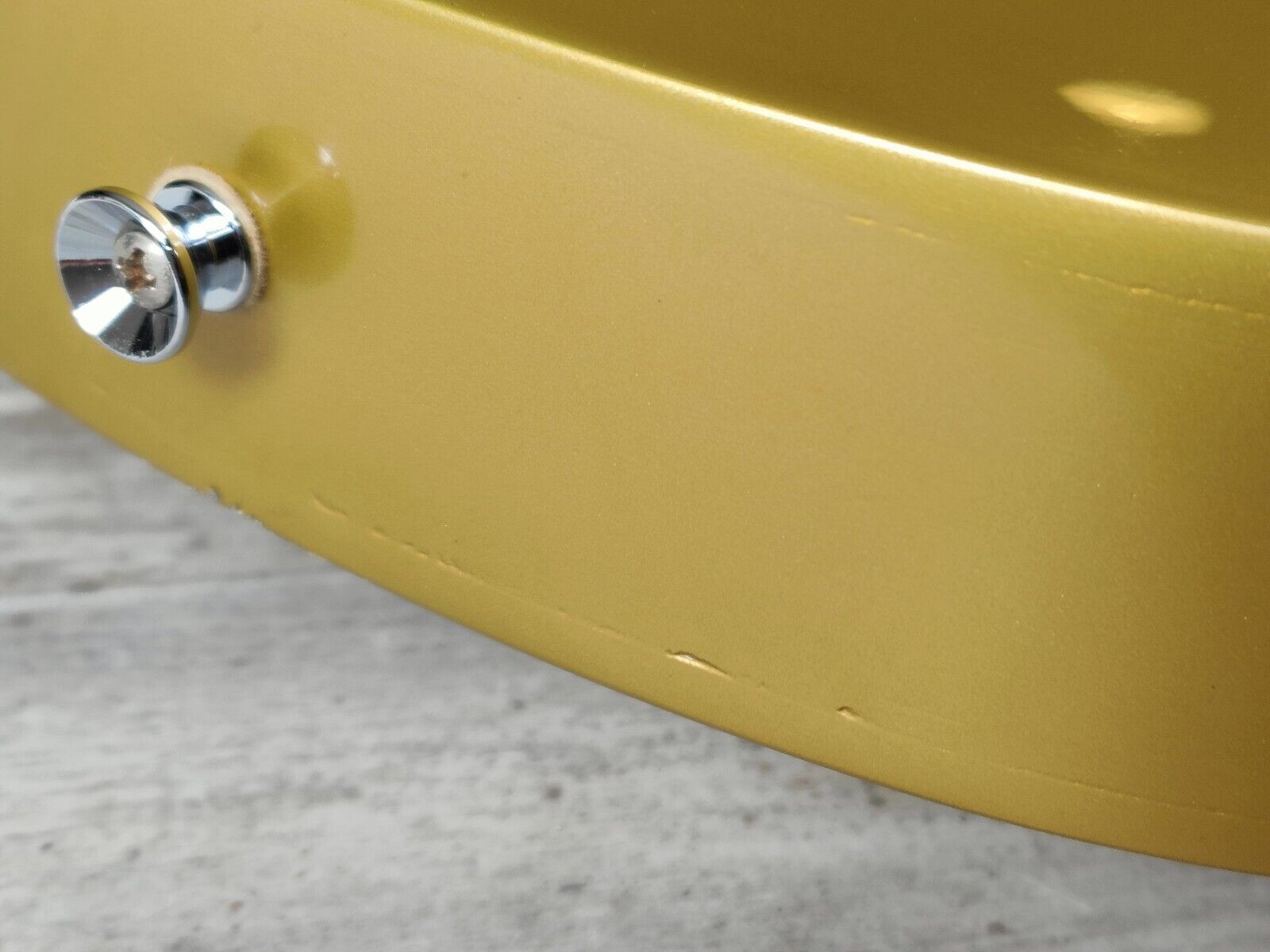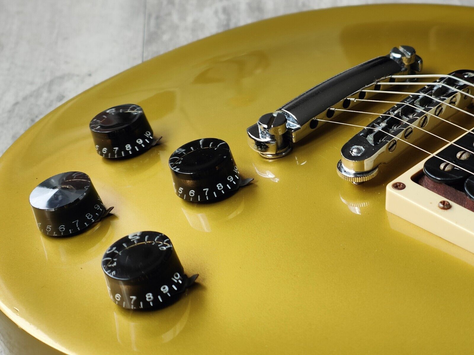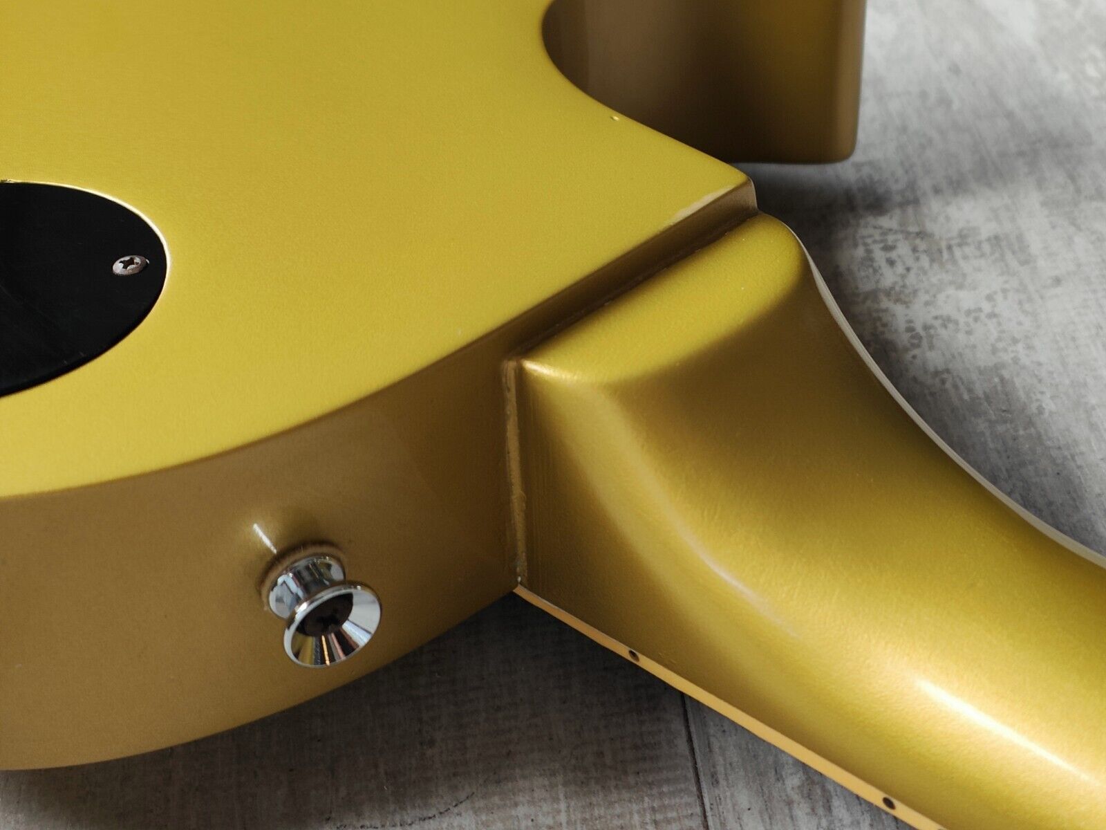 This one was completely painted in gold prior to receiving a full professional setup and service, the finish is spotty but suits the age of the guitar well. The frets were polished and are shiny and smooth with some light pitting/playwear, the neck is straight with a fully adjustable truss.