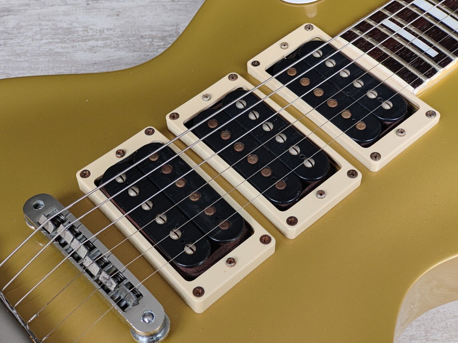 Made by the Matsumoku factory in late 1978, the LP-600R is a rarer-than-most three-pickup Les Paul Custom from Aria Pro II. Mahogany body with a slim 60's three-piece maple neck and bound rosewood fretboard, it weighs a very reasonable 4.3kg's (making it much more playable than some of the 5kg builds from a similar era). Loaded with three Matsumoku T-Top humbuckers controlled by 3V, 1T wiring.