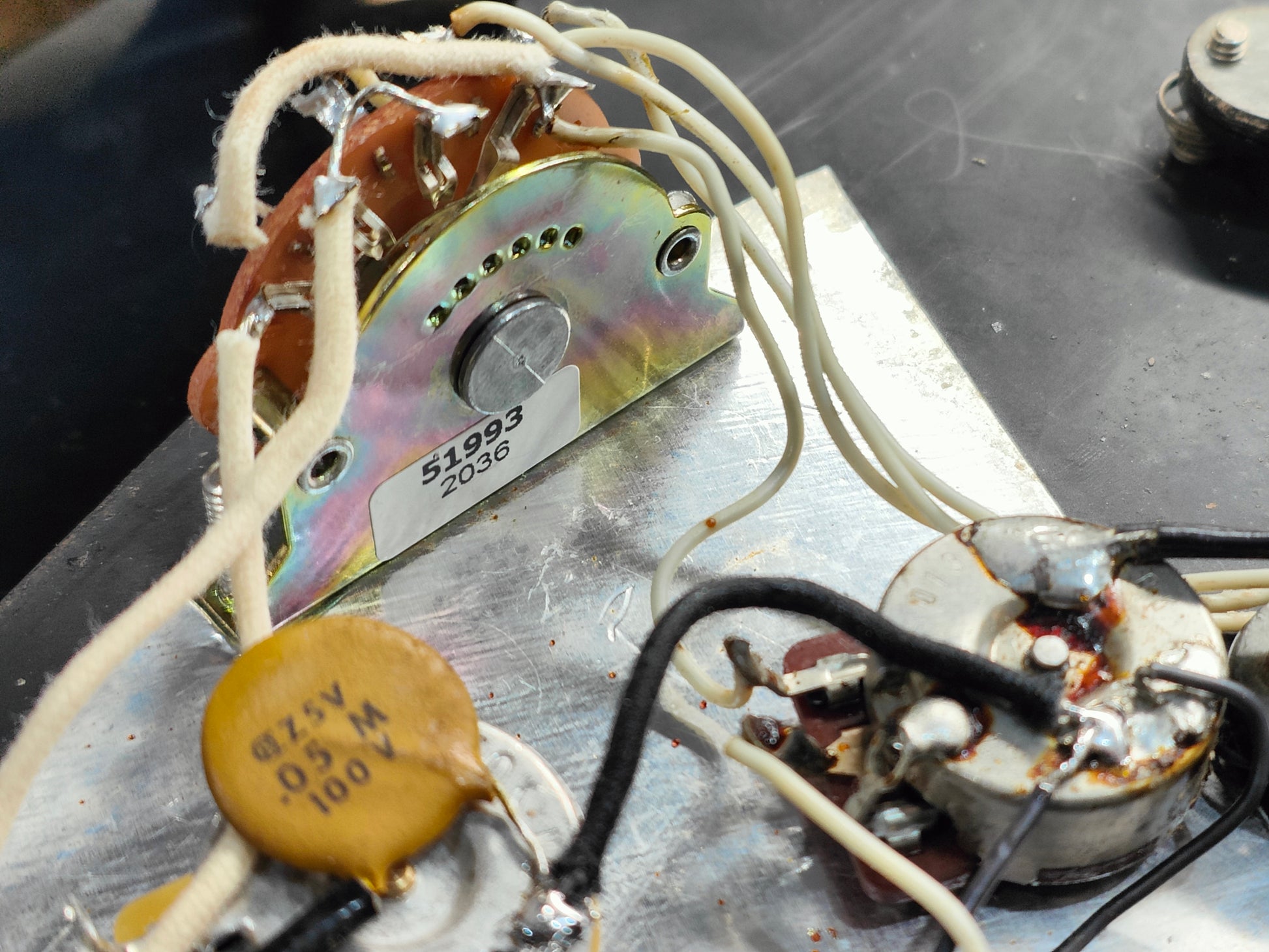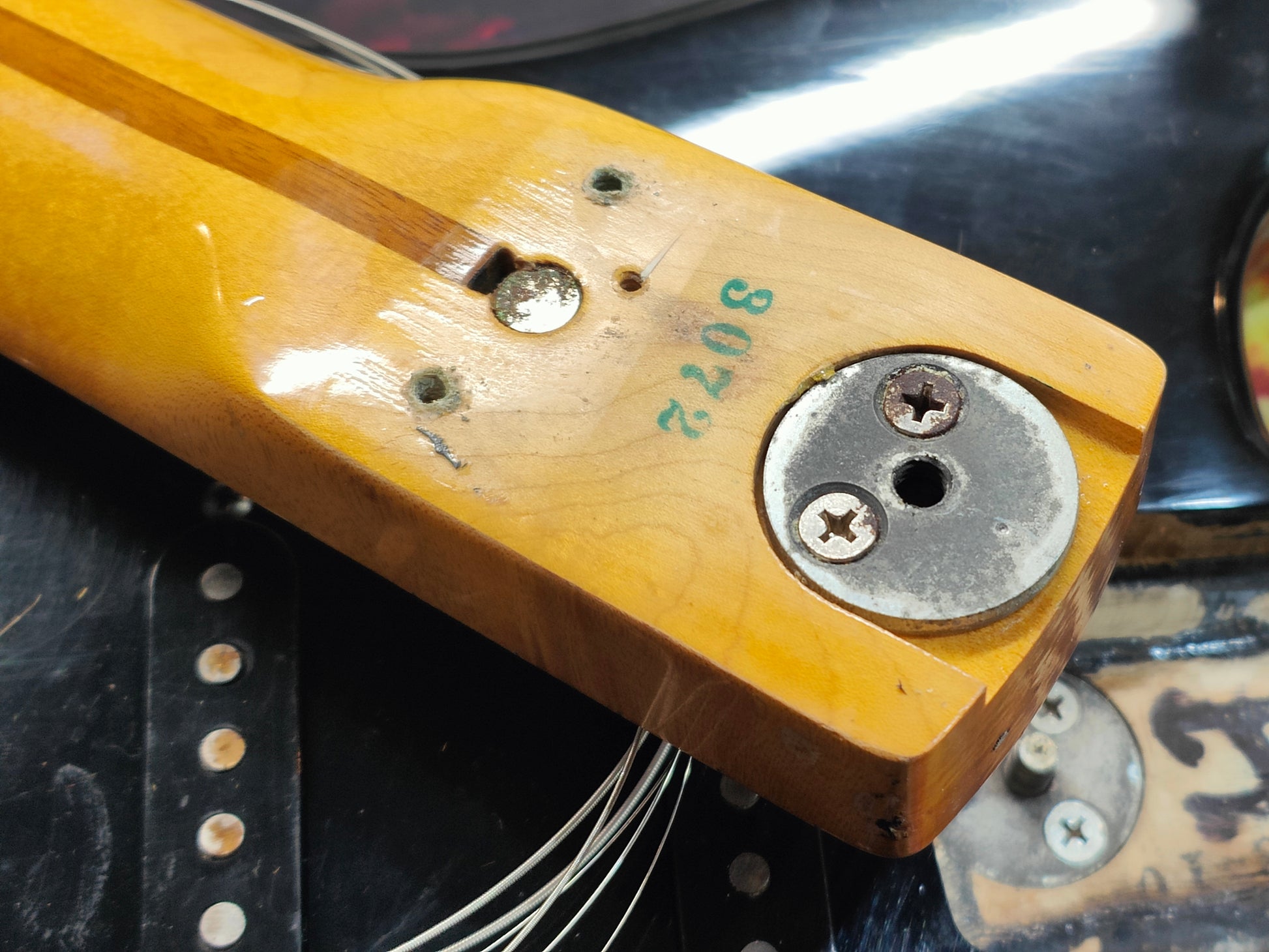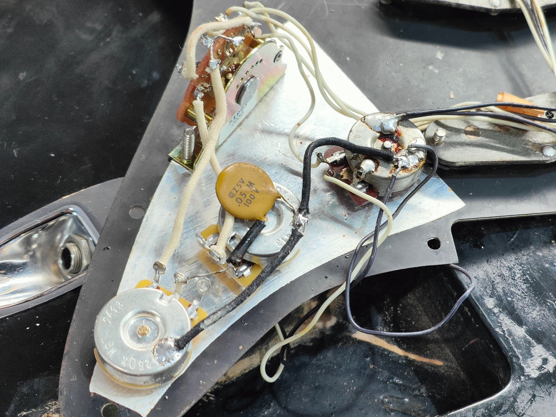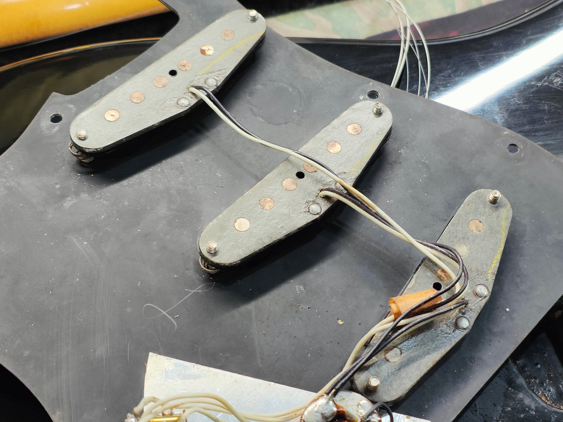 Loaded with the original pickups and one original pot along with two replacement pots and a fresh 5-way selector as pictured. The hardware appears all original with block saddles and F stamped tuners.