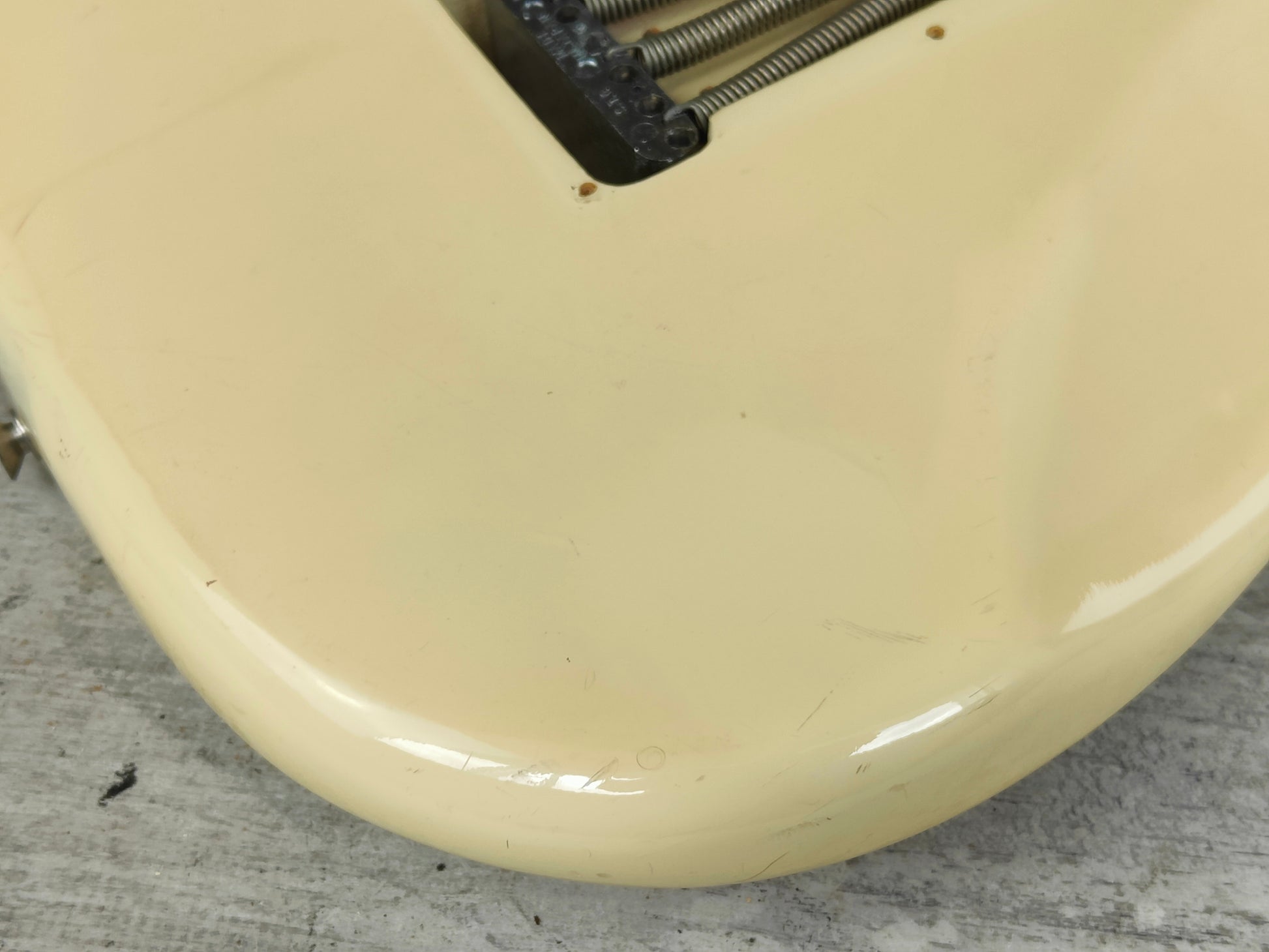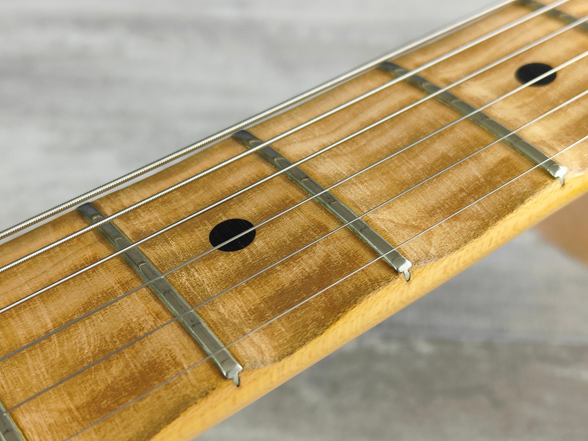 Good overall vintage condition as pictured with regular wear and cosmetic blemishes. The neck is nice and straight and the truss is adjustable, frets are clean with some light playwear but play smooth and are shiny with life left. The scallop work seems to be reasonably professional and is level across the fretboard, definitely not a DIY job.