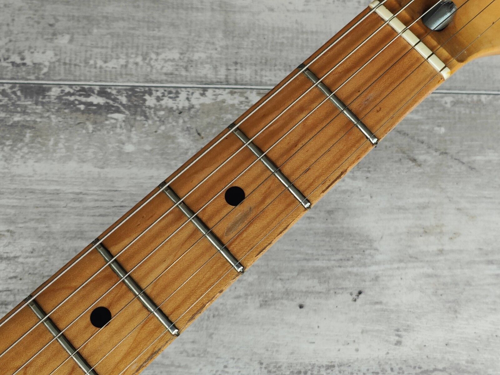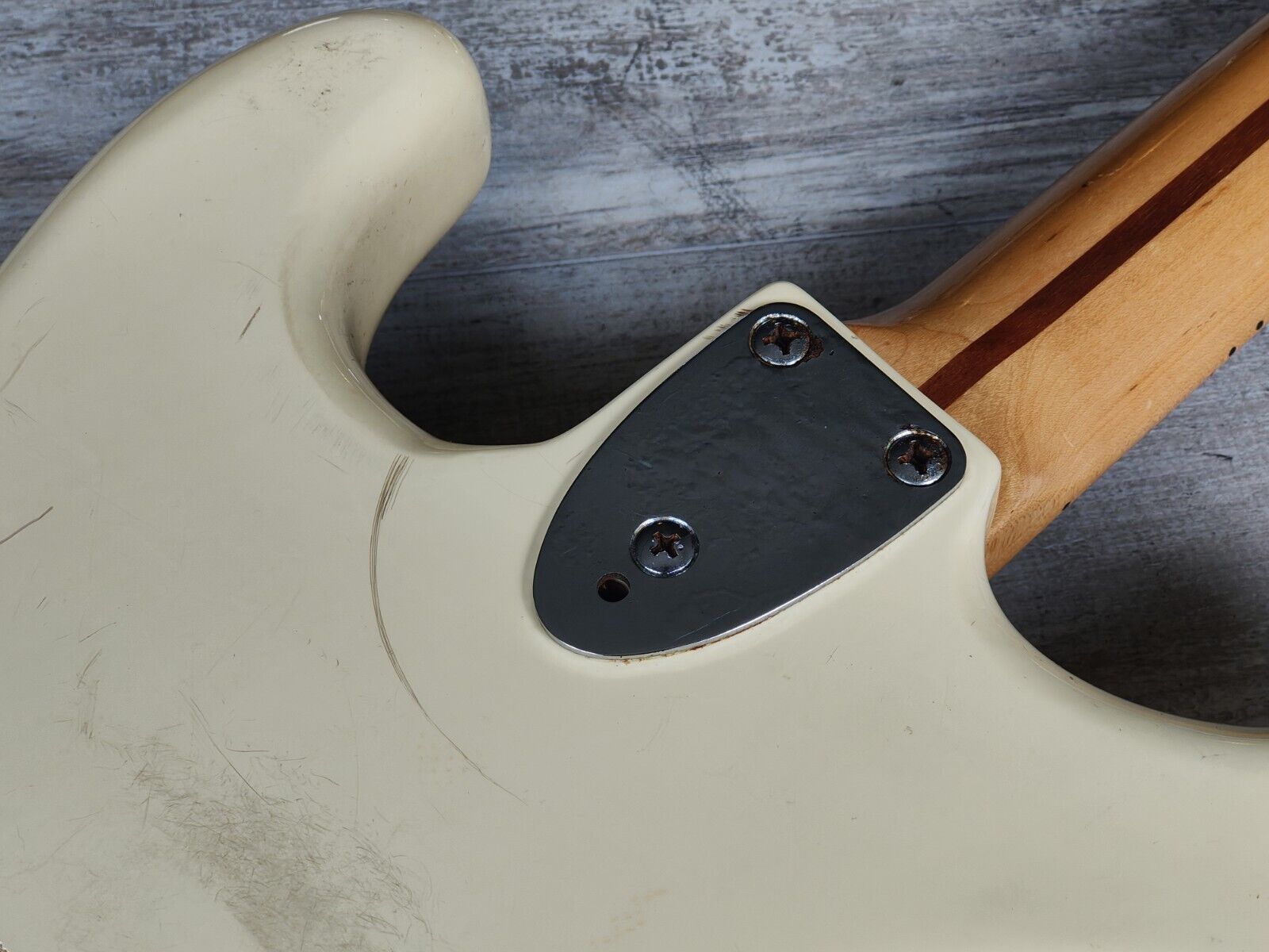 Japanese made in 1978, the FST-70 was the a mid-tier model from Fernandes. Glossy Vintage White finish on what's likely an alder body with a medium profile one-piece maple neck, it weighs 3.5kg's. This one appears to have the original alnico pickups with just a replacement volume knob and replacement string trees. The previous owner removed the headstock logo however the neck stamps are all still in there to help us ID it.