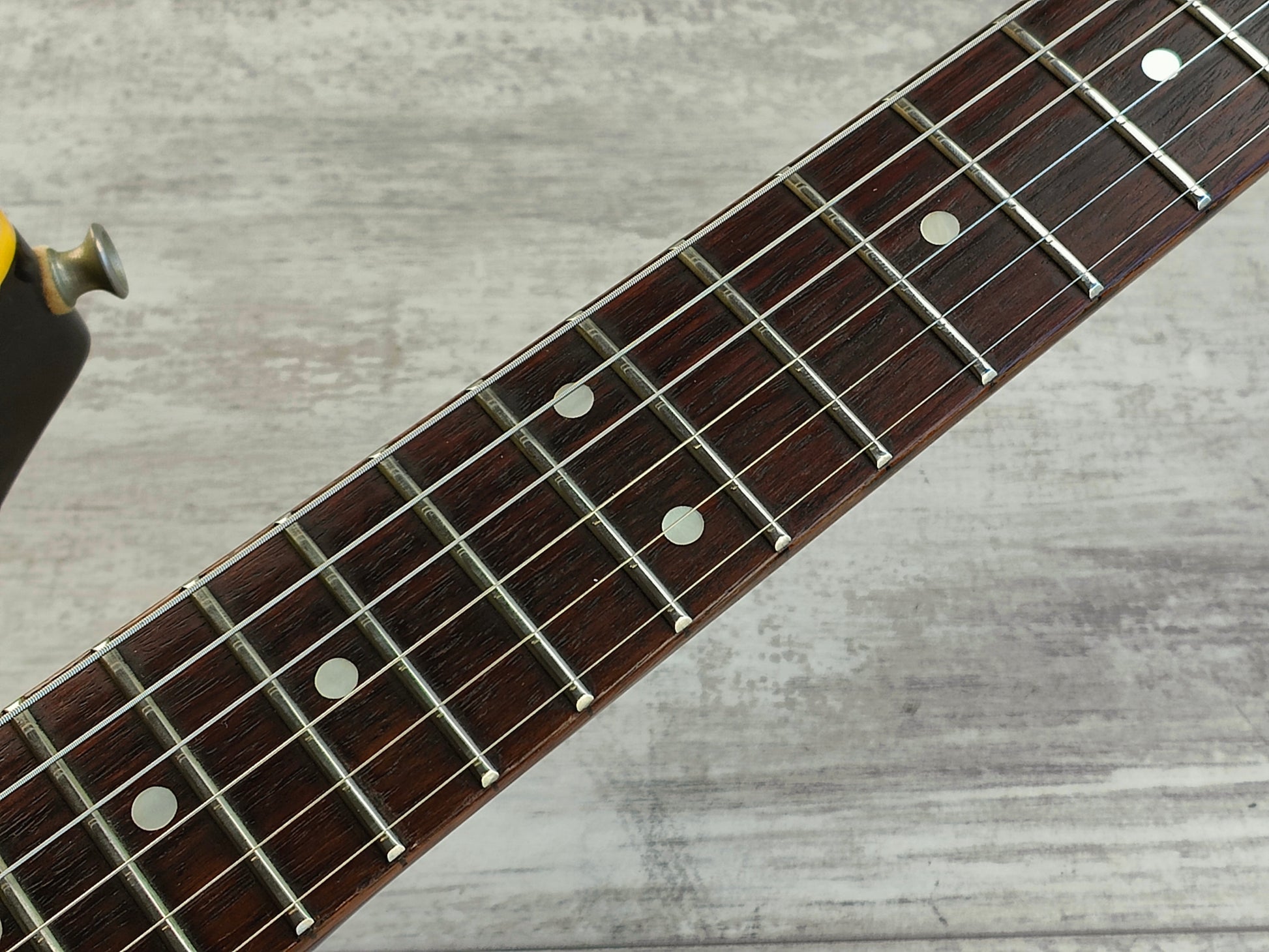 Good vintage condition as pictured with a few honest signs of wear and use but no breaks or repairs. The frets have some light wear but were polished prior to listing and play smoothly, the truss works perfectly and the neck is straight. Seems to be all original with the exception of some aftermarket knobs.