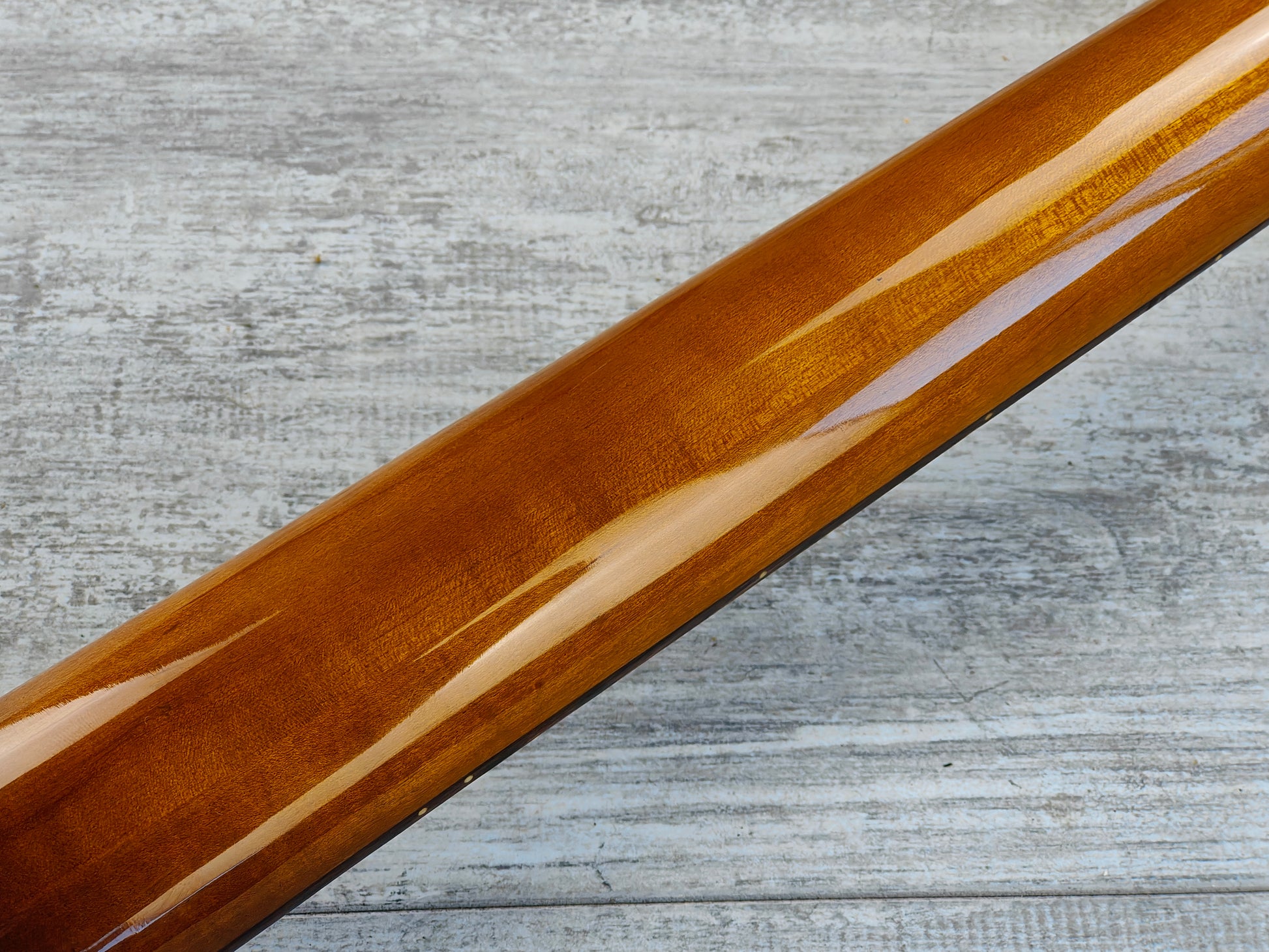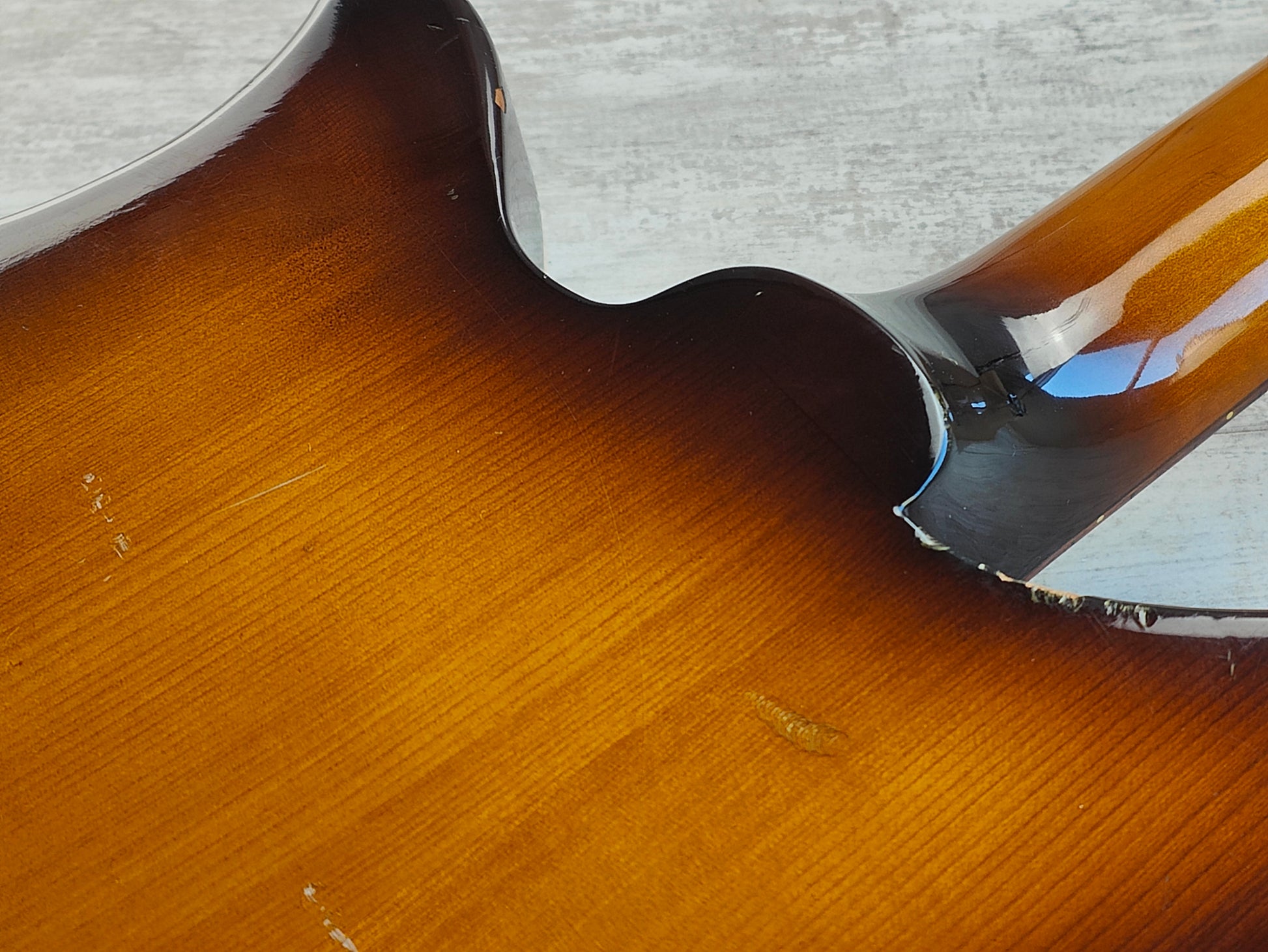 The Brawler is a compact, nimble design with a modified "tulip" ash body with a set maple neck and 24 fret rosewood fingerboard (628mm scale length), weighs in at a reasonable 3.6kg's. Loaded with a pair of original Maxon single coil pickups and the famous GO style floating tremolo system (missing the arm). Wiring includes two volume knobs, a master tone control and a series/parallel pickup switch.