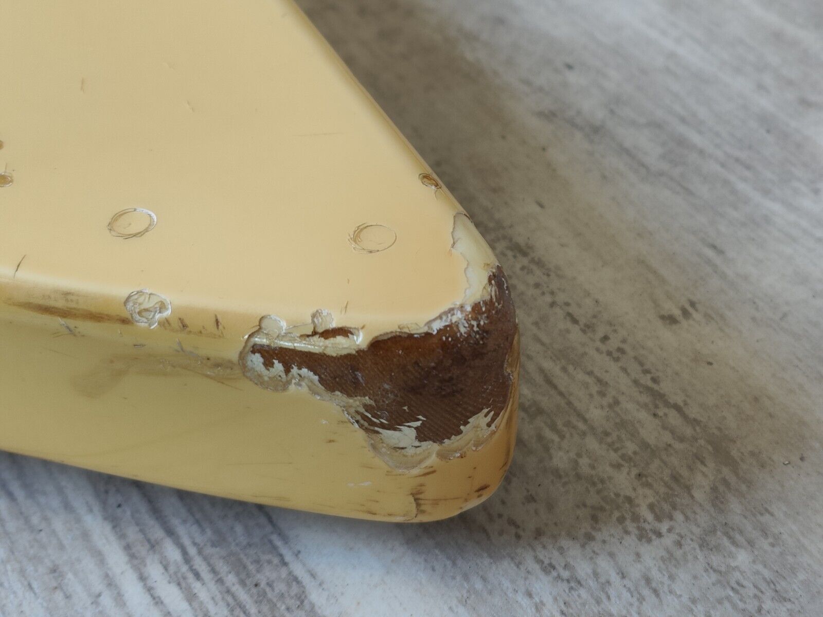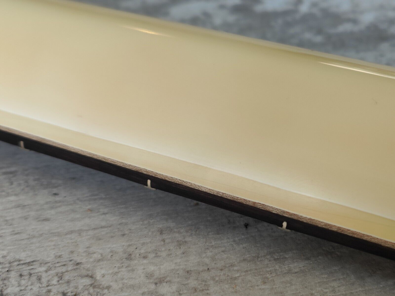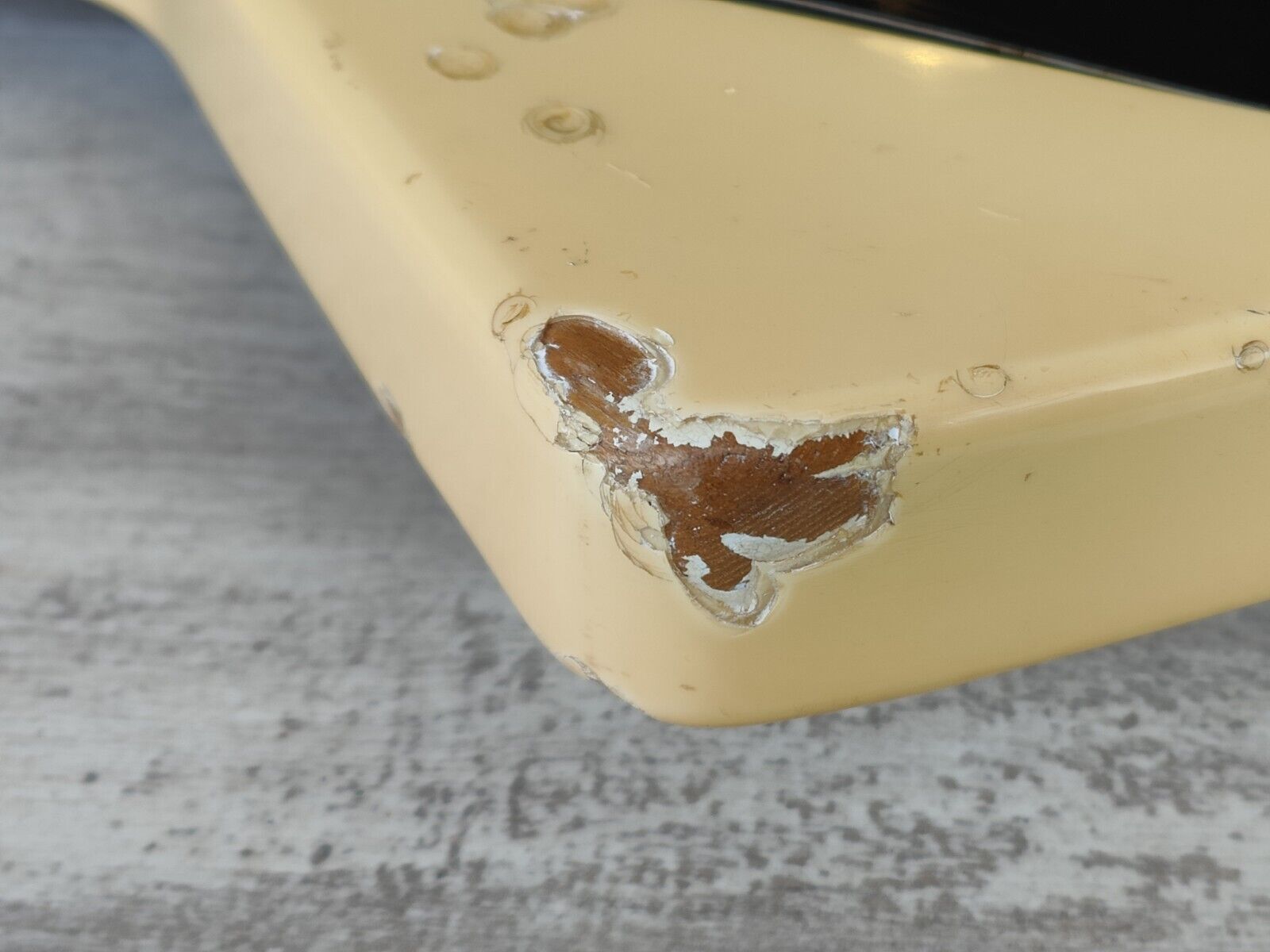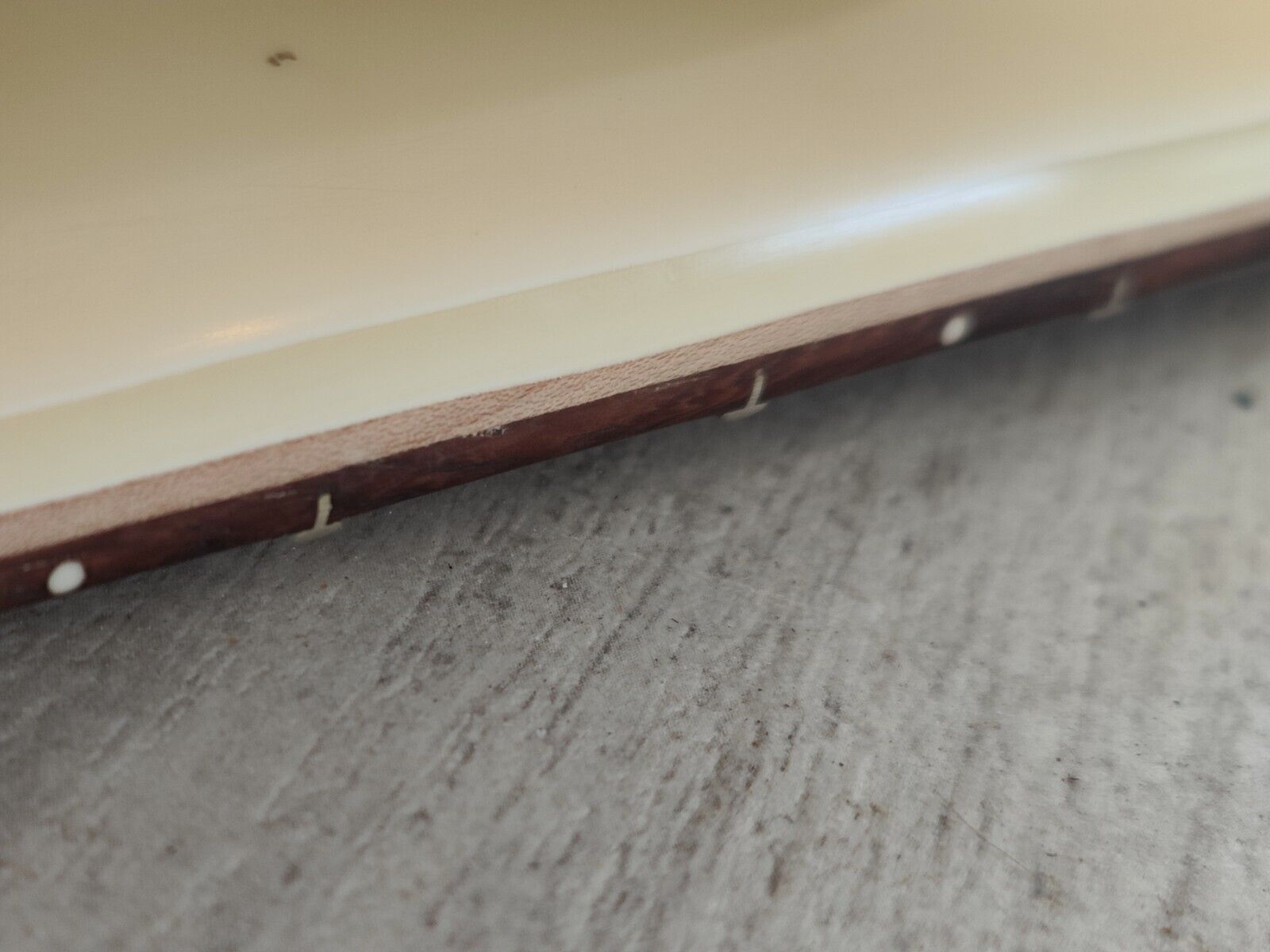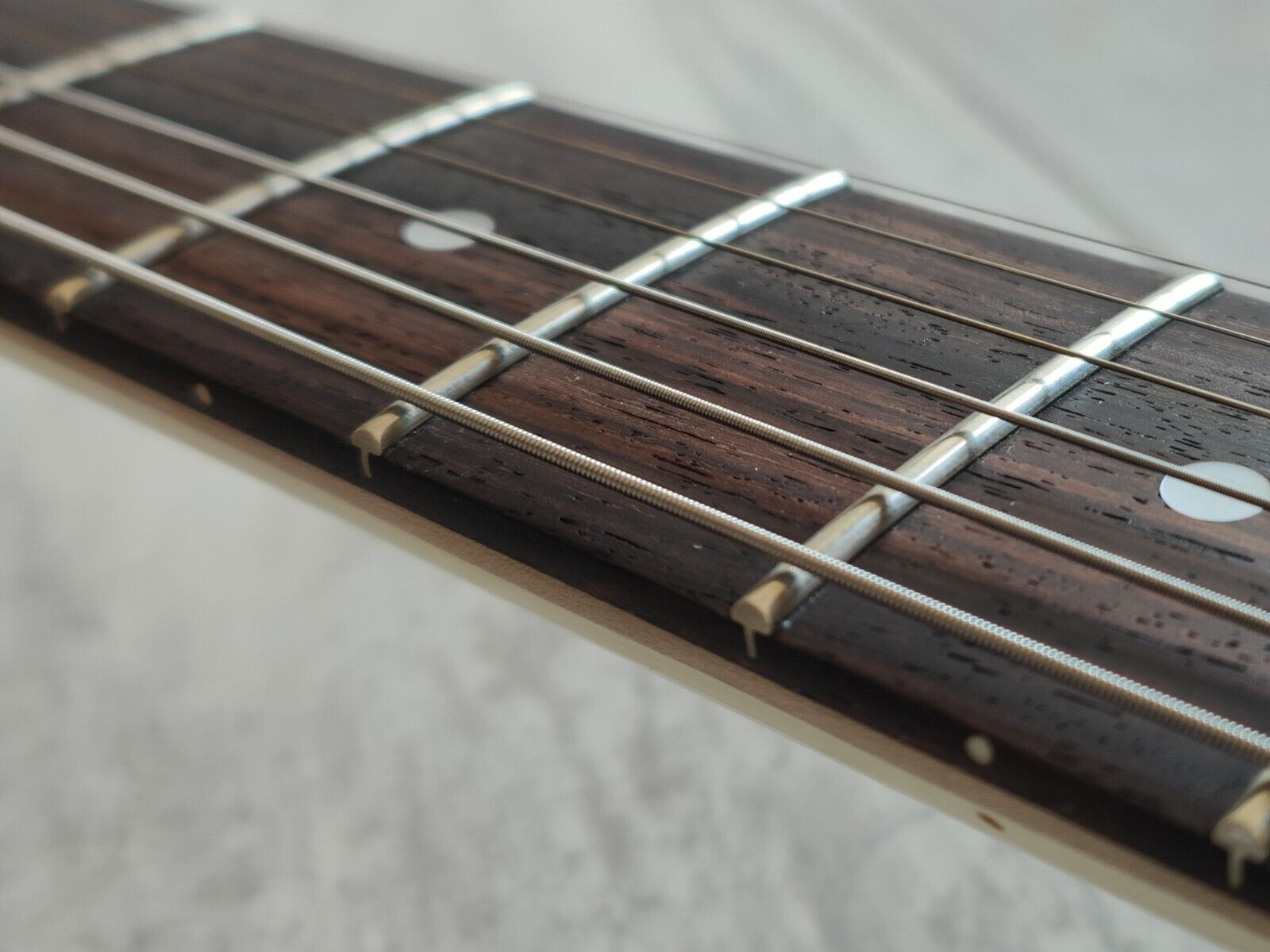 This one came to us in a very sorry state and was completely rebuilt by our in-house tech Vaughan. The fretboard was completely re-radiused to remove a very shallow scallop attempted by the previous owner. There's still plenty of depth left in the neck with all the inlays on both the top and side of the neck still perfectly visible. The back of the neck was lightly sanded and buffed back to a satin feel along with the paint being removed from the side of the fingerboard to create a smoother playing experience. It was then re-fretted with brand new jumbo frets and set-up with a smooth low action. Cosmetically there are plenty of bumps and bruises on the finish as pictured.