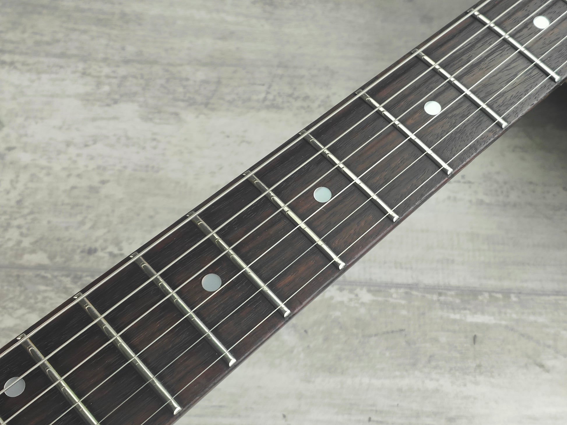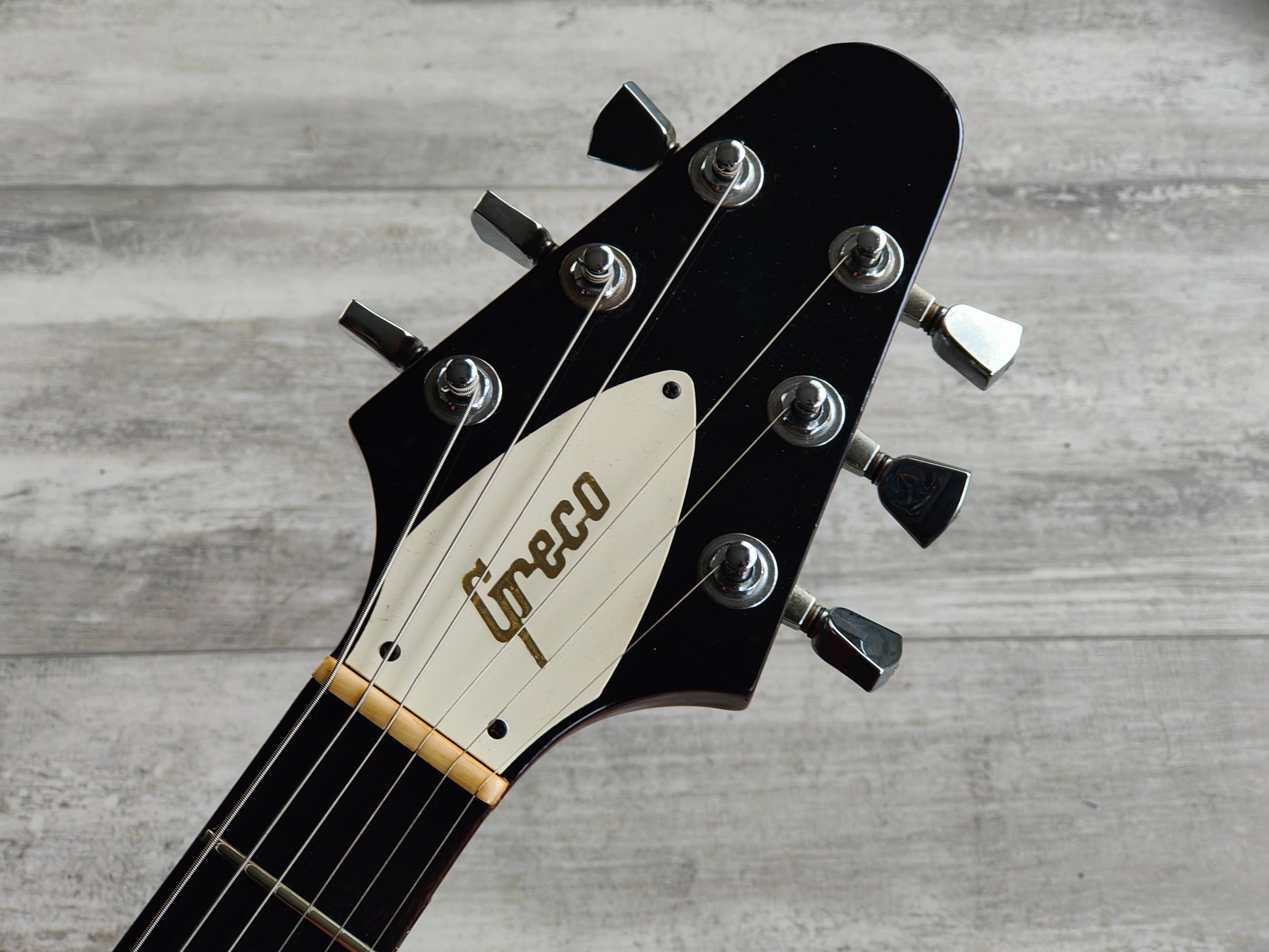 Made by the Fujigen factory in 1978, this is the Greco FV-600 '67 reissue Flying V. Mahogany body with a slim 60's profile mahogany neck and a 22 fret rosewood fingerboard with dot inlays, it weighs 3.5kg's. Loaded with the original Maxon humbuckers along with the original bridge, tailpiece and Greco branded tuners, it's got a replacement tone pot and cap otherwise appears all original.