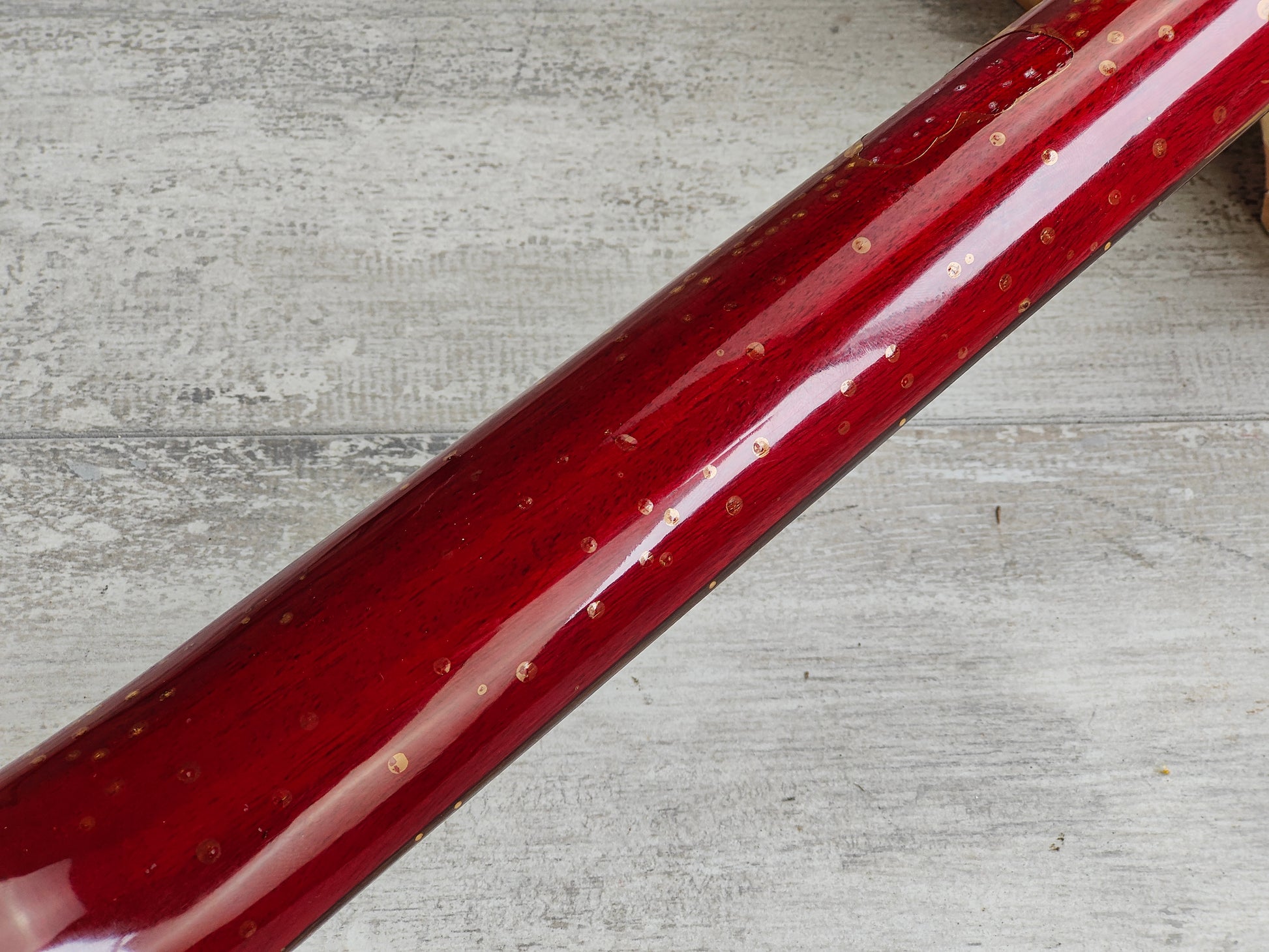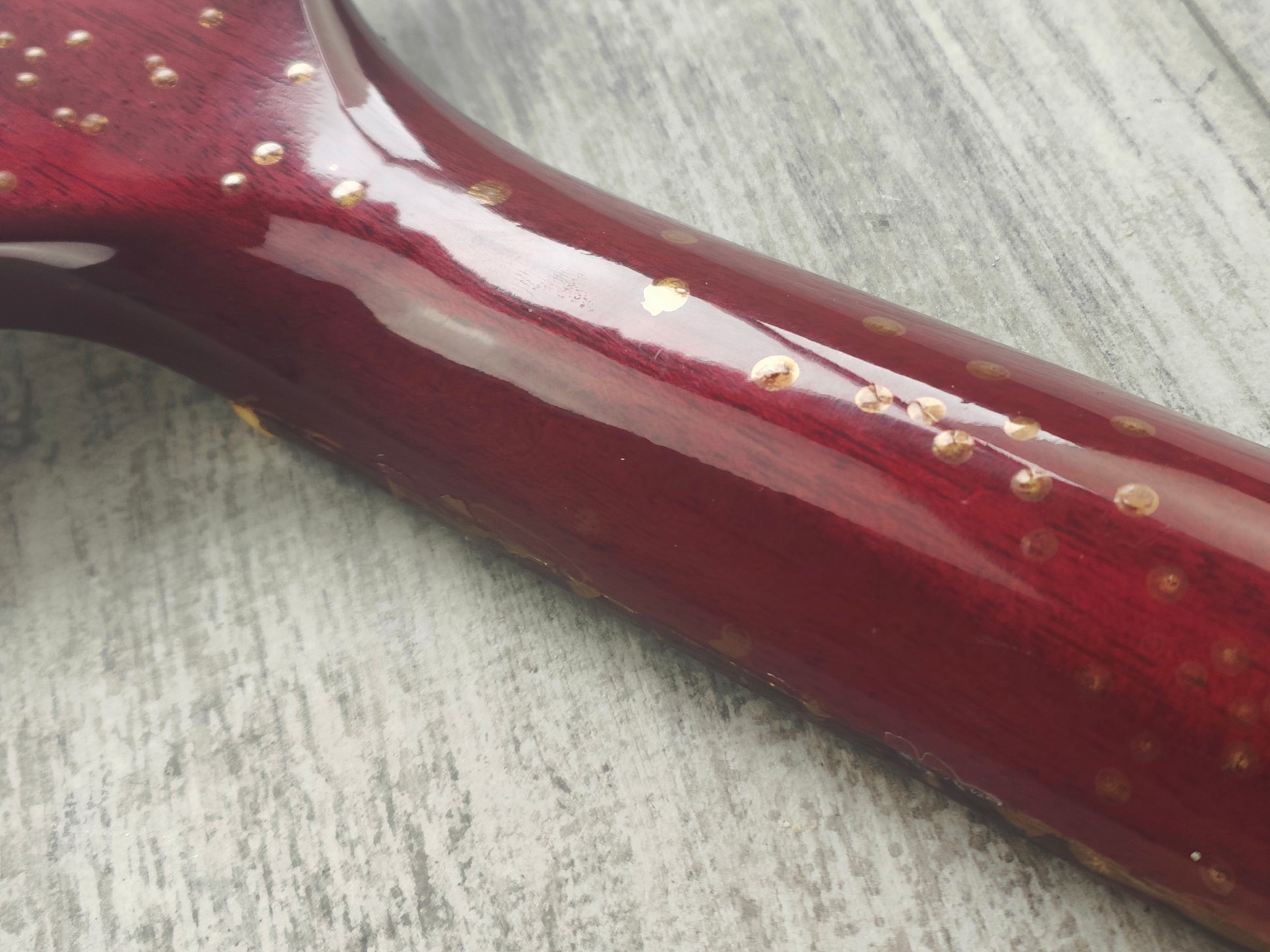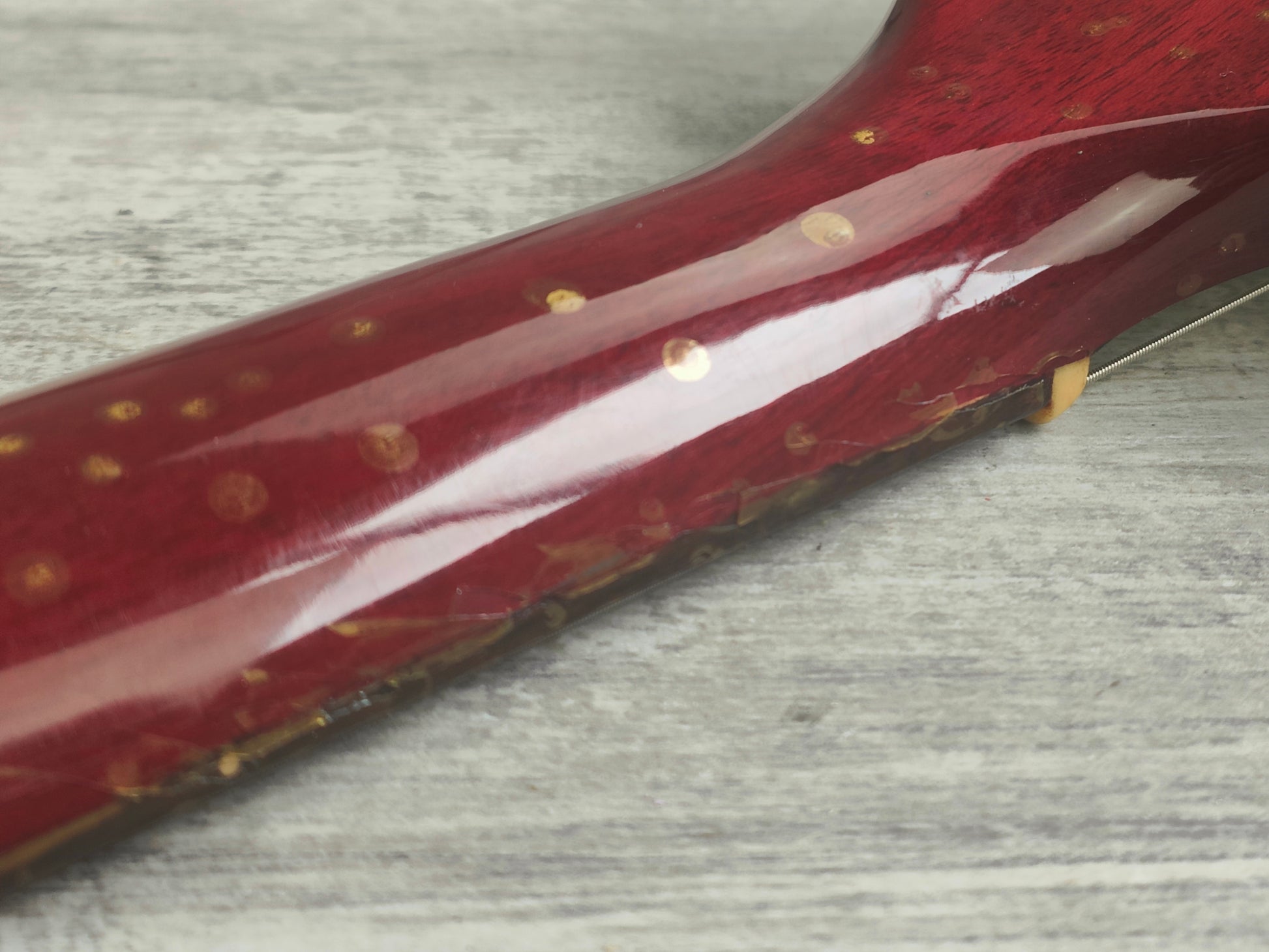 Overall it's in pretty well used vintage condition with plenty of signs of wear from 40 years of use. The frets are shiny with some wear but have life left and the truss works as it should, the neck is straight and plays smoothly. There's a small repair on the side of the neck as pictured where the fretboard has been partially reglued to the neck and there's some clear coat peeling off on the neck and body.