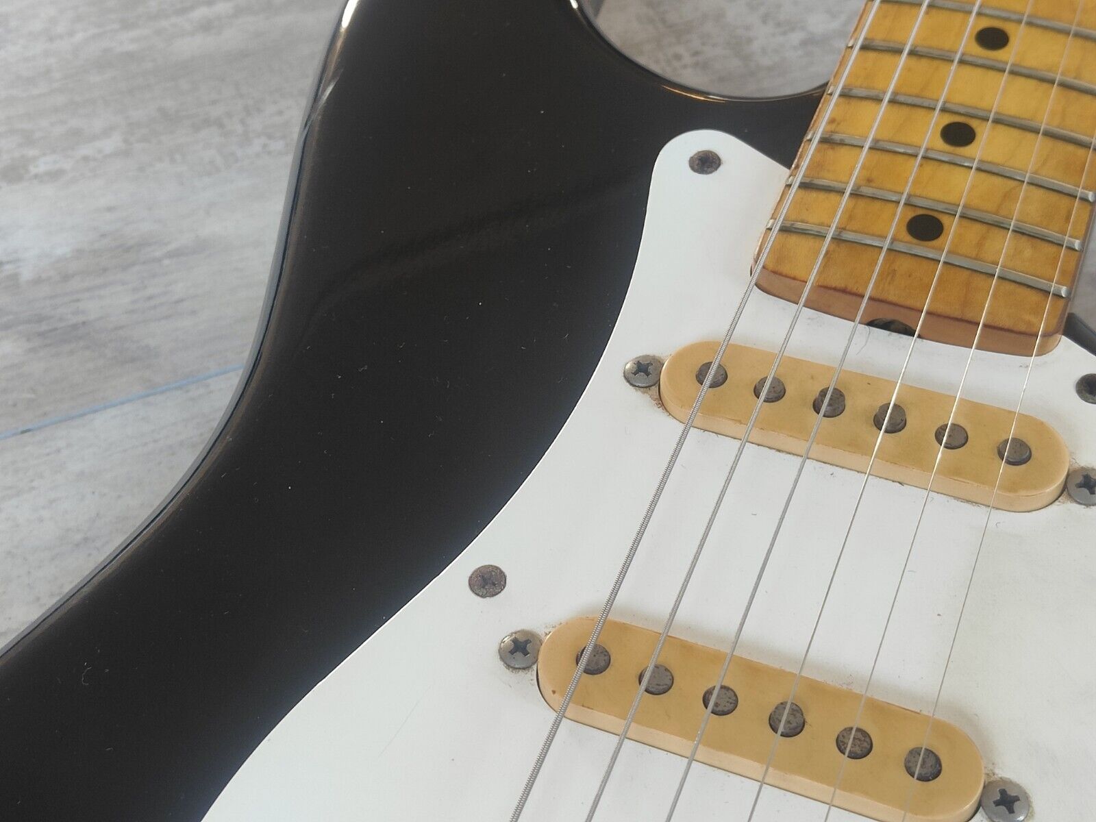 Made in Japan 1978, the ST-42 Springy Sound was Tokai’s base model replica of the '58 Fender Stratocaster. Sen ash body with a gloss black finish bolted to a U profile maple neck (7.25" radius), it weighs 3.6kg's. Loaded with the original U stamped ST Vintage MKII alnico single coils along with Tokai stamped saddles and the original CBS style tuners, it seems to be factory stock other than what look to be replacement knobs.
