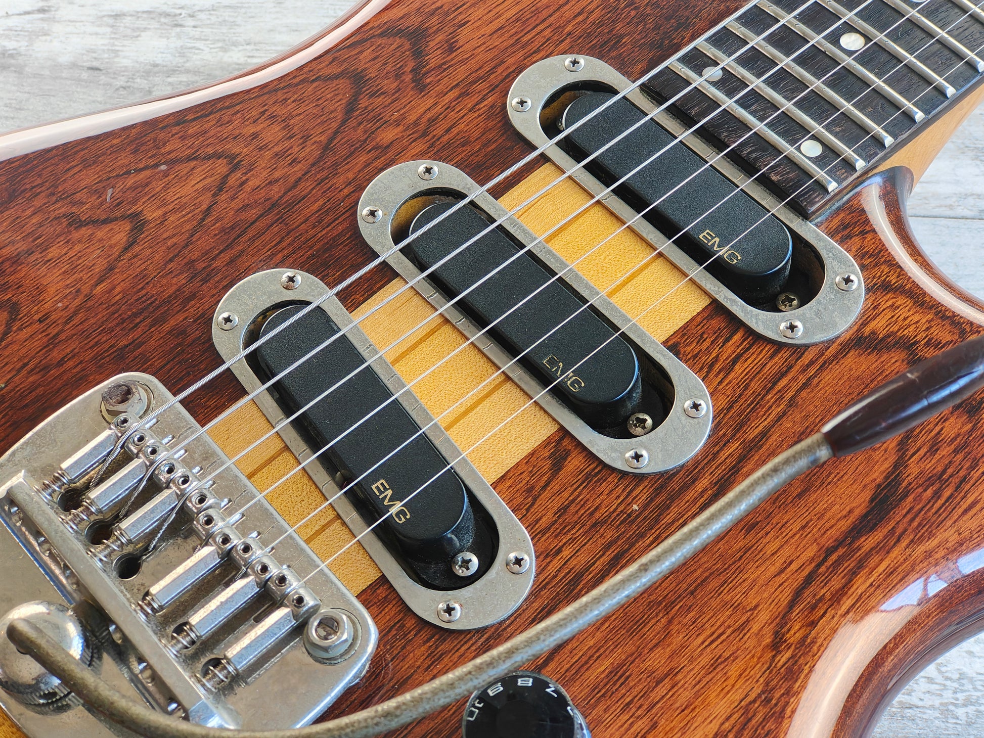 Loaded with a set of active EMG's controlled by two volume knobs (one for the bridge/neck pickups and one for the middle), a master tone control, a three-way pickup selector, phase switch and a mini toggle to turn the middle pickup on/off. Seems all original as pictured including Greco Deluxe stamped tuners and a combination bone/brass nut.