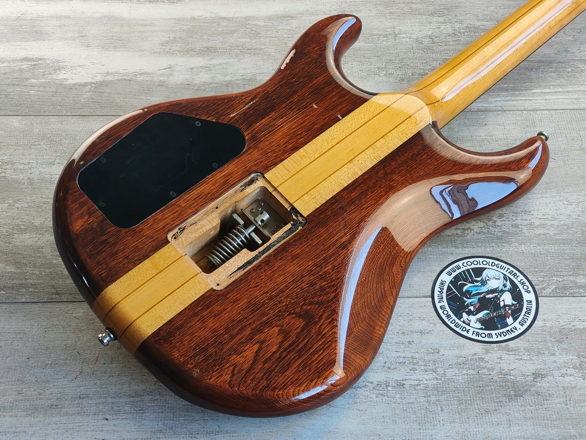 Made in Japan (by the Fujigen factory) in 1979, the GO series were aimed at competing with the Ibanez Musician models that were starting to surface in Western markets. The GOII750 was Greco's highest end GOII model and features a maple/walnut neck with dark brown stained ash wings, rosewood fingerboard (628mm scale length, 24 frets) and weighs 3.7kg's.