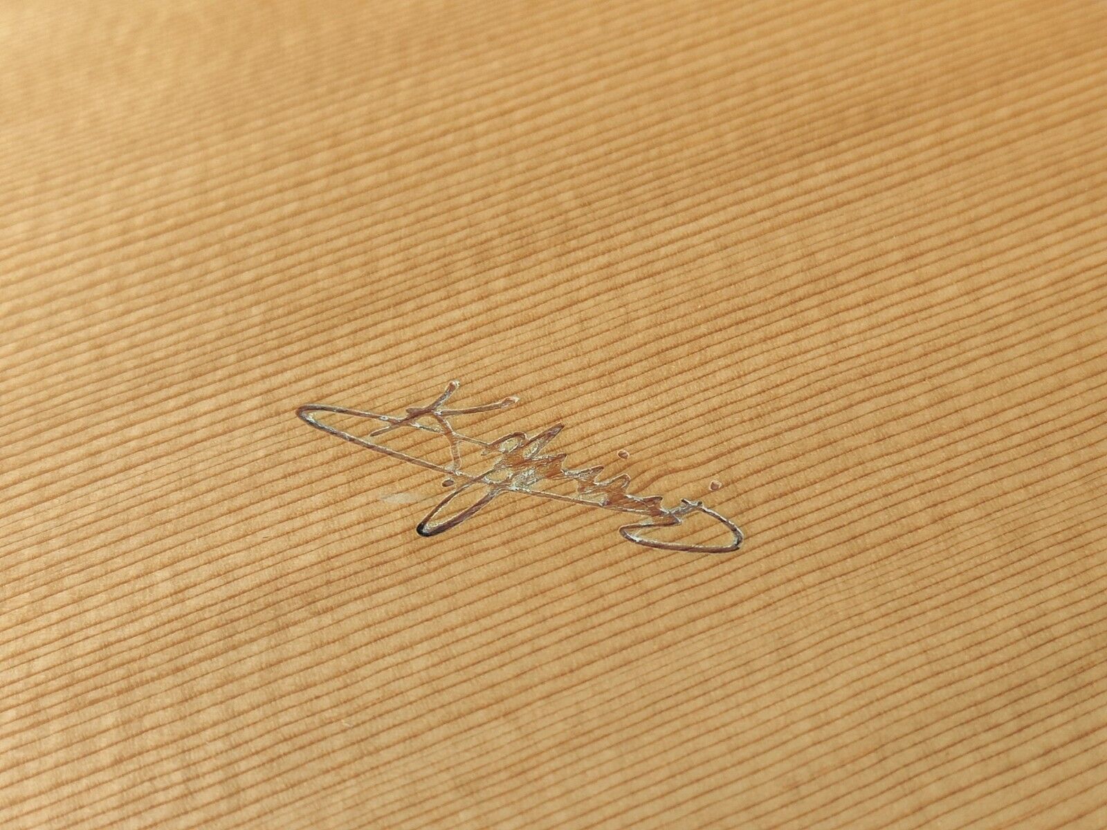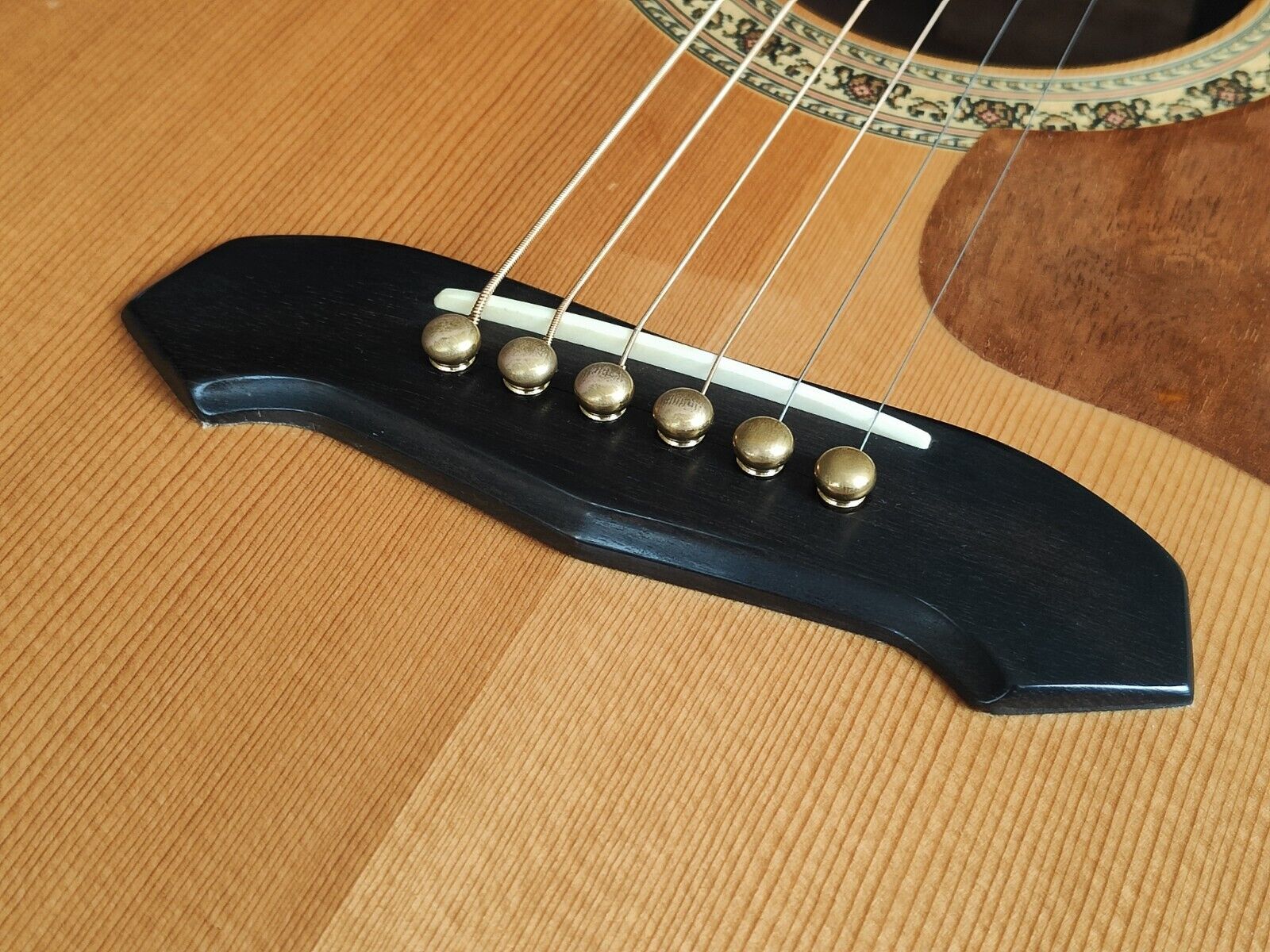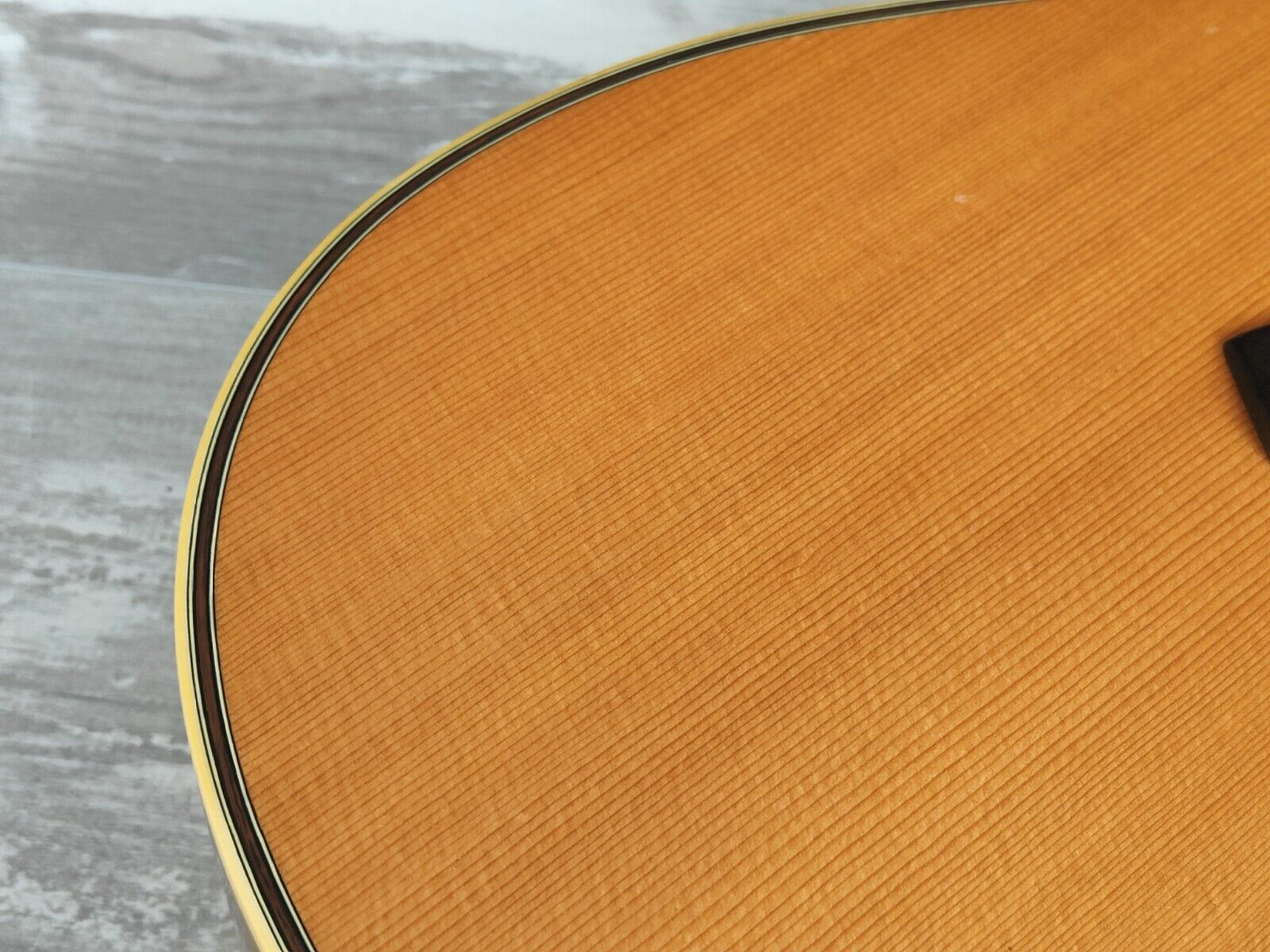Made by K Yairi in Japan in 1979, the Leo-J2 has a solid spruce top with a figured mahogany back/sides, ebony bridge and fingerboard, mahogany neck with a slight V profile (44mm nut width), it weighs 2kg's. Includes Yairi branded case. Rare to see these with the K Yairi branded signature in the top!