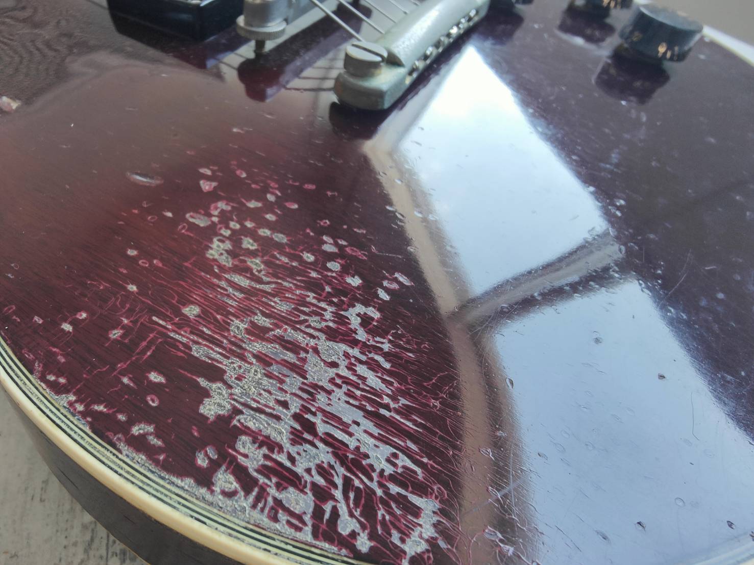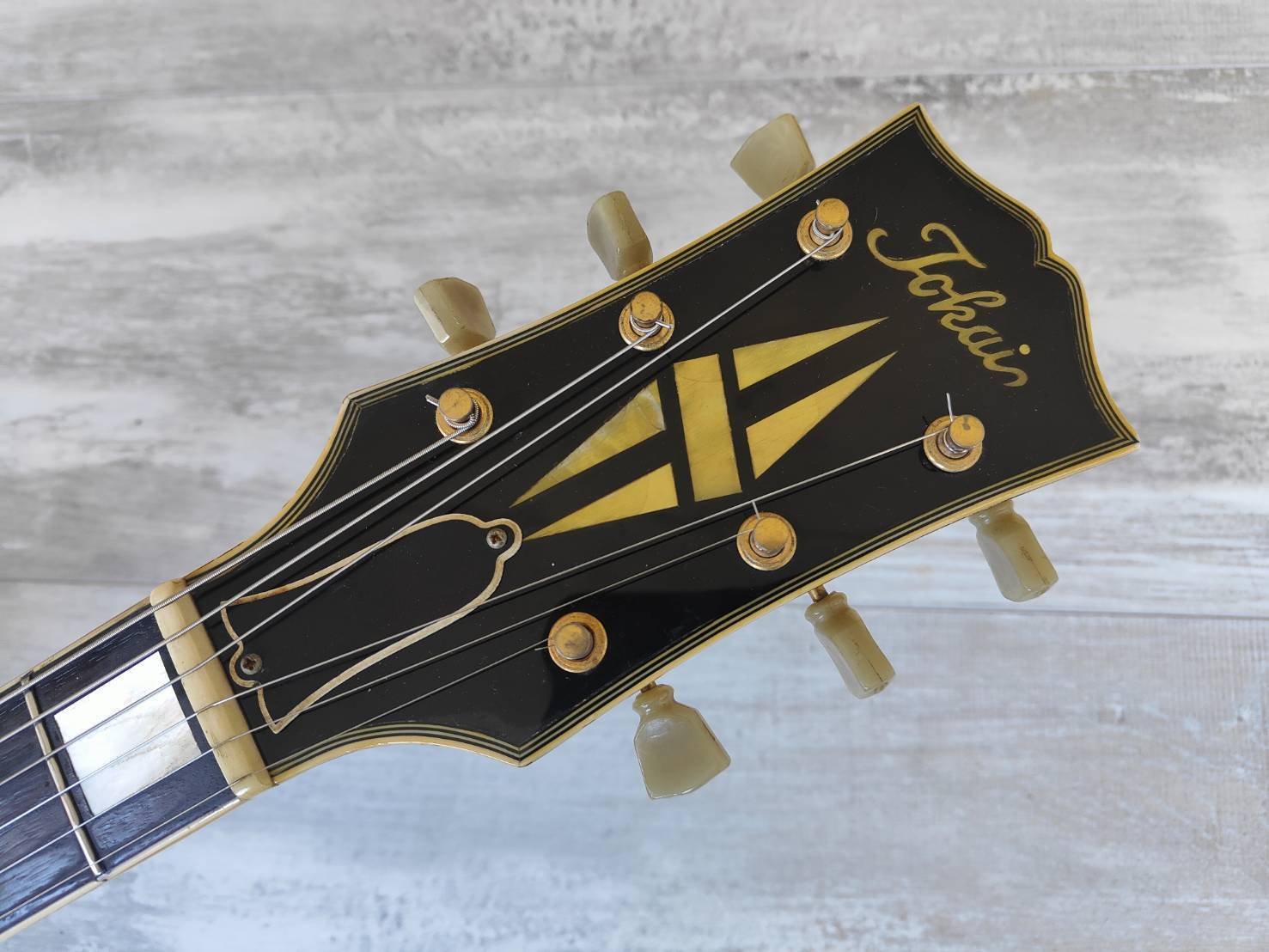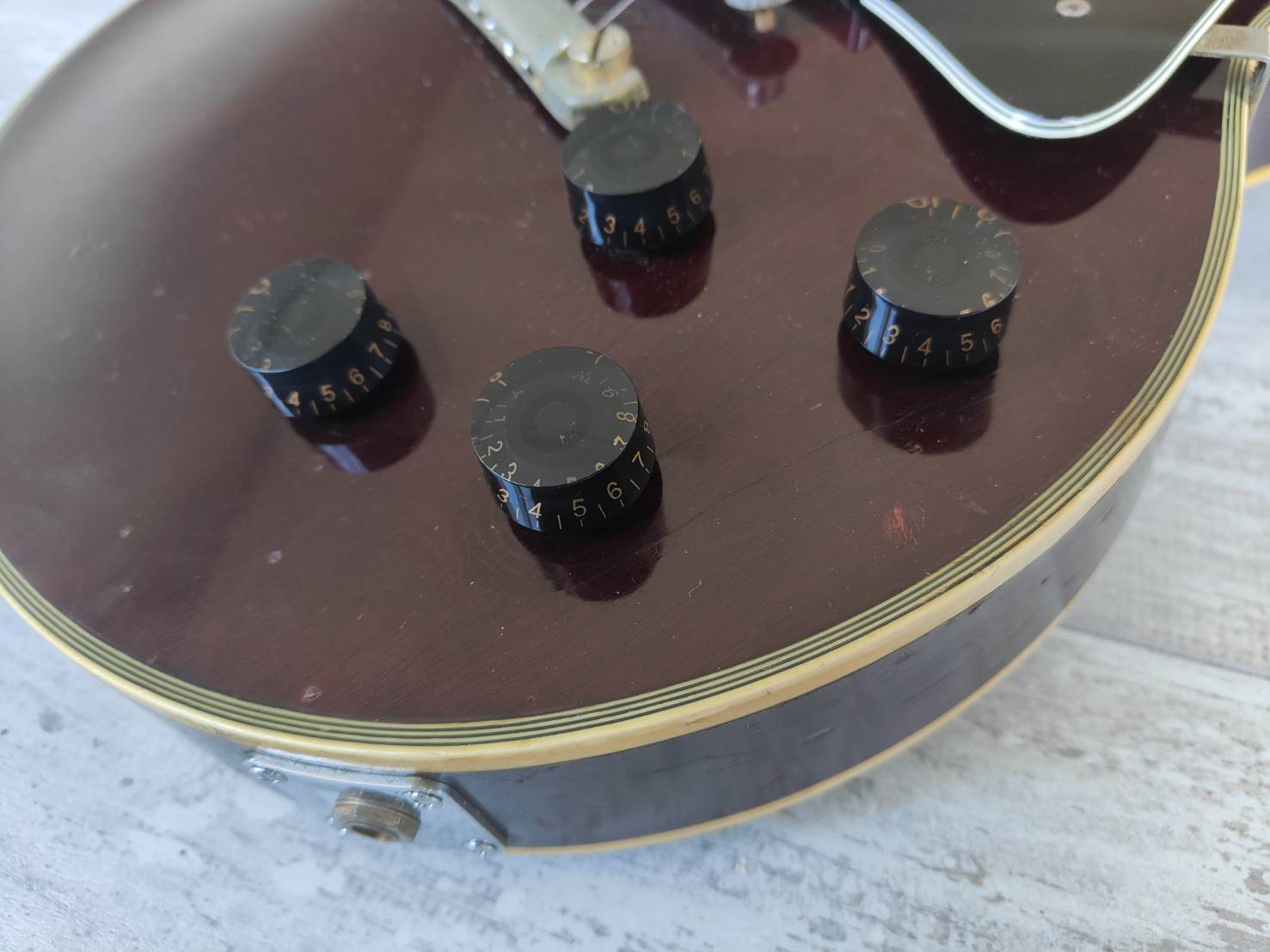 This one seems to be all original except for the knobs and the output jack plate. Aged gold-plated hardware, Kluson "waffle-back" tuners, Gotoh PAF pickups and PCB mounted pots. Full Gibson aesthetic with the open-book headstock and Gibson inlay patterns.