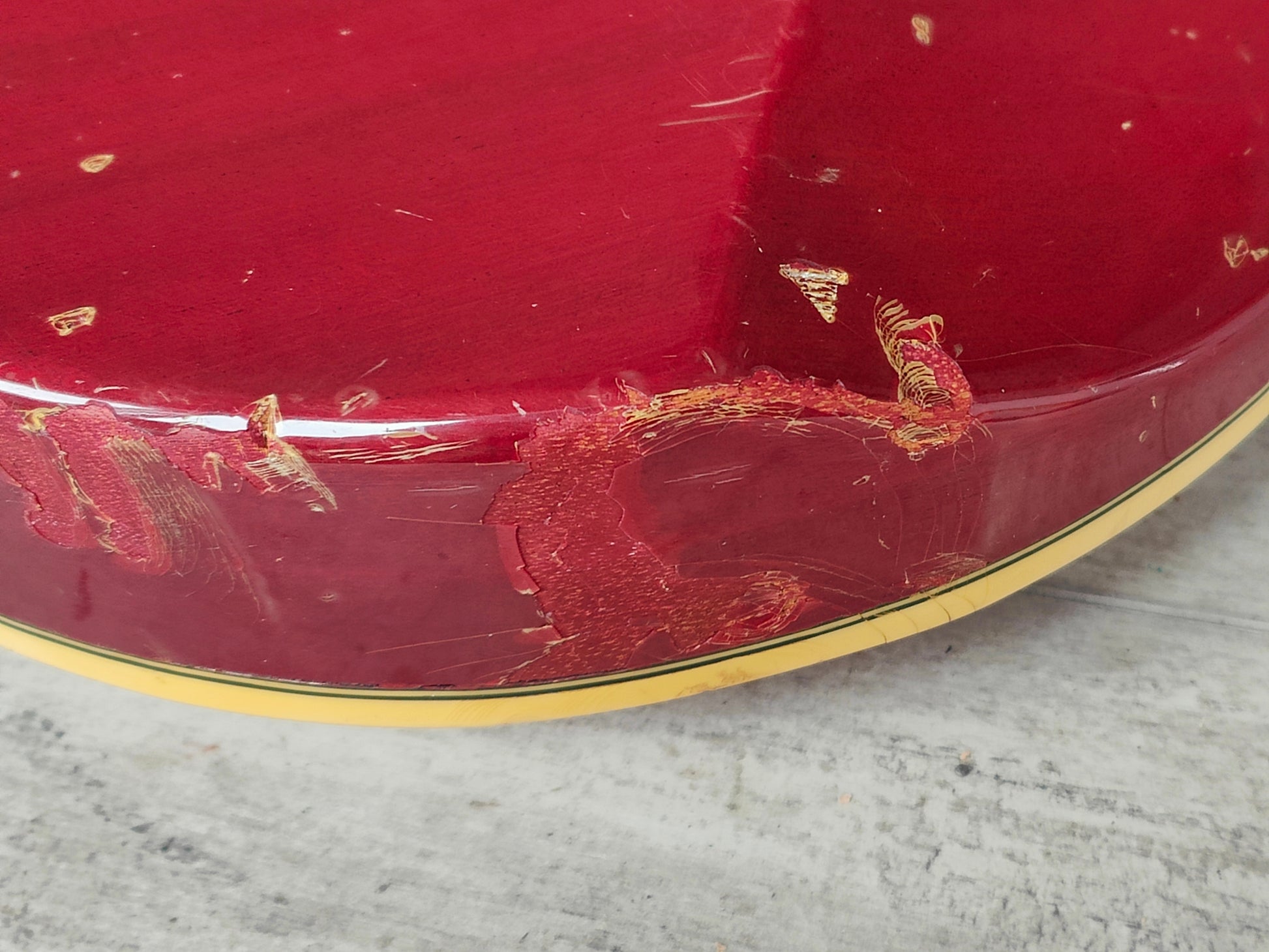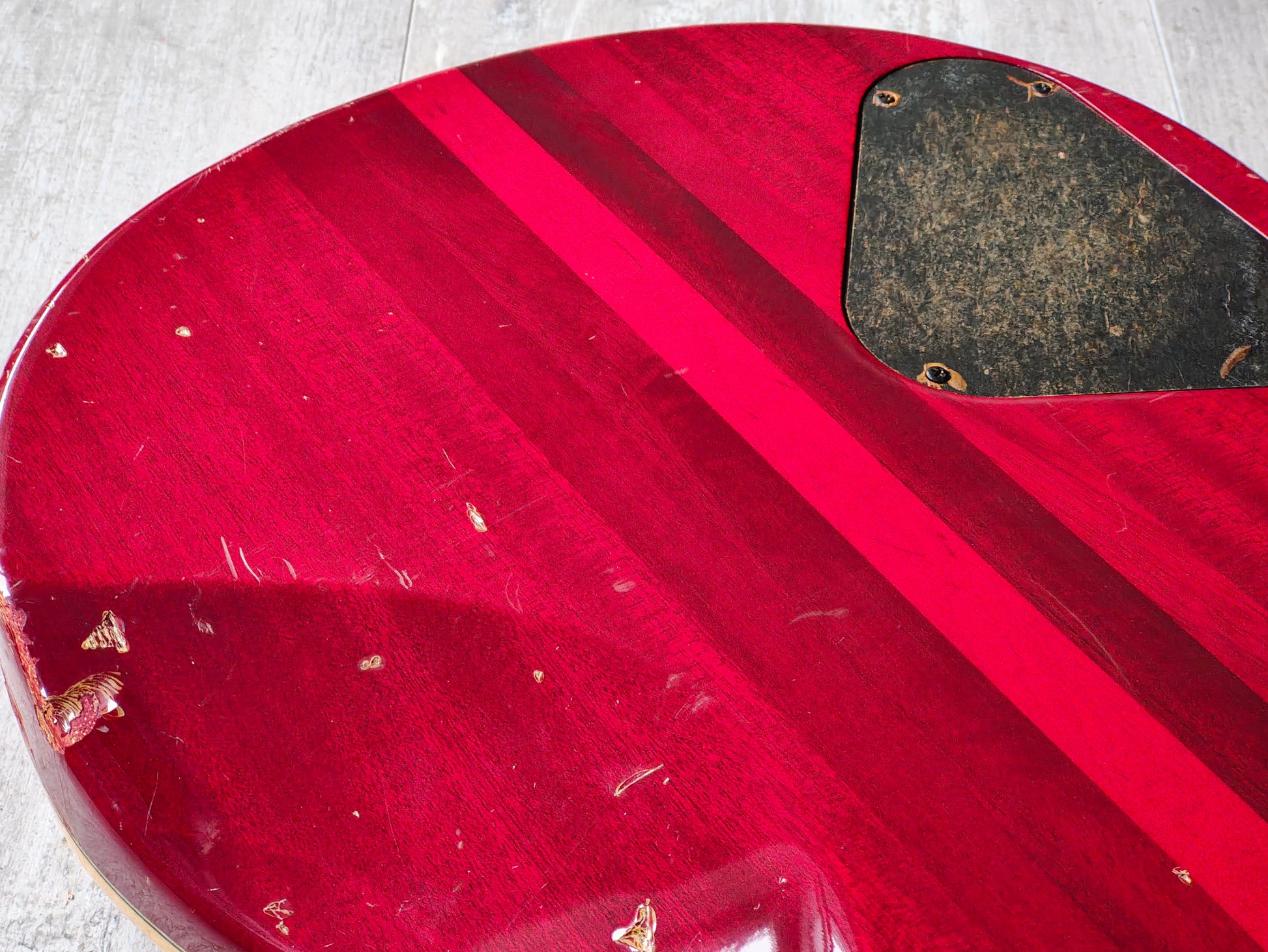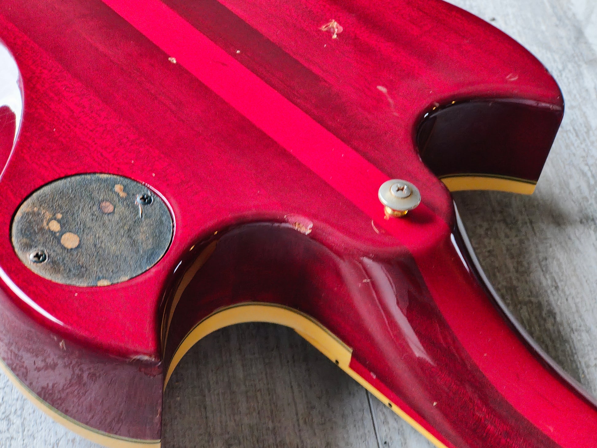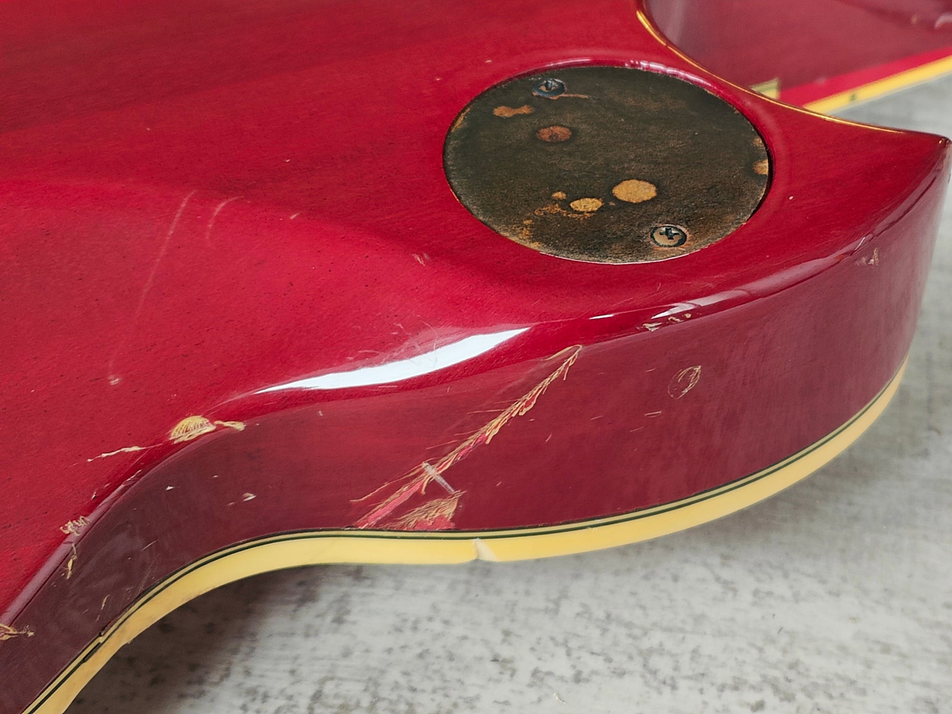 Well used vintage condition as pictured with a few chips to the top/side of the body and general signs of cosmetic wear from use, no structural repairs or breaks and it appears to be completely original. Received a professional setup and service including a fret polish and electronics service. Frets are in solid condition for it's age and have life left.