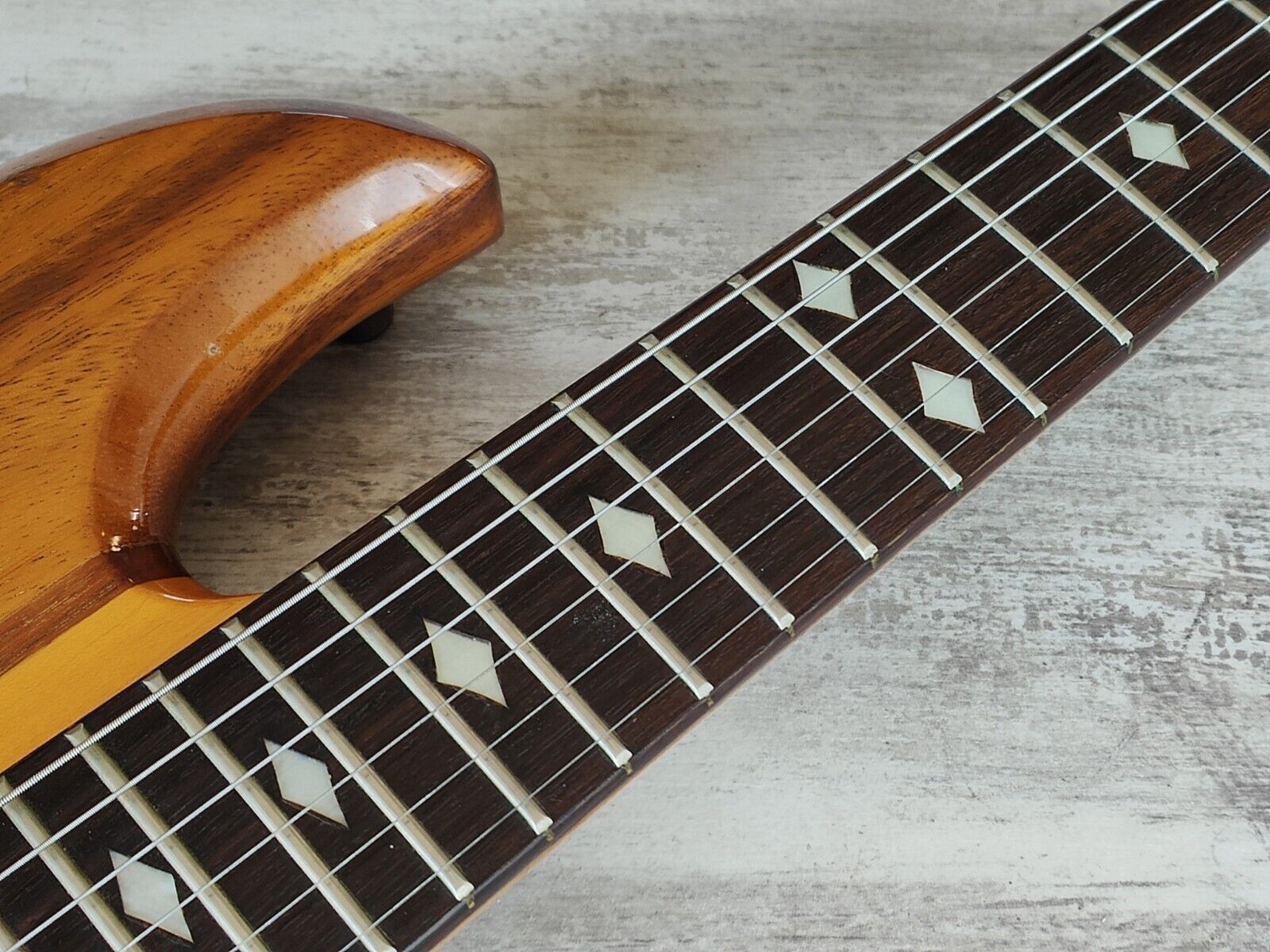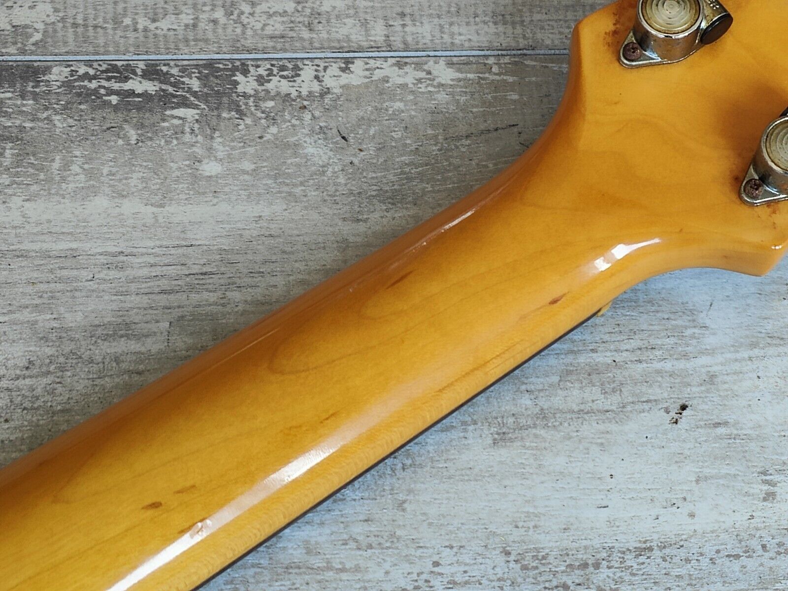 Clean overall vintage condition as pictured with regular wear and cosmetic blemishes. There's some slight separation in the finish along the factory joins on the body/neck and a few small bumps and bruises but no structural damage or repairs. The neck is nice and straight and the truss is adjustable, frets are clean with some light playwear but play smooth and are shiny with plenty of life left.