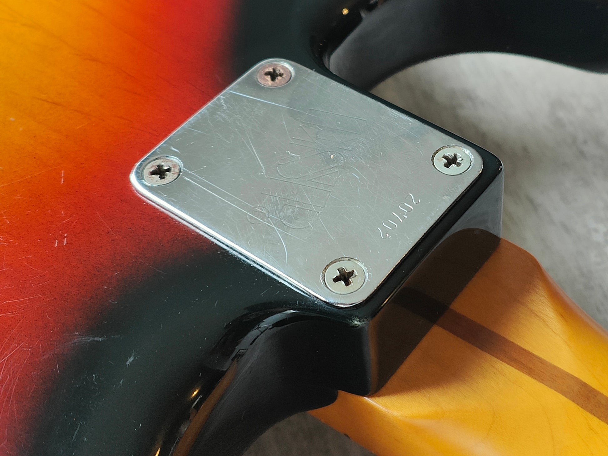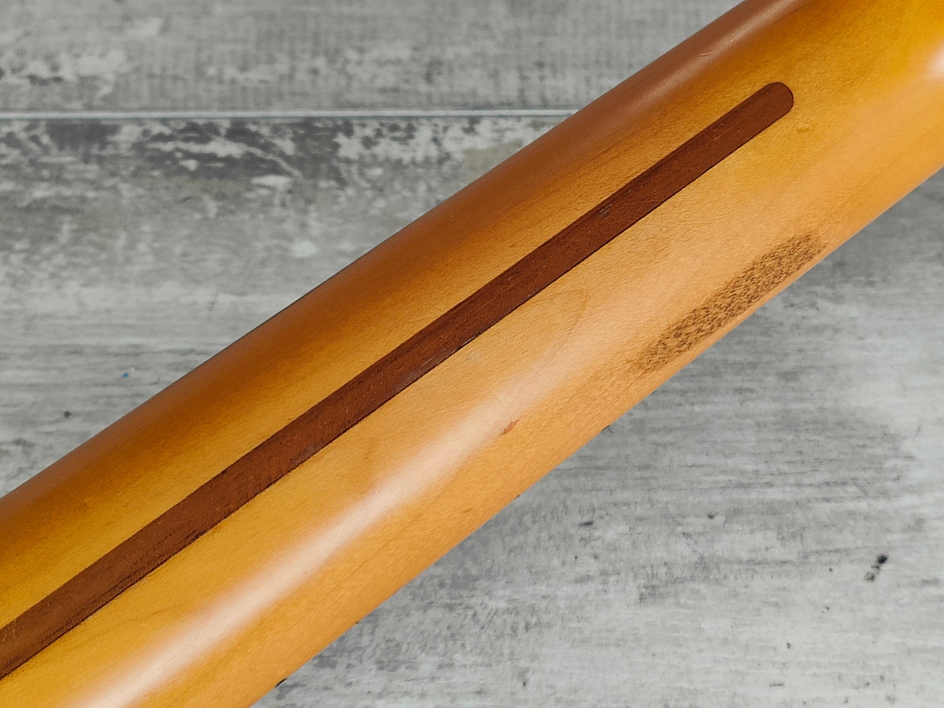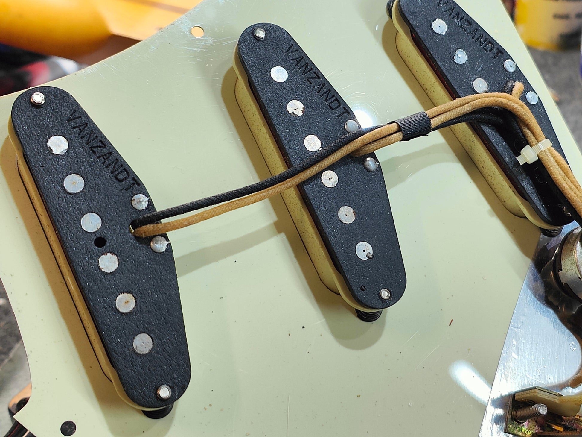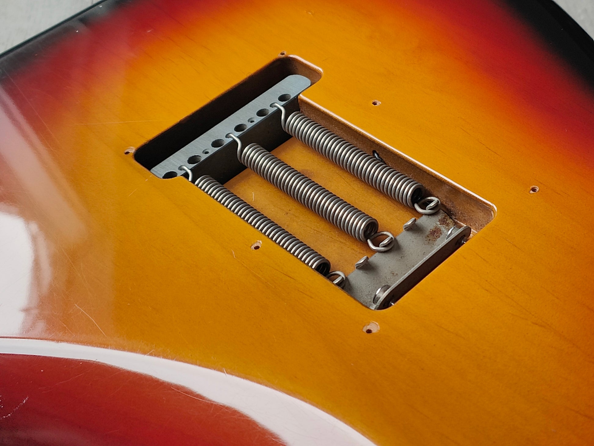 Beautiful two-piece ash body with a three-tone Sunburst poly finish bolted to a 50's style maple neck (7.25" radius, jumbo frets, slight soft V profile), it weighs 3.7kg's. Loaded with a set of Van Zandt alnico pickups and some custom wiring, it's got a steel trem block and some modern Japanese locking tuners.