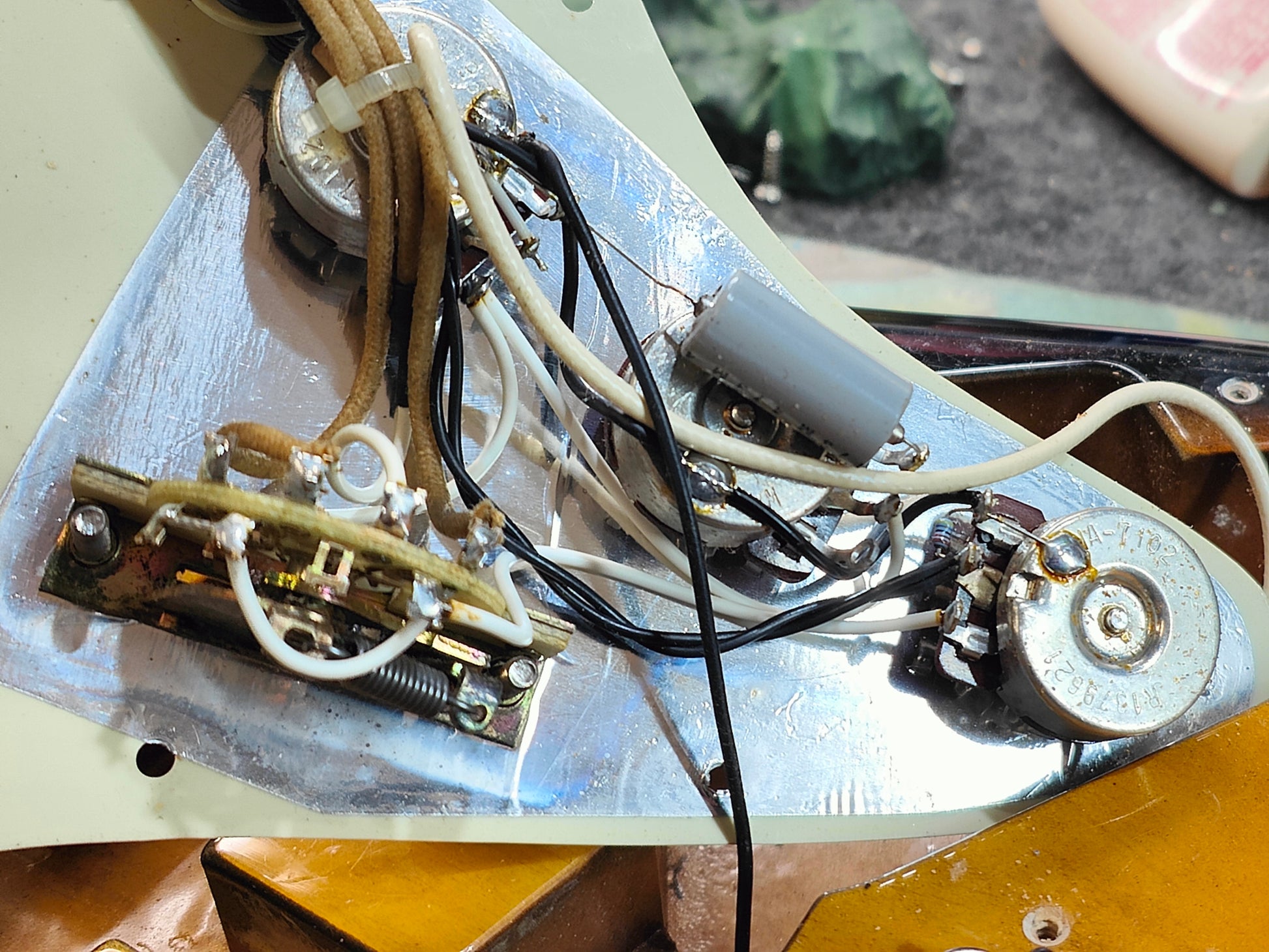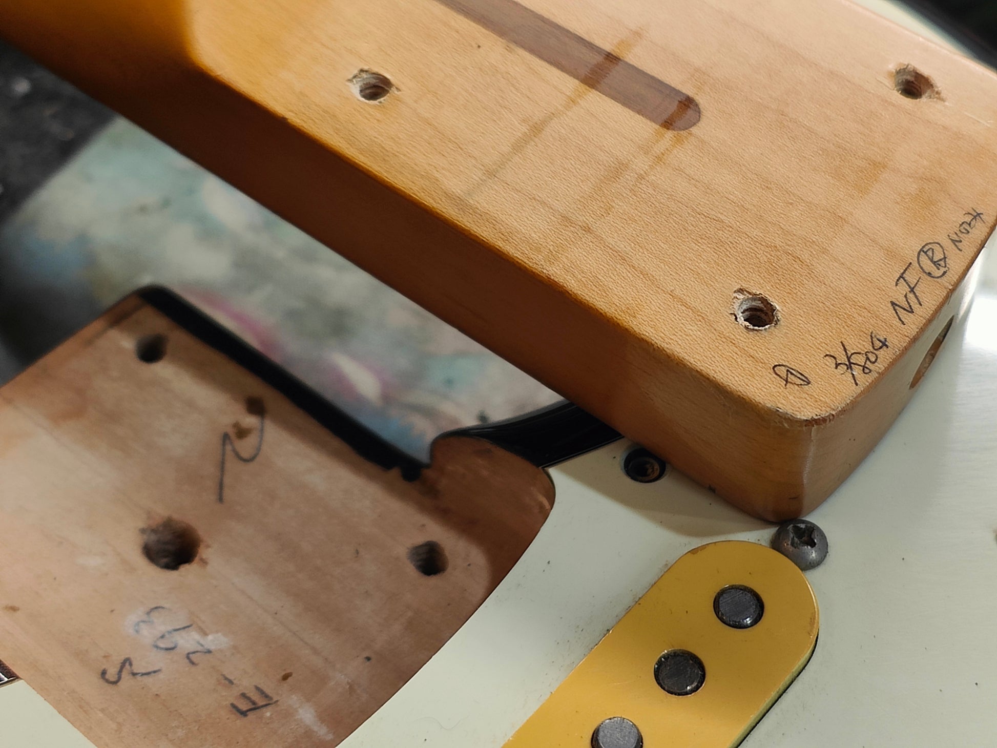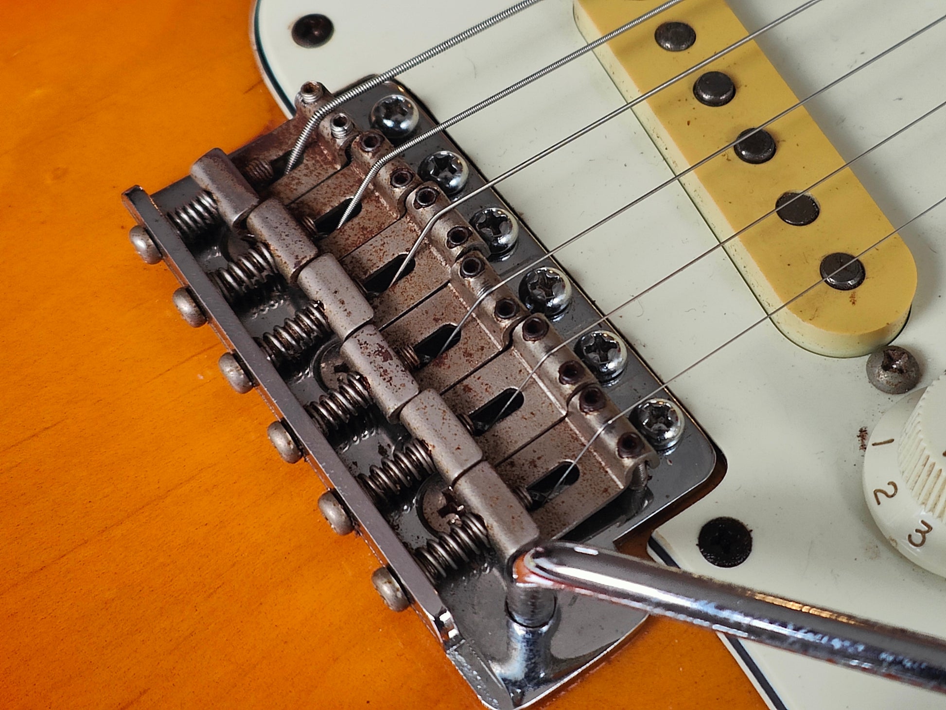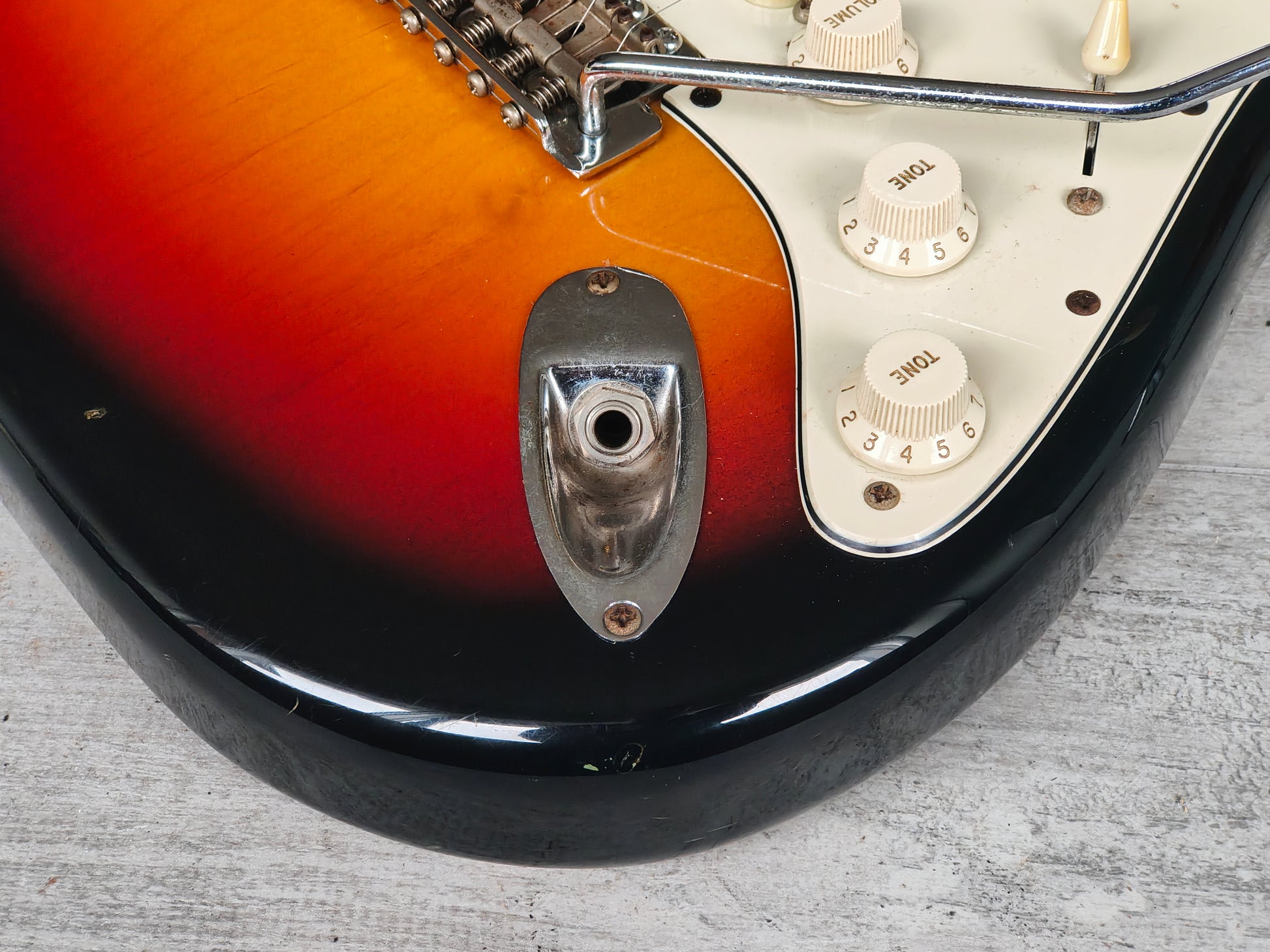 Beautiful two-piece ash body with a three-tone Sunburst poly finish bolted to a 50's style maple neck (7.25" radius, jumbo frets, slight soft V profile), it weighs 3.7kg's. Loaded with a set of Van Zandt alnico pickups and some custom wiring, it's got a steel trem block and some modern Japanese locking tuners.