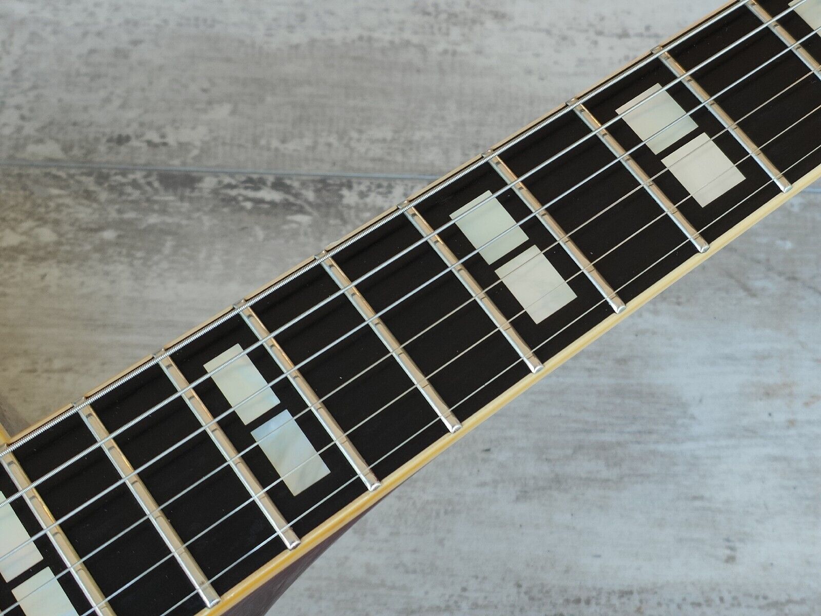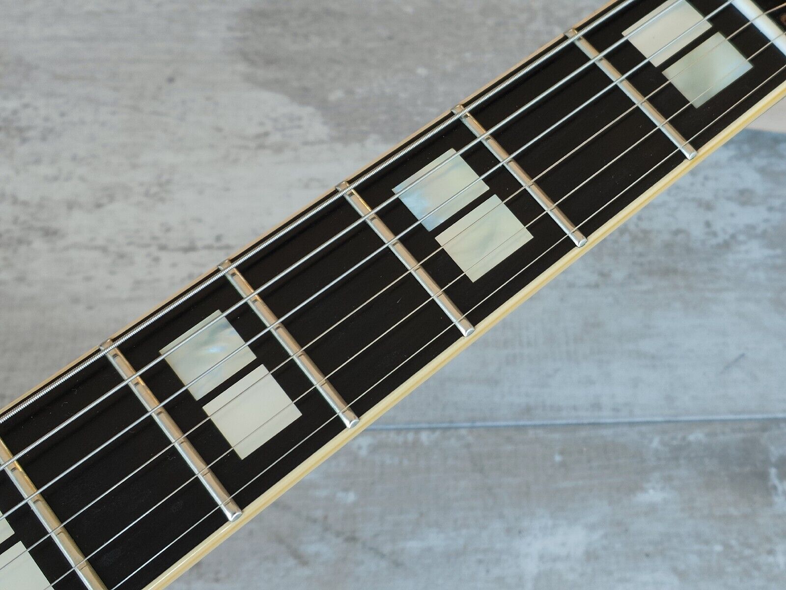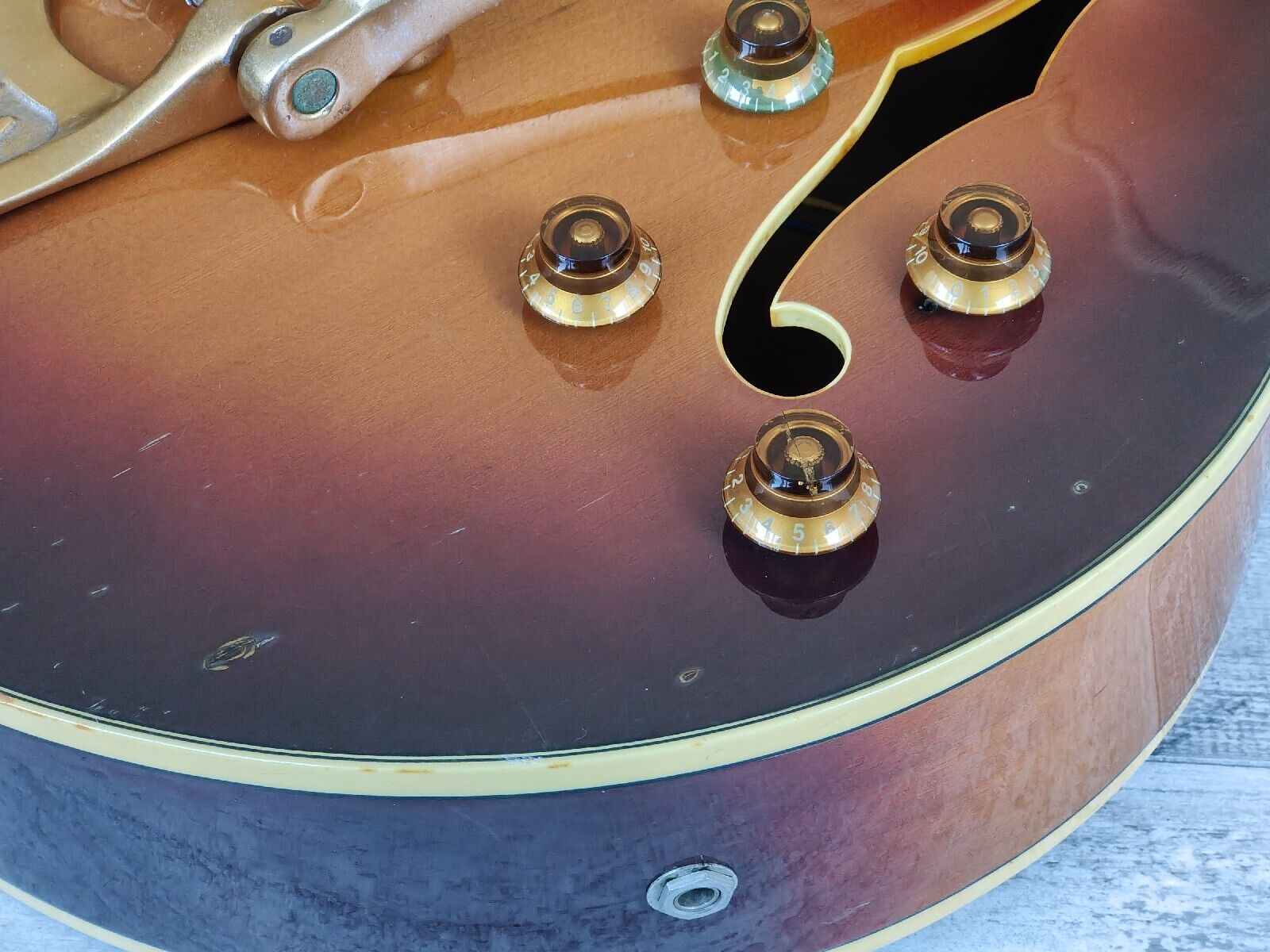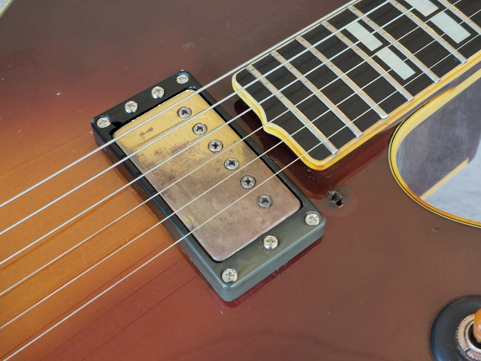 Japanese made in 1980, the AE-1200 was a high end Jazz sized hollowbody from Yamaha. Bound beech top/back with a laminate spruce top, slim C profile mahogany neck and a bound 20 fret ebony fingerboard (12" radius, 628mm scale length), it weighs 3.5kg's. Loaded with the original pots and Yamaha branded pickups (both with coil splits on push-pull tone pots), this one has two new tone capacitors installed as the originals had dried up. Features aftermarket Grover tuners (except for one Yamaha branded tuner) along with an aftermarket painted gold Bigsby and some replacement knobs.