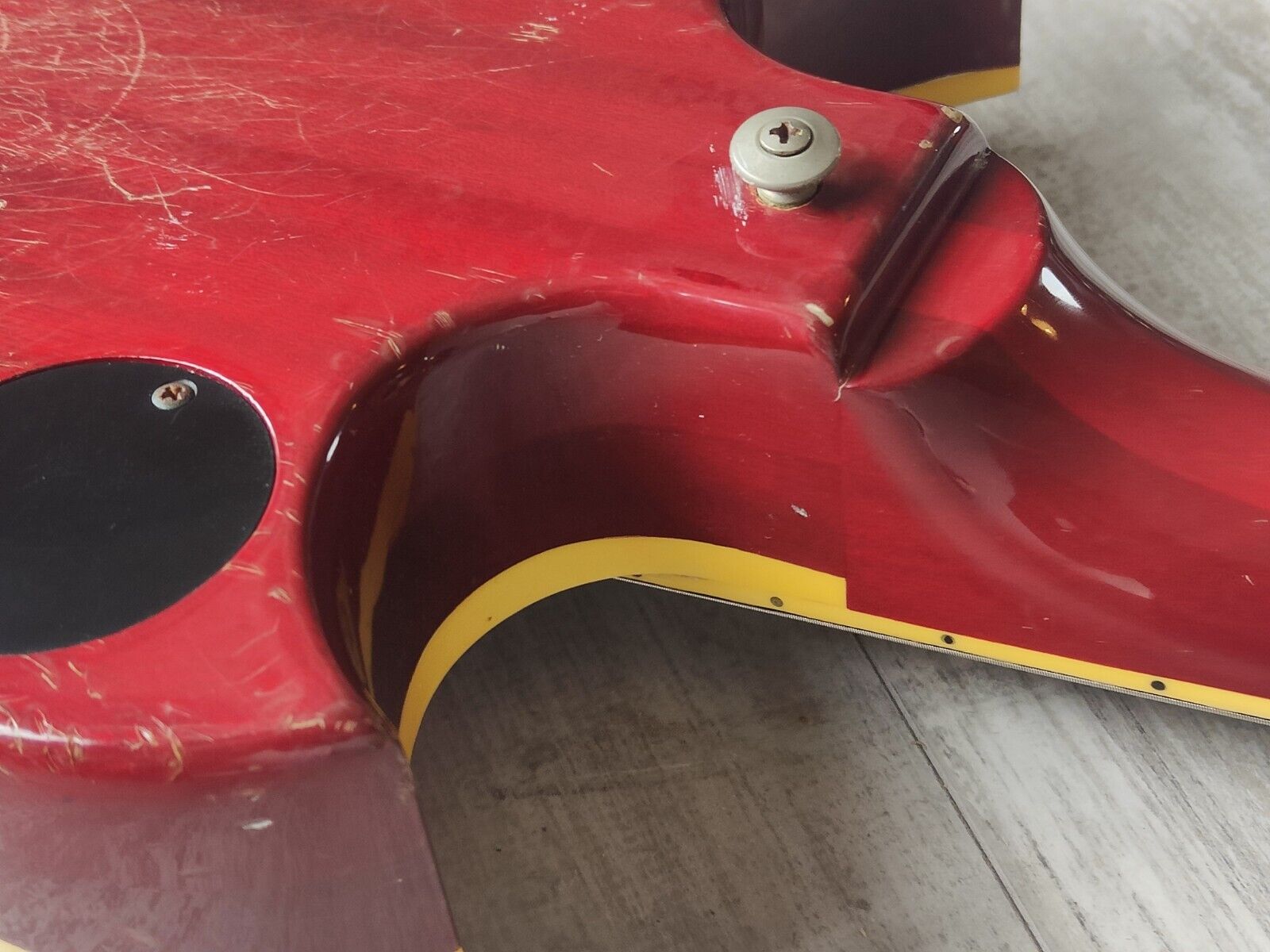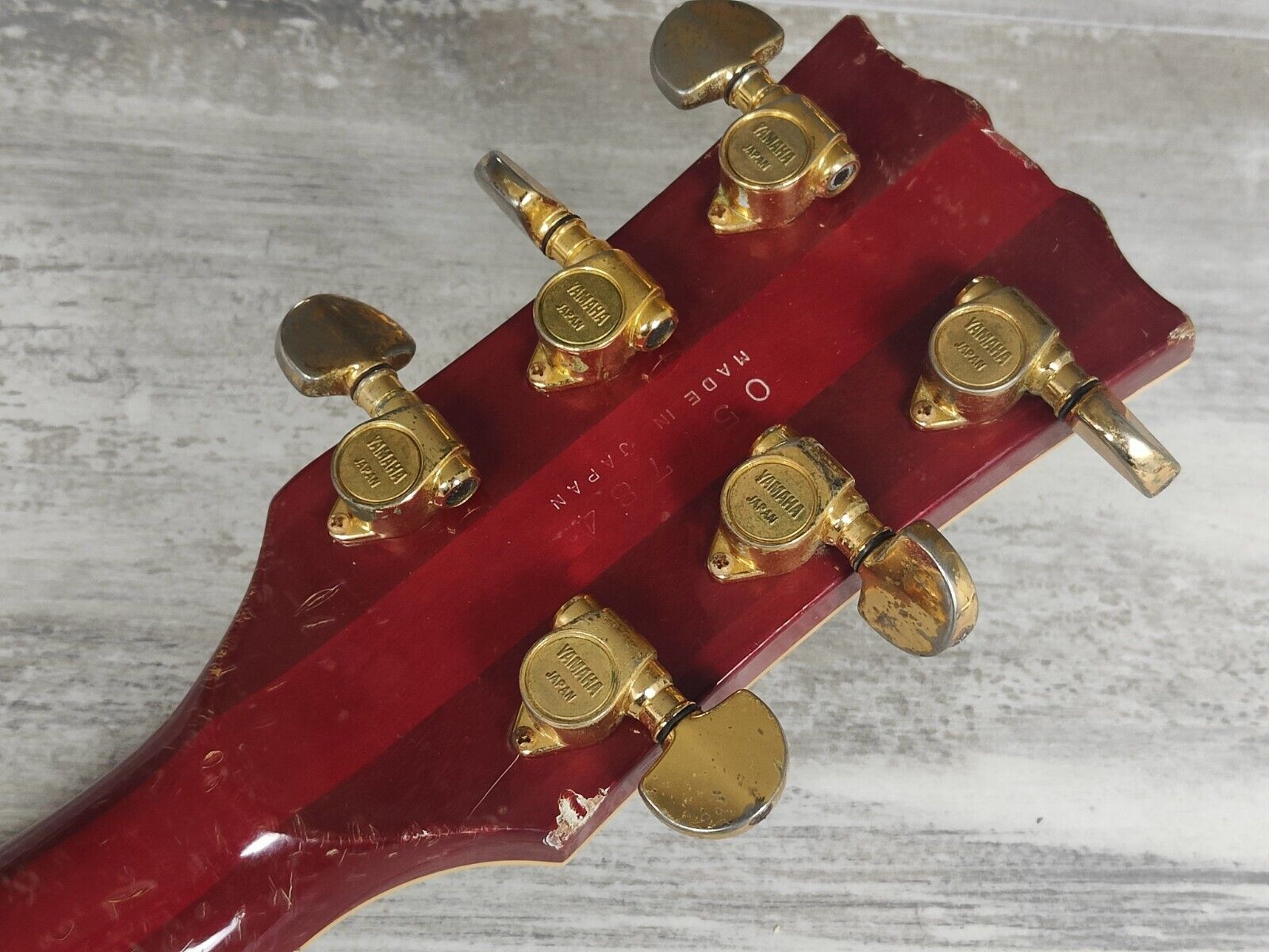 Loaded with the original Yamaha tailpiece and tuners with an aftermarket tune-o-matic bridge, this one has the original SGH-1SOB pickups with the push/push coil split switches on the tone knobs.